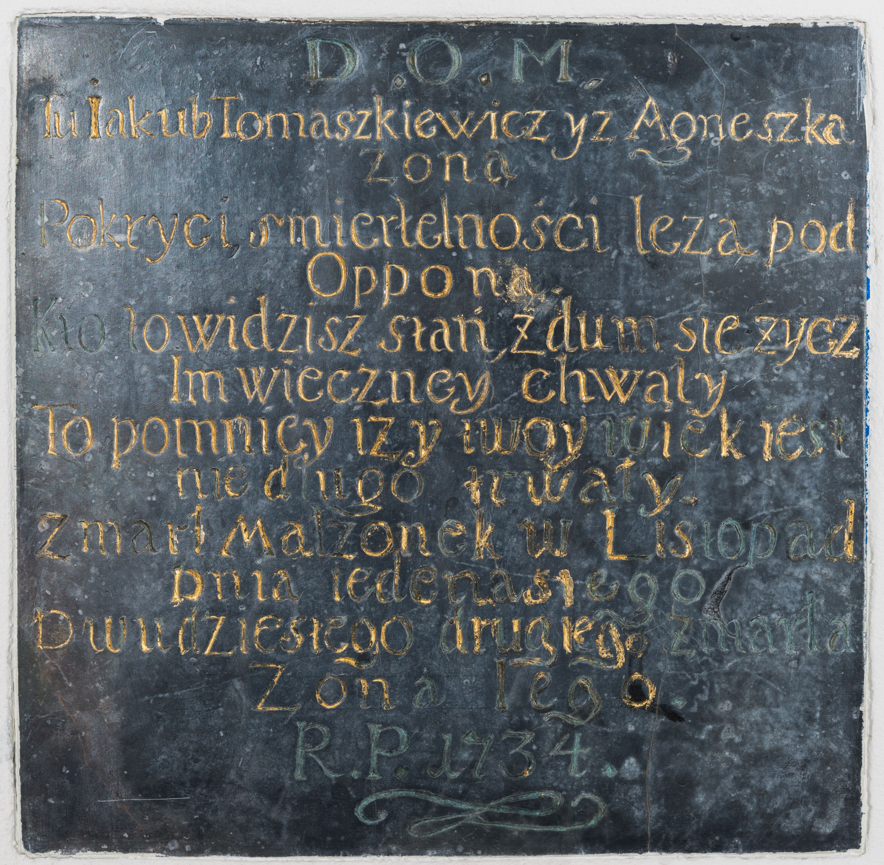 Epitafium w formie kamiennej tablicy z napisem „D(EO) O(PTIMO) M(AXIMO) / Tu Iakub Tomaszkiewicz yz Agnieszka / żoną / Pokryci, śmiertelności leżą pod / Opponą / Kto to widzisz stań, zdum się życz / Im wieczney chwały / To pomniey iży twoy wiek iest / nie długo trwały. / Zmarł Małżonek w Listopad(zie) / dnia iedenastego / Dwudziestego drugiego zmarła / Żona Iego / R(oku) P(ańskiego) 1734.”