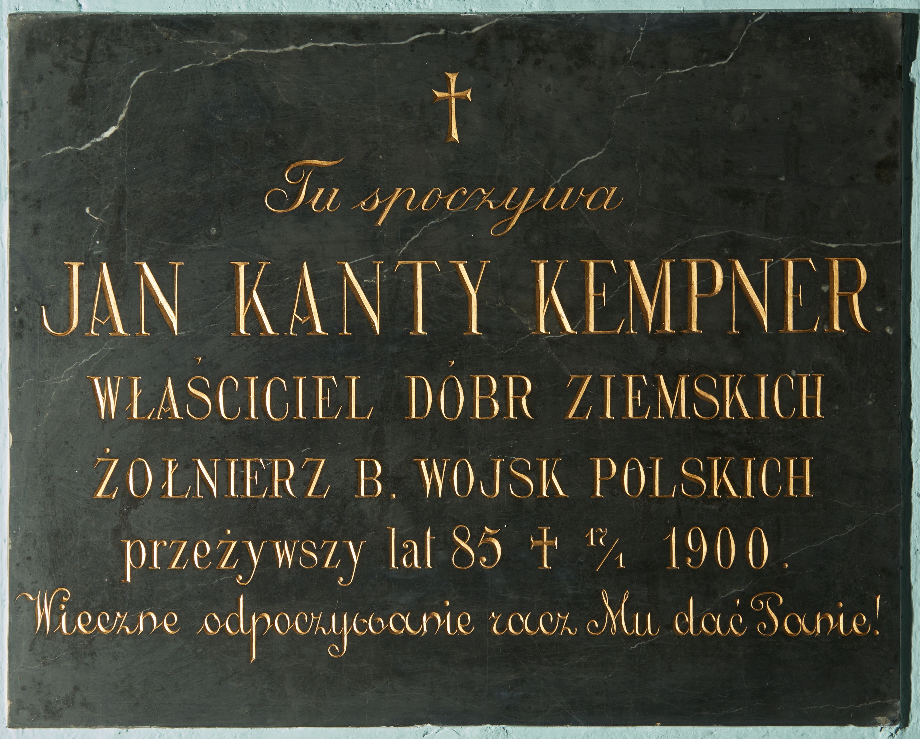 Płyta w formie leżącego prostokąta. W jej polu złocona inskrypcja: „Tu spoczywa / JAN KANTY KEMPNER / WŁAŚCICIEL DÓBR ZIEMSKICH / ŻOŁNIERZ B. WOJSK POLSKICH / przeżywszy lat 85 +17/I 1900. Wieczne odpoczywanie racz Mu dać Panie!”