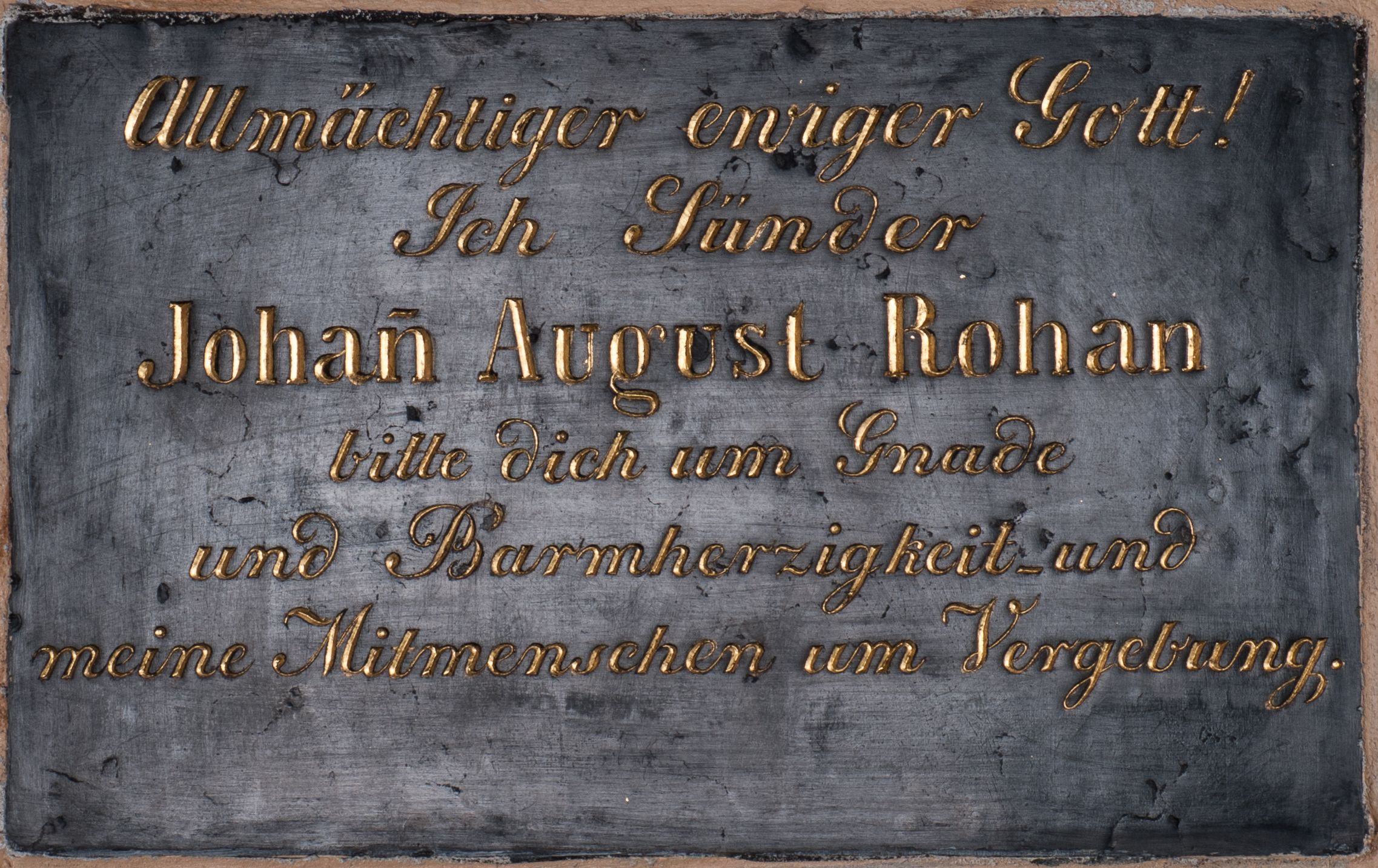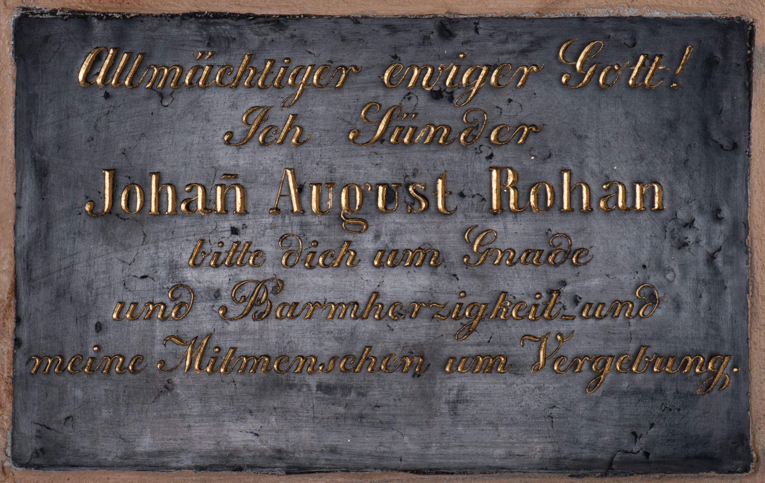Tablica epitafijna z marmuru dębnickiego w kształcie leżącego prostokąta z inskrypcją „Allmächtiger ewiger Gott! / Ich Sünder / Johan August Rohan / bitte dich um Gnade / und Barmherzigkeit_und / meine Mitmenschen um Vergebung”.