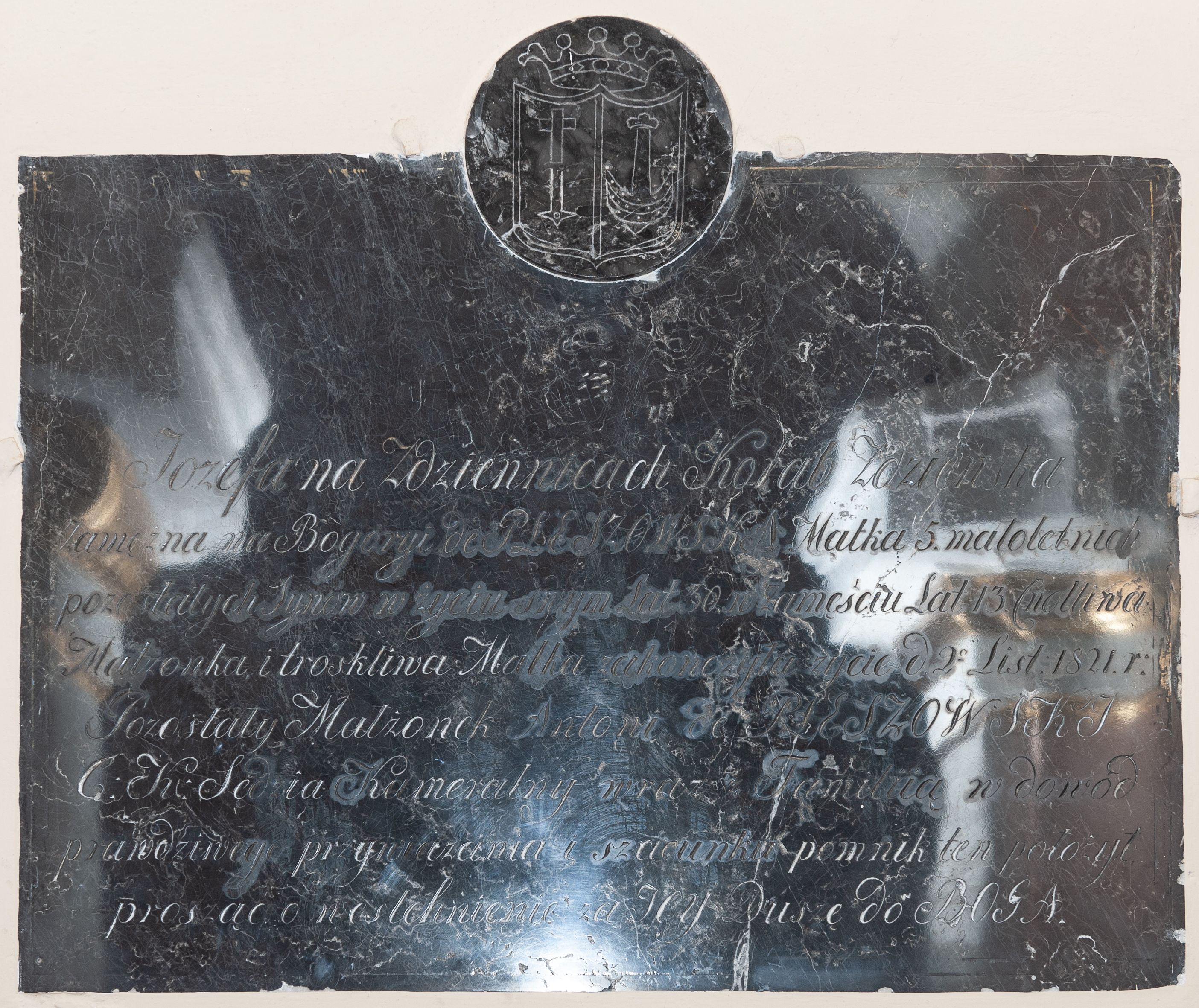 Tablica w kształcie leżącego prostokąta, zwieńczona medalionem, w którym znajduje się tarcza herbowa, dzielona w słup z dwoma godłami: po prawej błędnie odkute godło herbu Bogoria (przekrzyżowana rogacina na wspak), po lewej godło herbu Korab, nad tarczą korona otwarta. W polu inskrypcja „Józefa na Zdziennicach Korab Zdzieńska / Zamężna na Bogoryi de PLESZOWSKA Matka 5. małoletnich / pozostałych Synów w życiu swym Lat 30. w Zamęściu Lat 13. Cnotliwa / Małżonka i troskliwa Matka zakończyła życie d(nia) 2 List(opada) 1821 r(oku) / Pozostały Małżonek Antoni de PLESZOWSKI / C(esarski) [i] K(rólewski) Sędzia Kameralny wraz z Familią w dowód / prawdziwego przywiązania i szacunku pomnik ten położył / prosząc o westchnienie za Jey Duszę do BOGA.”