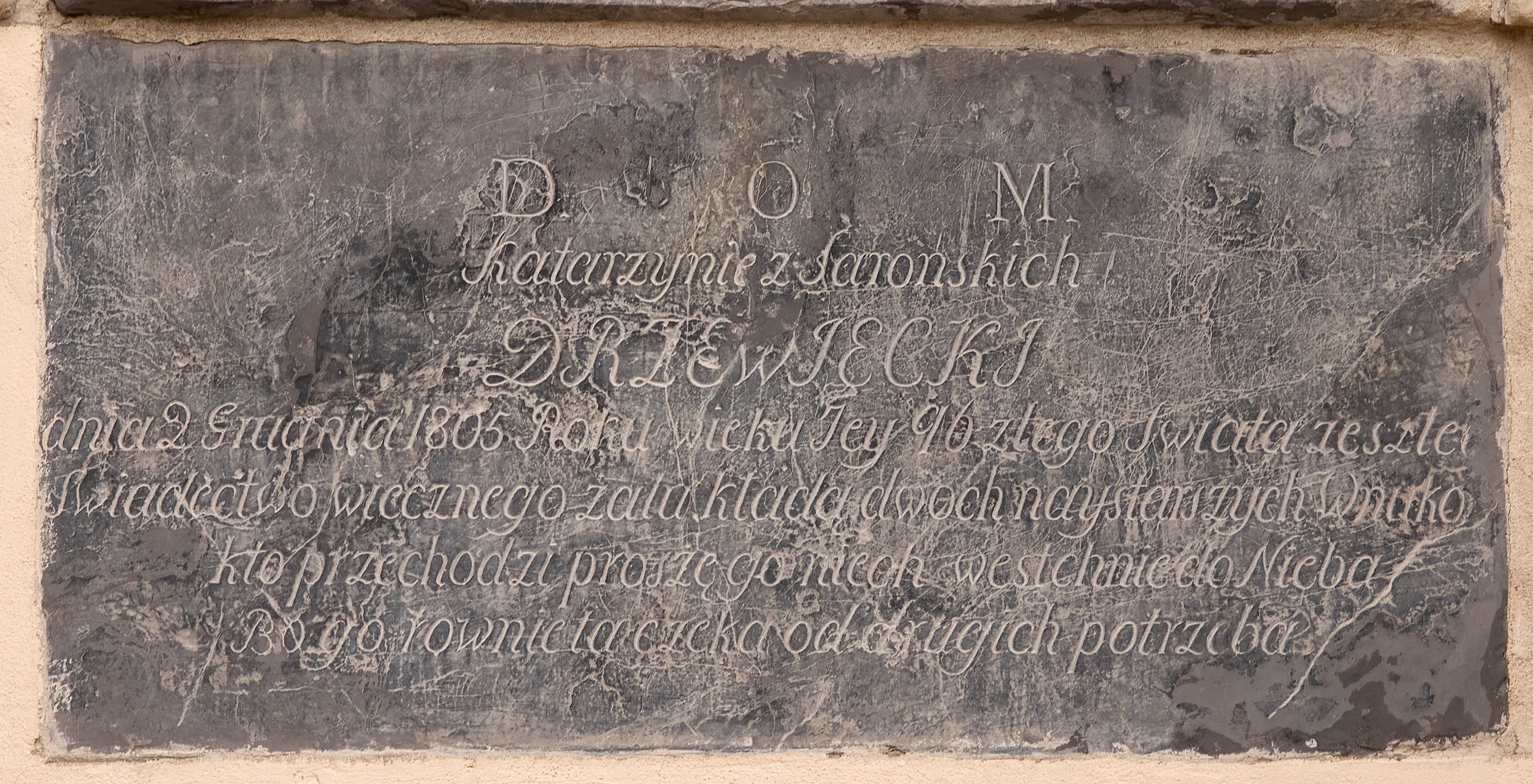 „D(eo) O(ptimo) M(aximo) / Katarzynie z Sarońskich / DRZEWIECKI / dnia 2 Grudnia 1805 Roku wieku Iey 96 z tego Światu zeszła / Świadectwo wiecznego żalu kładą dwoch naystarszych Wnuko / kto przechodzi proszę go niech westchnie do Nieba / Bo go rownie ta czeka od drugich potrzeba”.