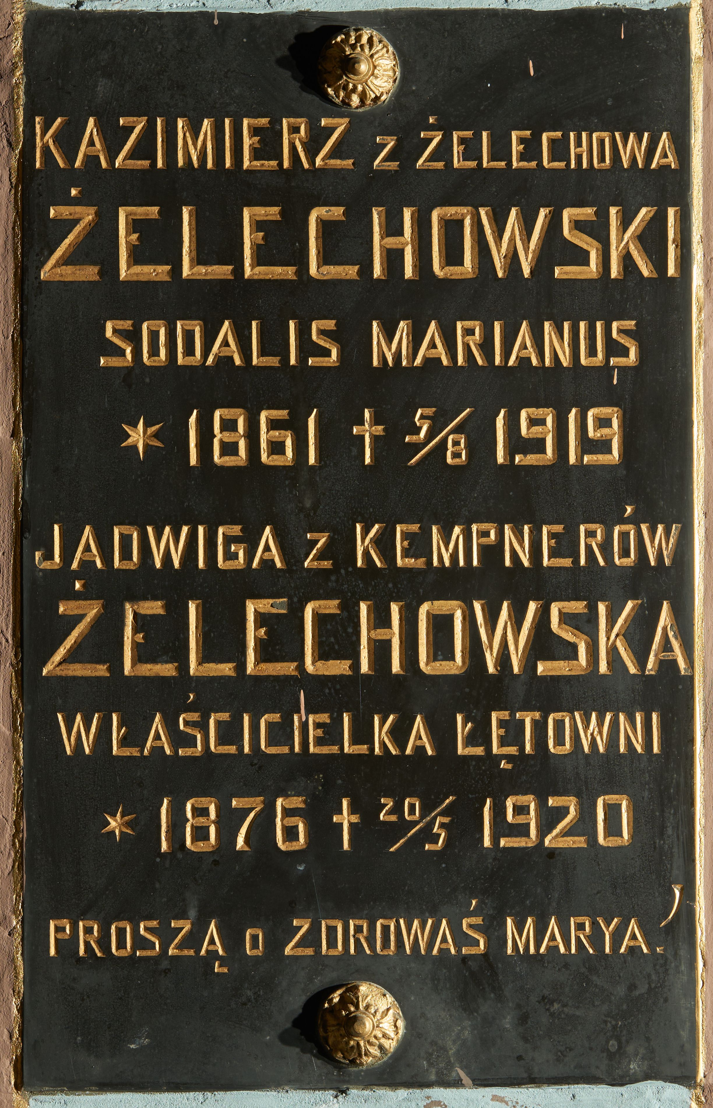 Płyta w formie wydłużonego stojącego prostokąta. Przymocowana do ściany dwiema ślubami o dekoracyjnych łbach w formie rozet, zamocowanymi przy krótszych bokach. W polu złocona inskrypcja: „KAZIMIERZ Z ŻELECHOWA / ŻELECHOWSKI / SODALIS MARIANUS / *1861 + 5/8 1919 / JADWIGA Z KEMPNERÓW /ŻELECHOWSKA / WŁAŚCICIELKA ŁĘTOWNI / *1876 + 20/5 1920 / PROSZĄ o ZDROWAŚ MARYA!”.