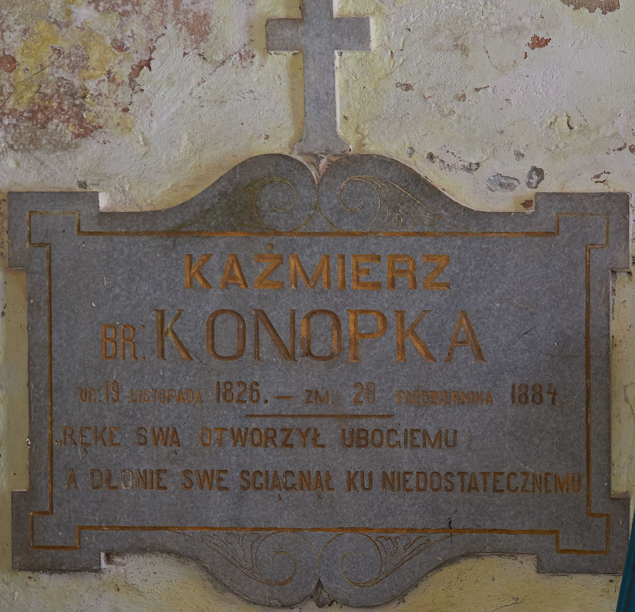 Epitafium w formie leżącego prostokąta, z uszakami, ujęte od góry i dołu wolutami, zwieńczone prostym krzyżem. W polu inskrypcja „KAŻMIERZ / BR: KONOPKA / UR(ODZONY) 19 LISTOPADA 1826. – ZM(ARŁY) 28 PAŹDZIERNIKA 1884. / RĘKE SWĄ OTWORZYŁ UBOGIEMU / A DŁONIE SWE ŚCIĄGNĄŁ KU NIEDOSTATECZNEMU”.