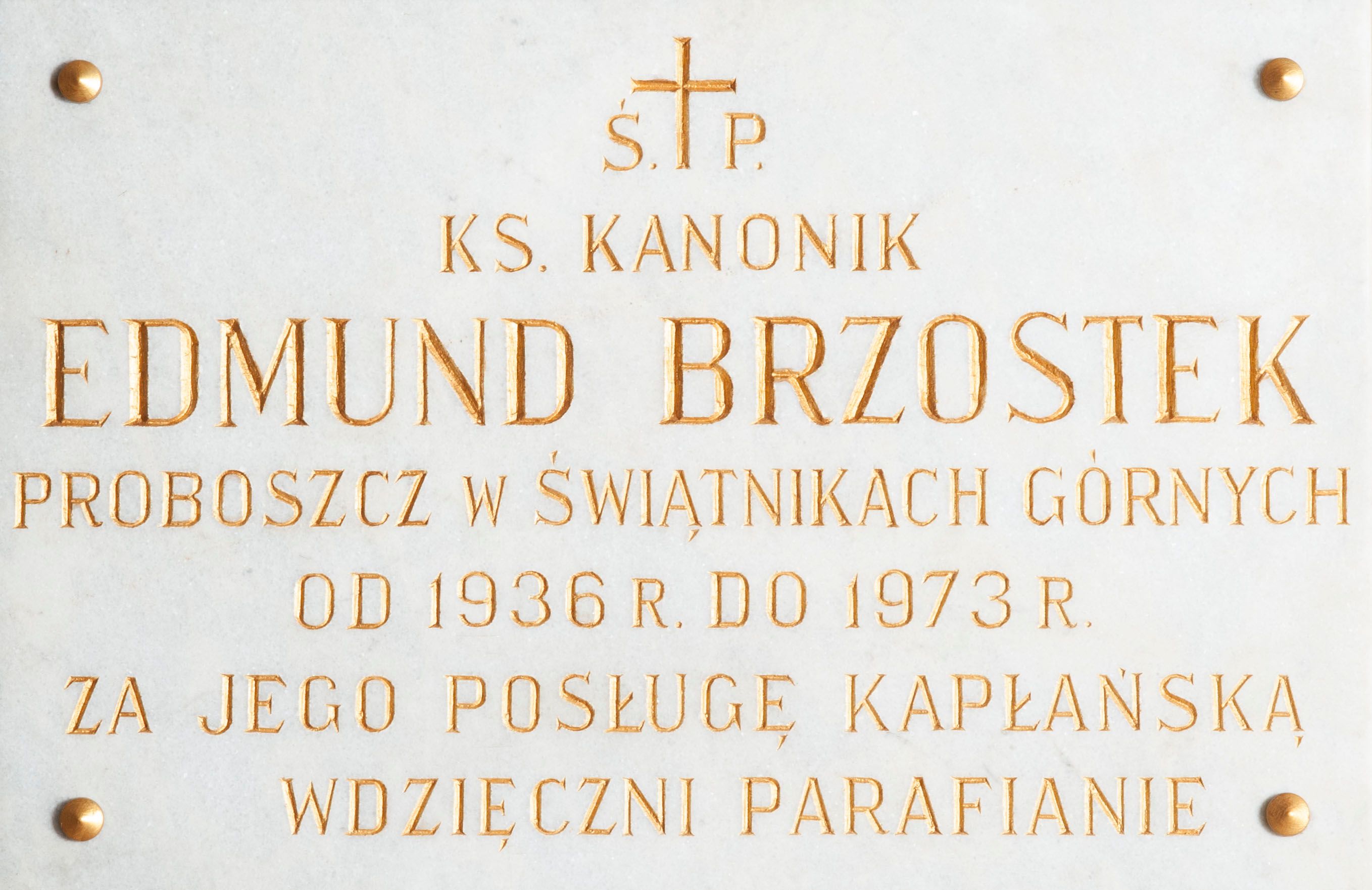 Wmurowana w ścianę kościoła tablica epitafijna w formie leżącego prostokąta z okrągłymi główkami śrub w narożach. Na środku tablicy widnieje złocona inskrypcja „Ś(WIĘTEJ) P(AMIĘCI) / KS(IĄDZ) KANONIK / EDMUND BRZOSTEK / PROBOSZCZ W ŚWIĄTNIKACH GÓRNYCH / OD 1936 R(OKU) DO 1973 R(OKU) / ZA JEGO POSŁUGĘ KAPŁAŃSKĄ / WDZIĘCZNI PARAFIANIE”.