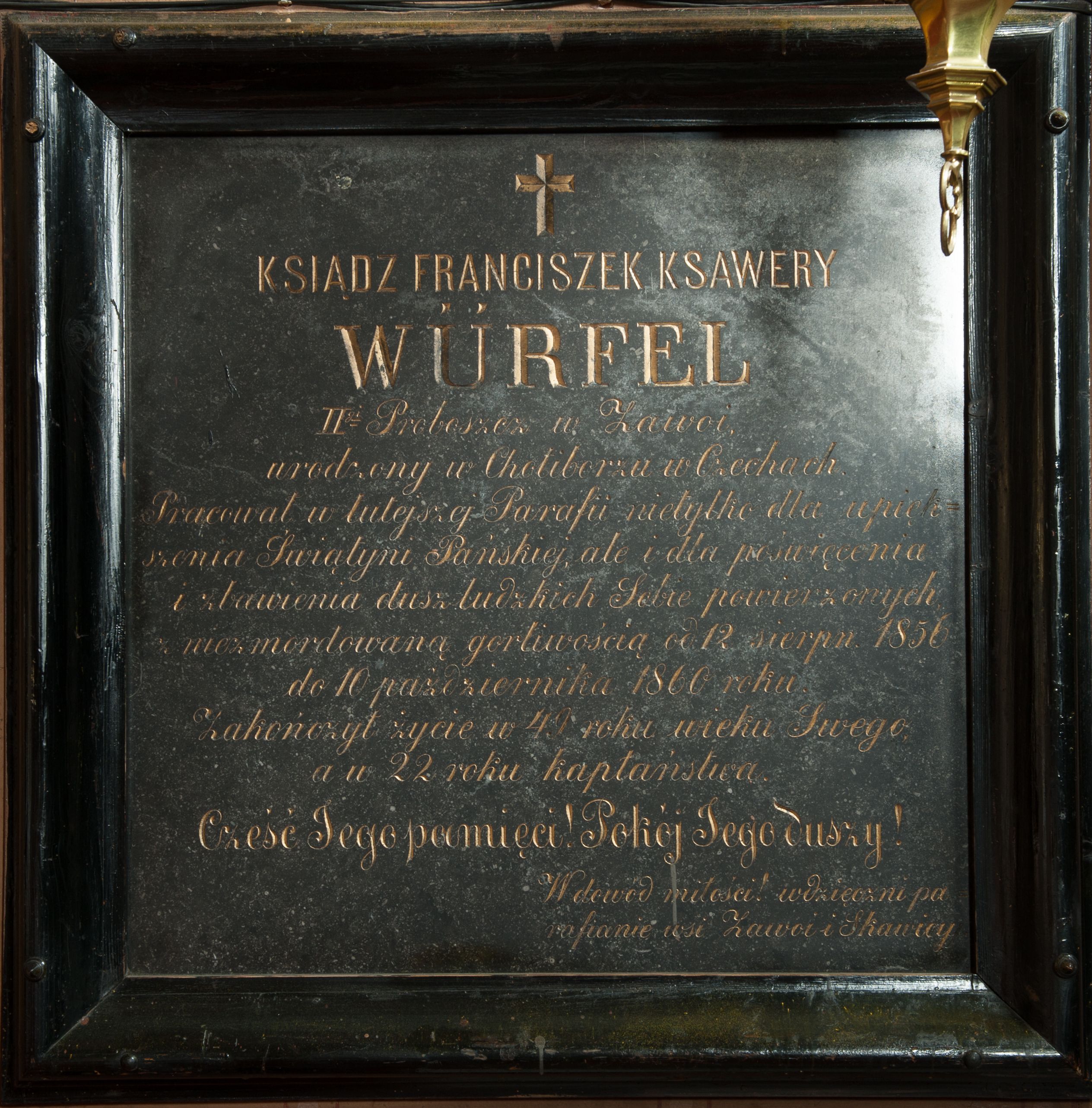 Płyta kamienna w formie kwadratu, ujęta drewnianą, profilowaną ramą. W polu złocona inskrypcja „KSIĄDZ FRANCISZEK KSAWERY / WÜRFEL / IIgi Proboszcz w Zawoi, / urodzony w Choliborzu w Czechach. / Pracował w tutejszej Parafii nietylko dla upięk/szenia Świątyni Pańskiej, ale i dla poświęcenia / i zbawienia dusz ludzkich Sobie powierzonych, / niezmordowaną gorliwością od 12 sierpn(ia) 1856 / do 10 października 1860 roku. / Zakończył życie w 49 roku wieku Swego, / a w 22 roku kapłaństwa. / Cześć Jego pamięci! Pokój Jego duszy! / W dowód miłości! / wdzięczni pa/rafianie wsi Zawoi i Skawicy.” Nad inskrypcją ryty krzyż łaciński.