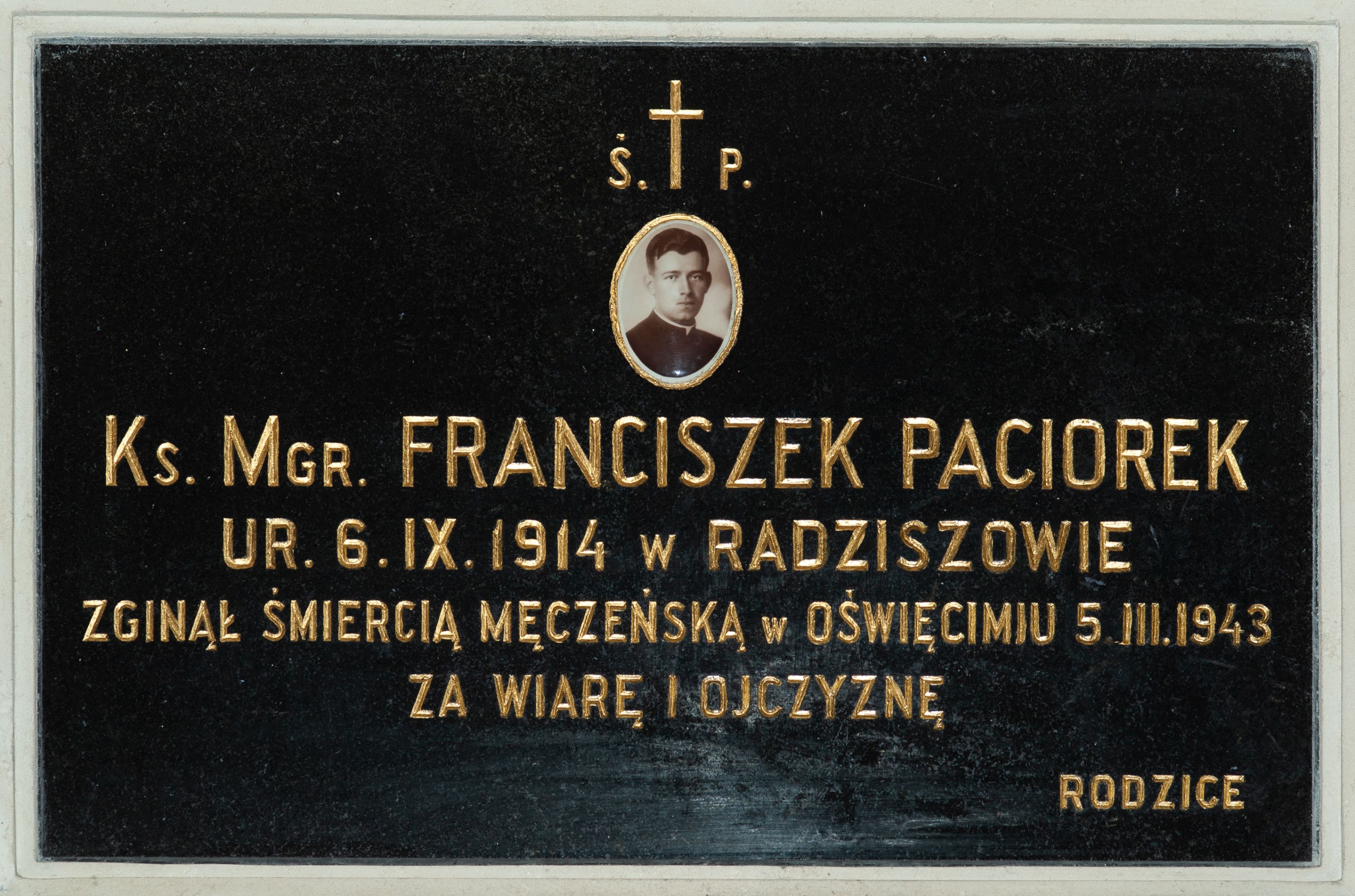 Epitafium w kształcie leżącego prostokąta wykonane z czarnego marmuru z rytym złoconym napisem ujęte profilowaną, białą ramą. U góry krzyż łaciński między literami Ś(WIĘTEJ) P(AMIĘCI), poniżej którego owalny medalion z czarno-białą fotografią zmarłego, w złotek ramce. Poniżej inskrypcja „Ks(iądz) M(a)g(iste)r FRANCISZEK PACIOREK / UR(ODZONY) 6. IX. 1914 w RADZISZOWIE / ZGINĄŁ ŚMIERCIĄ MĘCZEŃSKĄ w OŚWIĘCIMIU 5. III. 1943 / ZA WIARĘ I OJCZYZNĘ / RODZICE”.