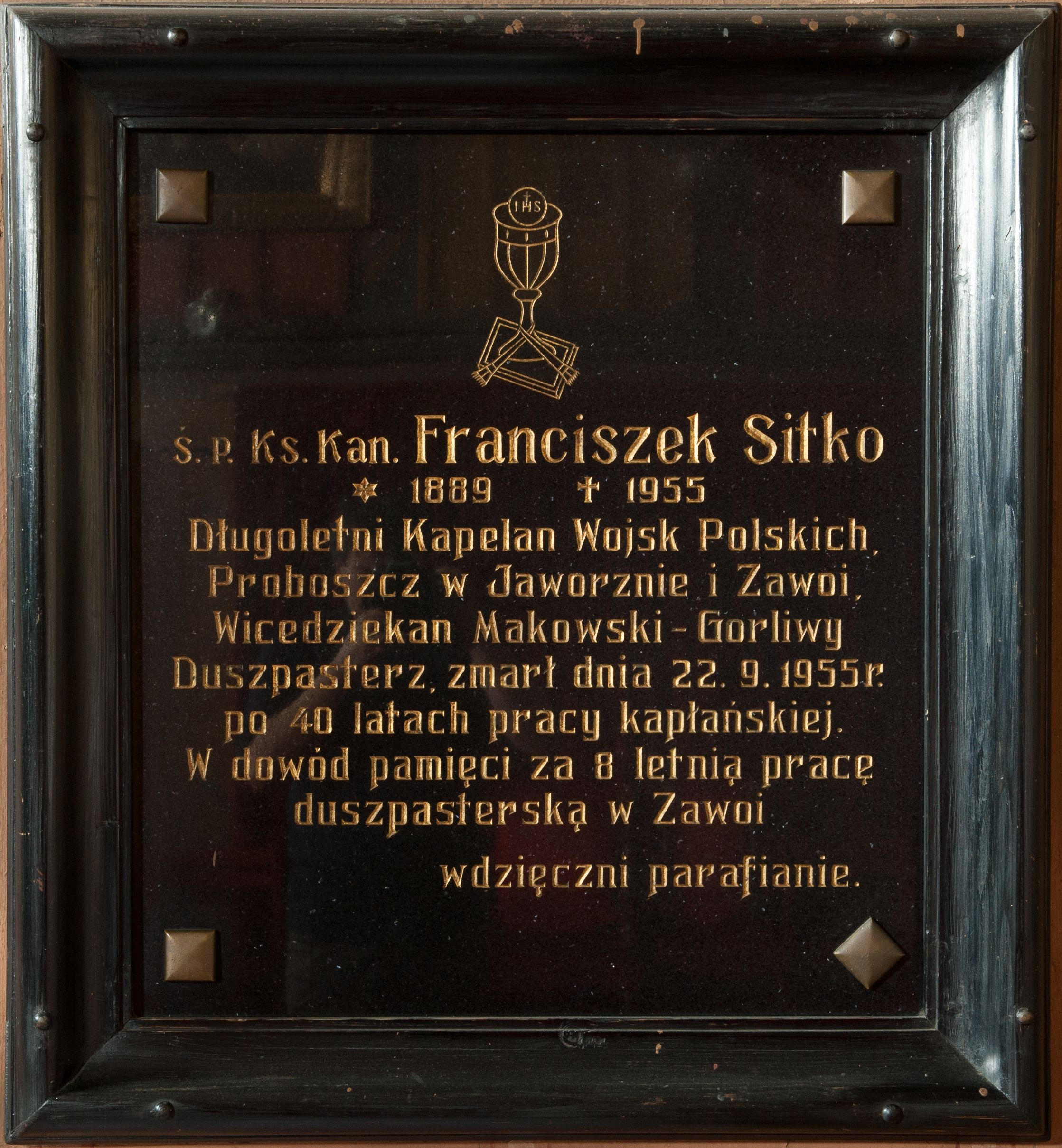 Płyta kamienna w kształcie prostokąta zbliżonego do kwadratu, zamontowana za pomocą czterech kwadratowych śrub w narożach, ujęta drewnianą, profilowaną ramą, pomalowaną na czarno. W polu złocona inskrypcja: „Ś(więtej) P(amięci) Ks(iądz) Kan(onik) Franciszek Sitko / * 1889 + 1955 / Długoletni Kapelan Wojsk Polskich, / Proboszcz w Jaworznie i Zawoi, / Wicedziekan Makowski – Gorliwy / Duszpasterz, zmarł dnia 22. 9. 1955 r(oku) / po 40 latach pracy kapłańskiej. / W dowód pamięci za 8 letnią pracę / duszpasterską w Zawoi / wdzięczni parafianie.” Nad inskrypcją ryte przedstawienie kielicha z hostią.