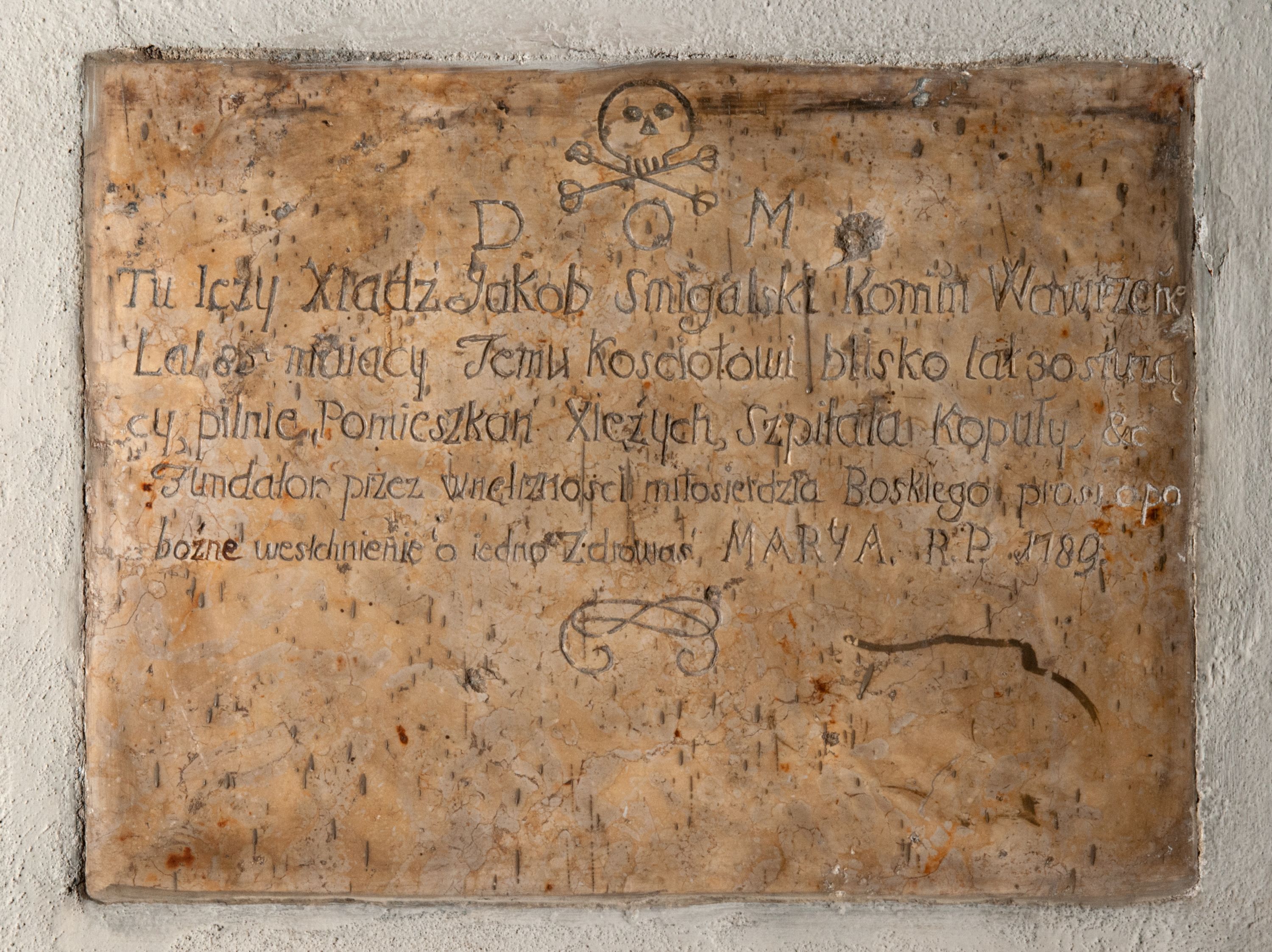 Tablica o kształcie leżącego prostokąta, na której w części górnej wyryto czaszkę powyżej skrzyżowanych piszczeli. Niżej umieszczono inskrypcję „D[eo] O[ptimo] M[aximo] / Tu lezy Xiądz Jakob Smigalski Komm(endarius) Wawrzene(censis) / Lat 85 maiący Temu kościołowi blisko lat 30 służą/cy, pilnie, Pomieszkań Xiężych, Szpitala kopuły, etc / Fundator przez wnętrznosci miłosierdzia Boskiego prosi o po/bożne westchnienie i o iedno Zdrowaś MARYA. R(oku) P(ańskiego) 1789”. Dołem inskrypcję zamyka fragment plecionki.