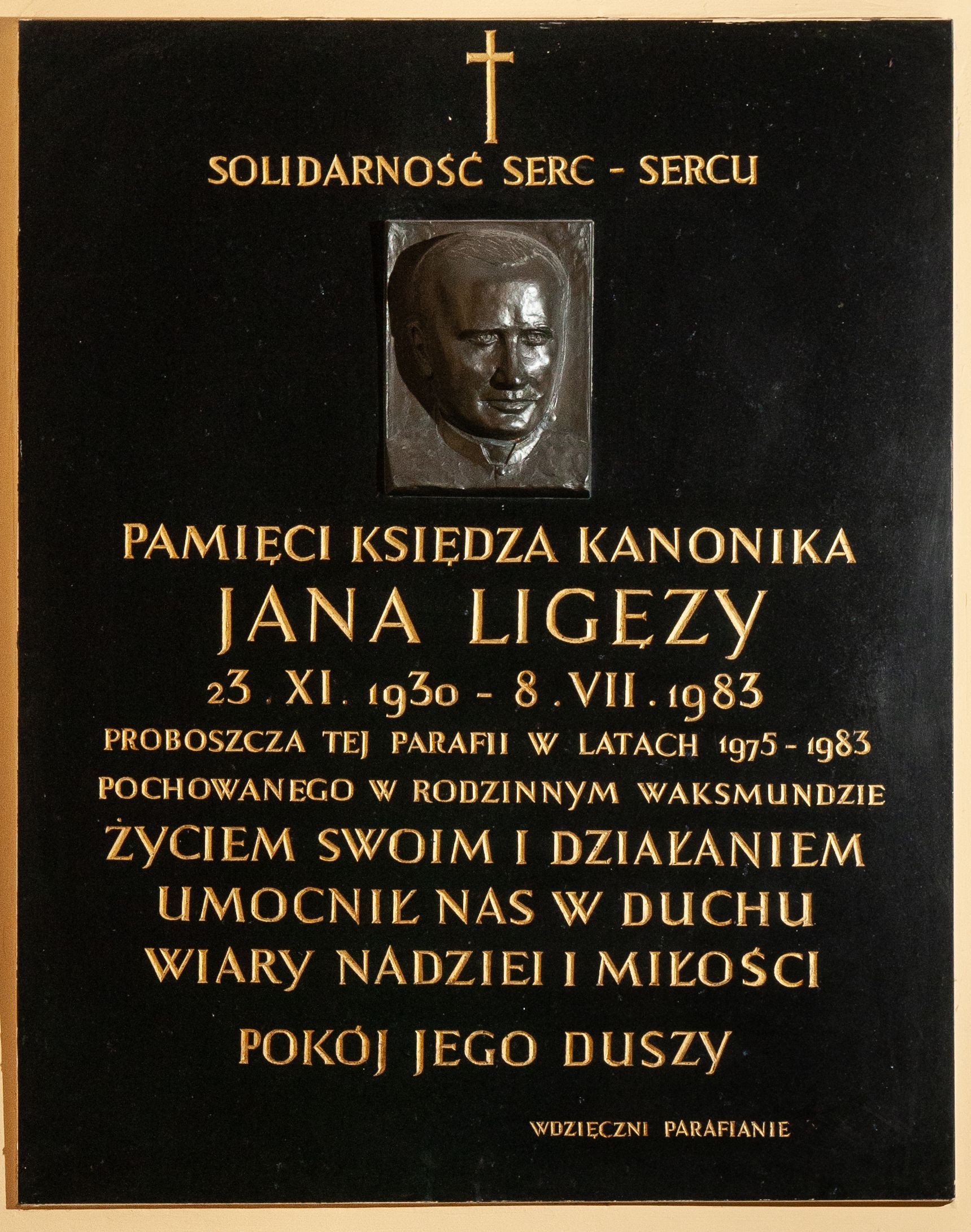 Epitafium w kształcie stojącego prostokąta wykonane z czarnego kamienia poświęcone pamięci księdza Jana Ligęzy. Na tablicy poniżej krzyża łacińskiego i napisu „SOLIDARNOŚĆ SERC – SERCU” płaskorzeźbiony portret zmarłego. Na owalnej twarzy z wysokim czołem odznaczają się małe oczy, wąski nos i wydatne usta, między nosem a ustami zaznaczona bruzda. Pod portretem dalsza część napisu „/ PAMIĘCI KSIĘDZA KANONIKA / JANA LIGĘZY / 23. IX. 1930 – 8. VII. 1983 / PROBOSZCZA TEJ PARAFII W LATACH 1975-1983 / POCHOWANEGO W RODZINNYM WAKSMUNDZIE / ŻYCIEM SWOIM I DZIAŁANIEM / UMOCNIŁ NAS W DUCHU / WIARY NADZIEI I MIŁOŚCI / POKÓJ JEGO DUSZY / WDZIĘCZNI PARAFIANIE”.