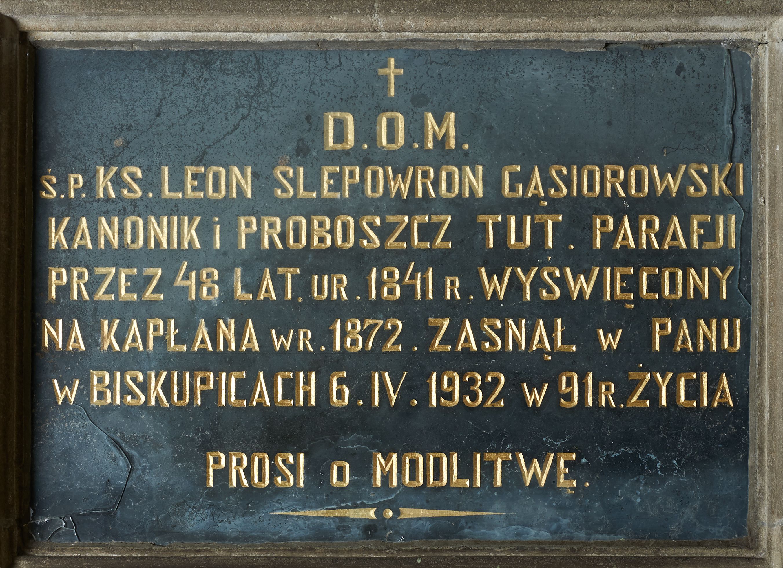 Epitafium w kształcie leżącego prostokąta w profilowanej kamiennej ramie. W polu inskrypcja „D(EO) O(PTIMO) M(AXIMO) / Ś(WIĘTEJ) P(AMIĘCI) KS(IĄDZ) LEON SLEPOWRON GĄSIOROWSKI / KANONIK i PROBOSZCZ TUT(EJSZEJ) PARAFJI / PRZEZ 48 LAT. UR(ODZONY) 1841 R(OKU) WYŚWIĘCONY / NA KAPŁANA W R(OKU) 1872. ZASNĄŁ W PANU / W BISKUPICACH 6. IV. 1932 W 91 R(OKU) ŻYCIA / PROSI O MODLITWĘ”.