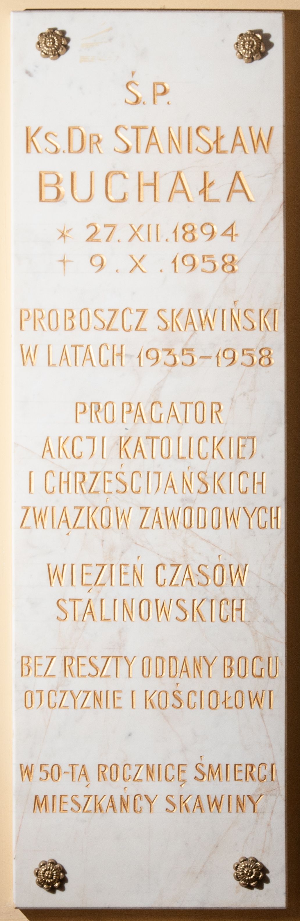 Tablica z jasnego kamienia w kształcie bardzo wydłużonego, stojącego prostokąta, z kutym, złoconym napisem „Ś(WIĘTEJ) P(AMIĘCI) / KS(IĄDZ) D[OKTO]R STANISŁAW / BUCHAŁA / *27. XII. 1894 / + 9. X. 1958 / PROBOSZCZ SKAWIŃSKI / W LATACH 1935-1958 / PROPAGATOR / AKCJI KATOLICKIEJ / I CHRZEŚCIJAŃSKICH / ZWIĄZKÓW ZAWODOWYCH / WIĘZIEŃ CZASÓW / STALINOWSKICH / BEZ RESZTY ODDANY BOGU / OJCZYZNIE I KOŚIOŁOWI / W 50-TĄ ROCZNICĘ ŚMIERCI / MIESZKAŃCY SKAWINY”. W narożach ozdobne rozetki maskują miejsca mocowania epitafium.