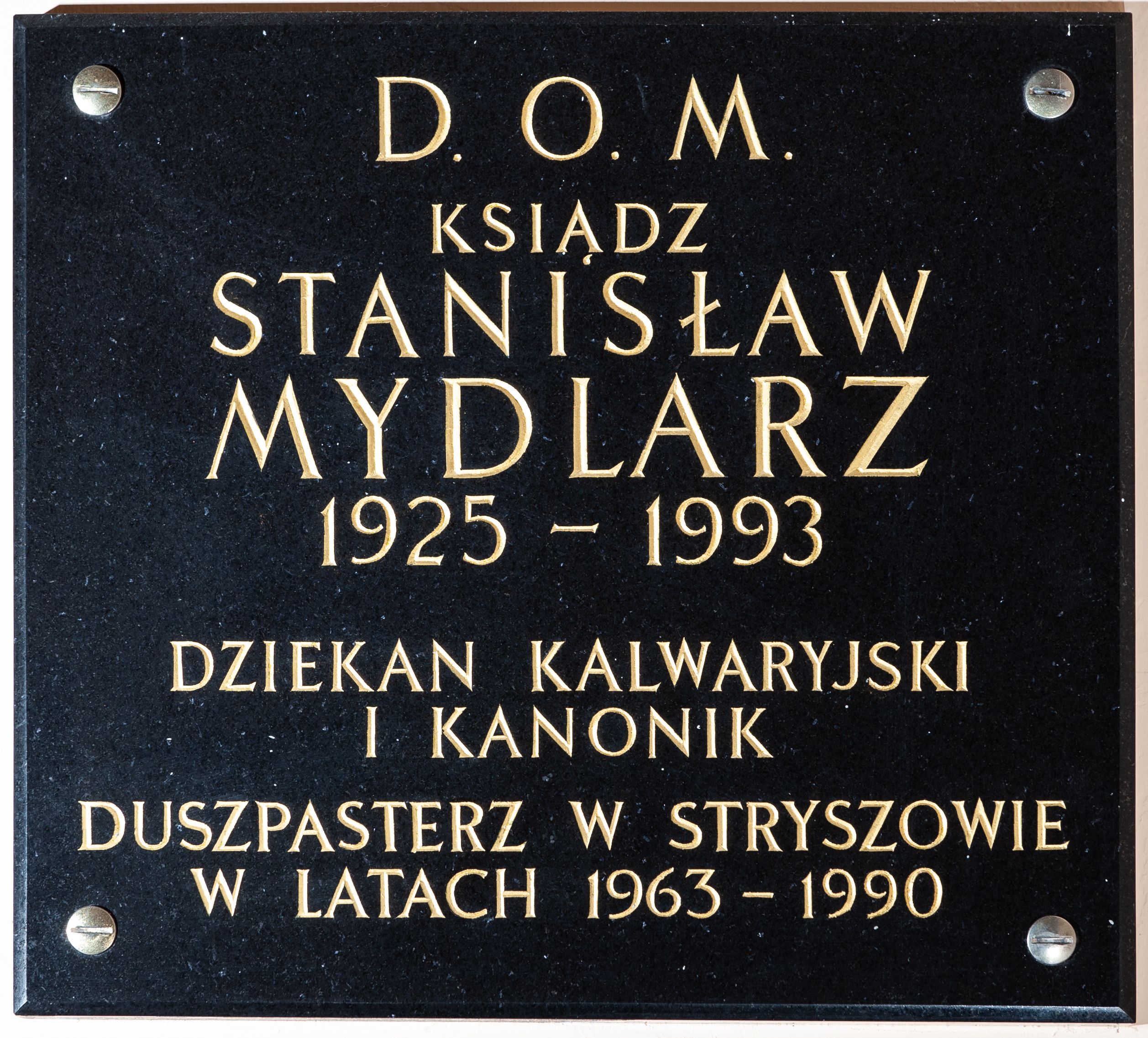 Epitafium granitowe w formie kwadratu, w narożach cztery metalowe śruby. W polu inskrypcja „D(EO) O(PTIMO) M(AXIMO) / KSIĄDZ / STANISŁAW / MYDLARZ / 1925 - 1993 / DZIEKAN KALWARYJSKI / I KANONIK / DUSZPASTERZ W STRYSZOWIE / W LATACH 1963 - 1990”.