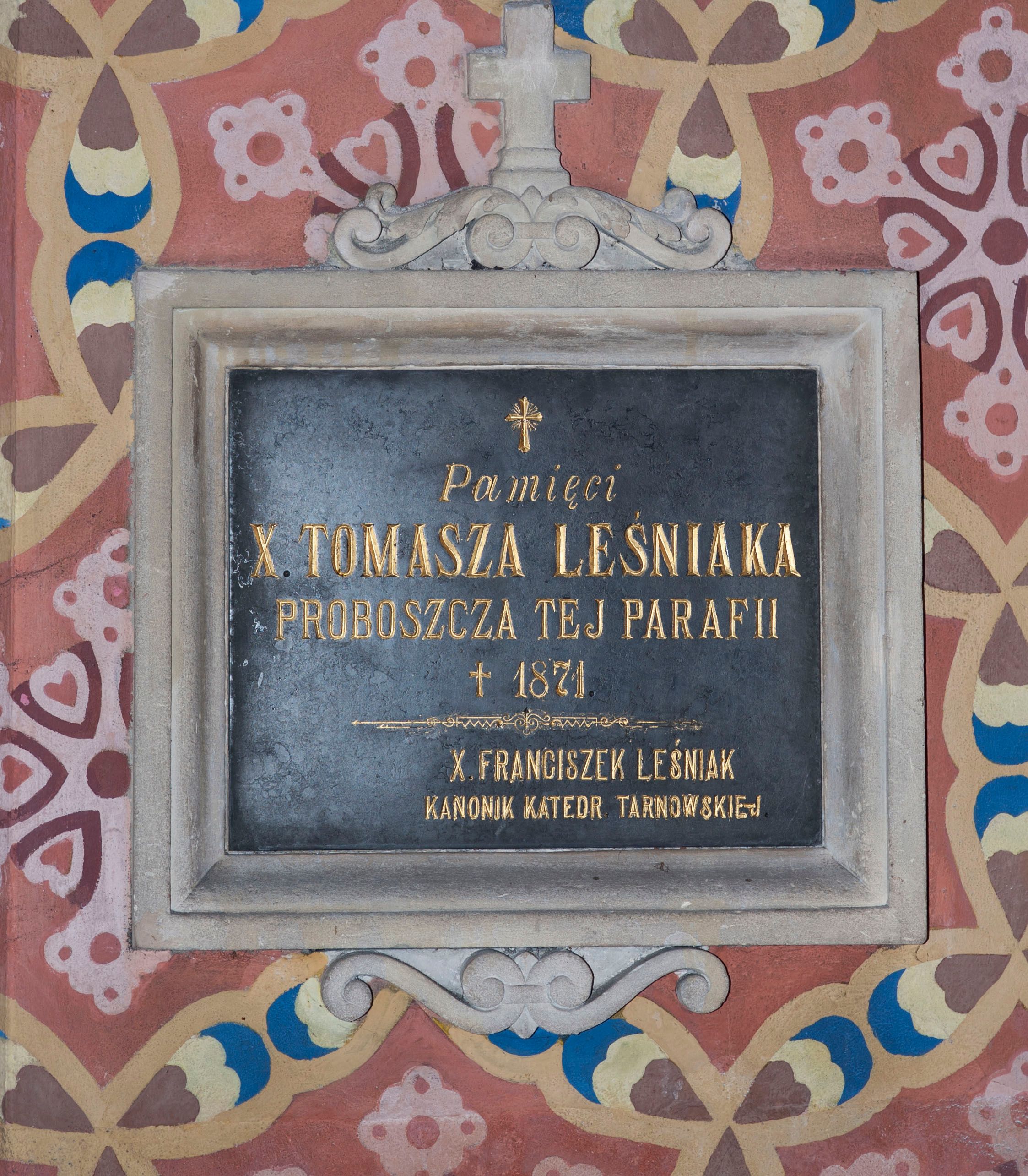 Tablica z czarnego marmuru w formie leżącego prostokąta, ujęta profilowaną ramą z piaskowca, zwieńczoną wolutowym szczytem z krzyżem. W polu inskrypcja „Pamięci / X(IĘDZA) TOMASZA LEŚNIAKA / PROBOSZCZA TEJ PARAFII / + 1871 / X(IĘDZA) FRANCISZEK LEŚNIAK / KANONIK KATEDR(Y) TARNOWSKIEJ”.
