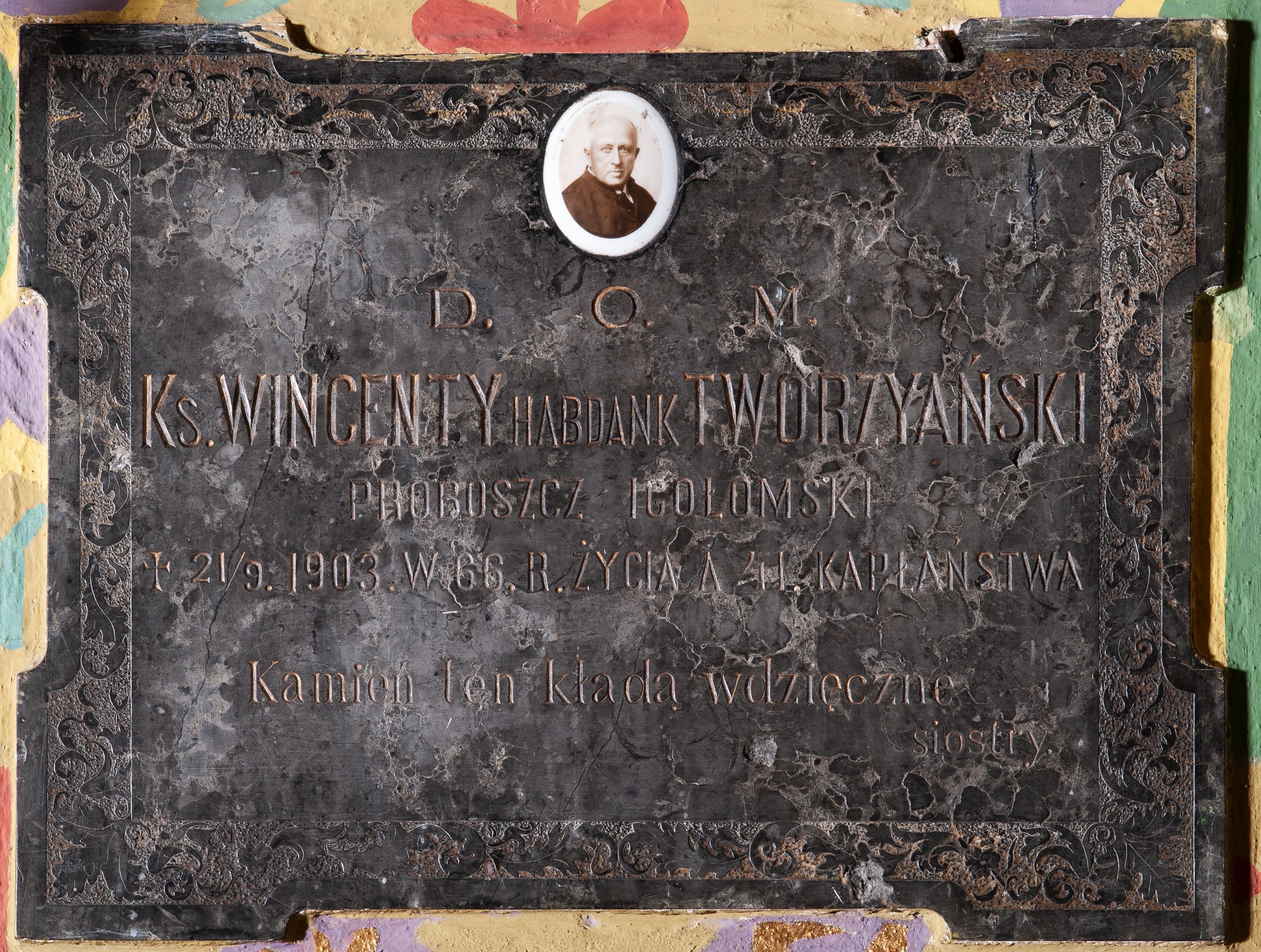 Tablica epitafijna w kształcie leżącego prostokąta w profilowanym obramieniu z uszakami, wypełnionym ornamentem roślinnym. W zwieńczeniu, pośrodku medalion ze zdjęciem zmarłego. W polu kuta inskrypcja „D(EO) O(PTIMO) M(AXIMO) / Ks(iądz) WINCENTY HABDANK TWORZYAŃSKI / PROBOSZCZ IGOŁOMSKI / +21/9. 1903. W 66. R(OKU) ŻYCIA A 41. KAPŁAŃSTWA / Kamień ten kładą wdzięczne / siostry”.