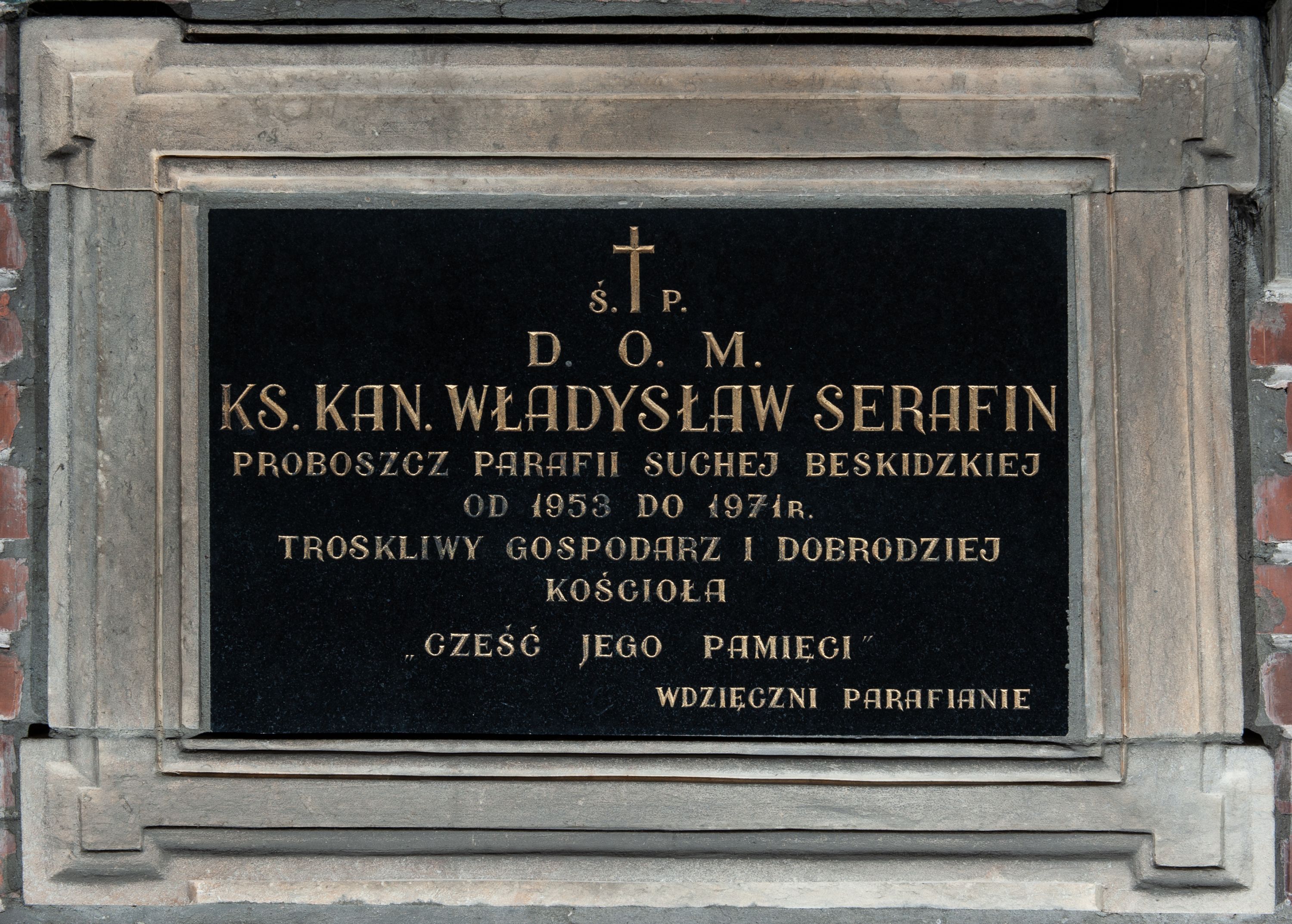 Prostokątna płyta w kształcie leżącego prostokąta, z czarnego marmuru, opatrzona majuskułowym napisem w języku polskim (litery pozłocone): Ś. P. / D. O. M. / KS. KAN. WŁADYSŁAW SERAFIN / PROBOSZCZ PARAFII SUCHEJ BESKIDZKIEJ / OD 1953 DO 1971 R. / TROSKLIWY GOSPODARZ I DOBRODZIEJ / KOŚCIOŁA / CZEŚĆ JEGO PAMIĘCI / WDZIĘCZNI PARAFIANIE. Płyta umieszczona w ramie z piaskowca, profilowanej, prostokątnej, z uszakami w narożach.