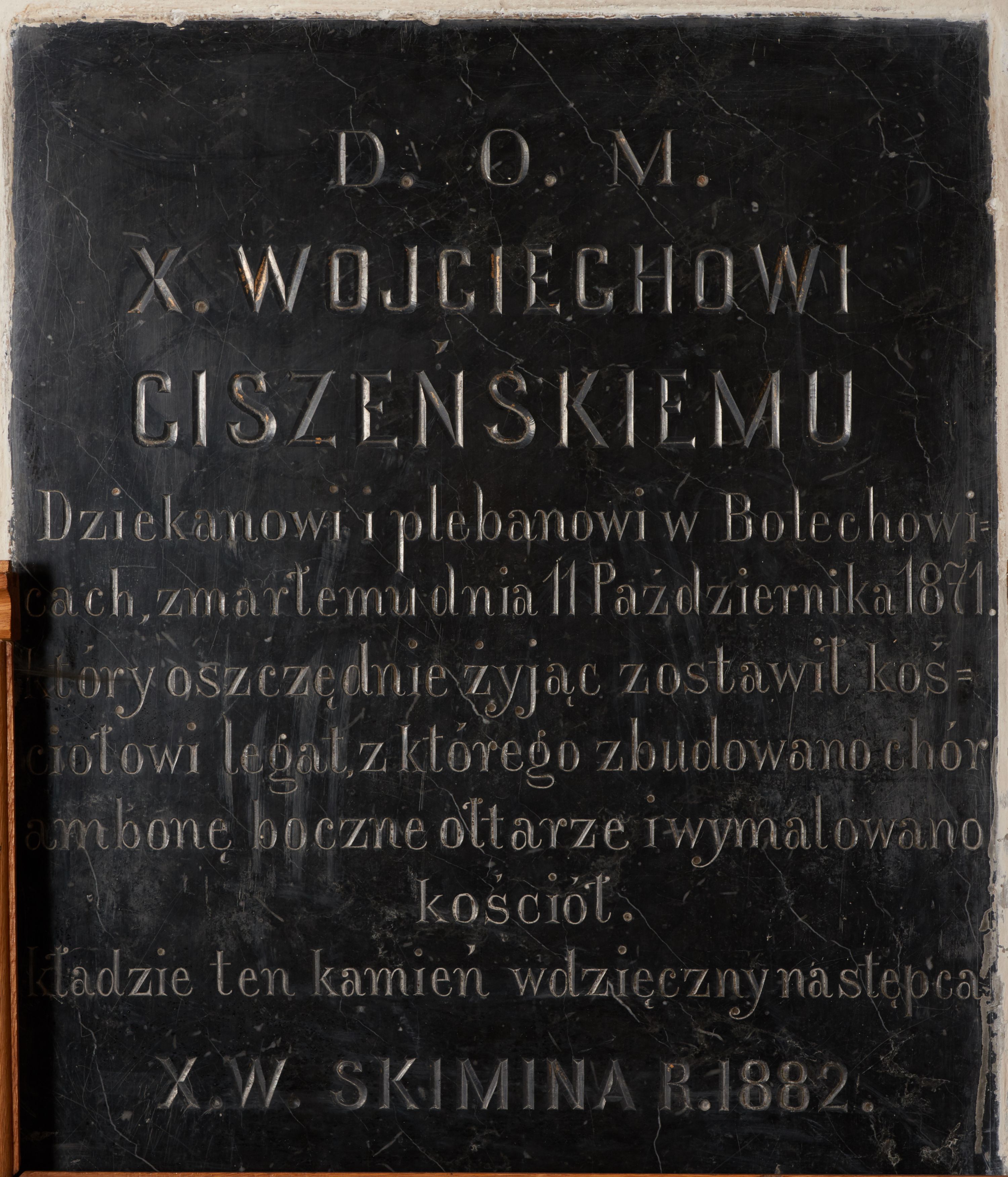 Czarnomarmurowa tablica epitafijna w kształcie stojącego prostokąta z kutą inskrypcją „D(EO) O(PTIMO) M(AXIMO) / X(IĘDZU) WOJCIECHOWI / CISZEŃSKIEMU / Dziekanowi i plebanowi w Bolechowi/cach, zmarłemu dnia 11 Października 1871. / który oszczędnie żyjąc zostawił koś/ciołowi legat, z którego zbudowano chór / ambonę boczne ołtarze i wymalowano / kościół. / kładzie ten kamień wdzięczny następca / X(IĄDZ) W(ALENTY) SKIMINA R(OKU) 1882.”