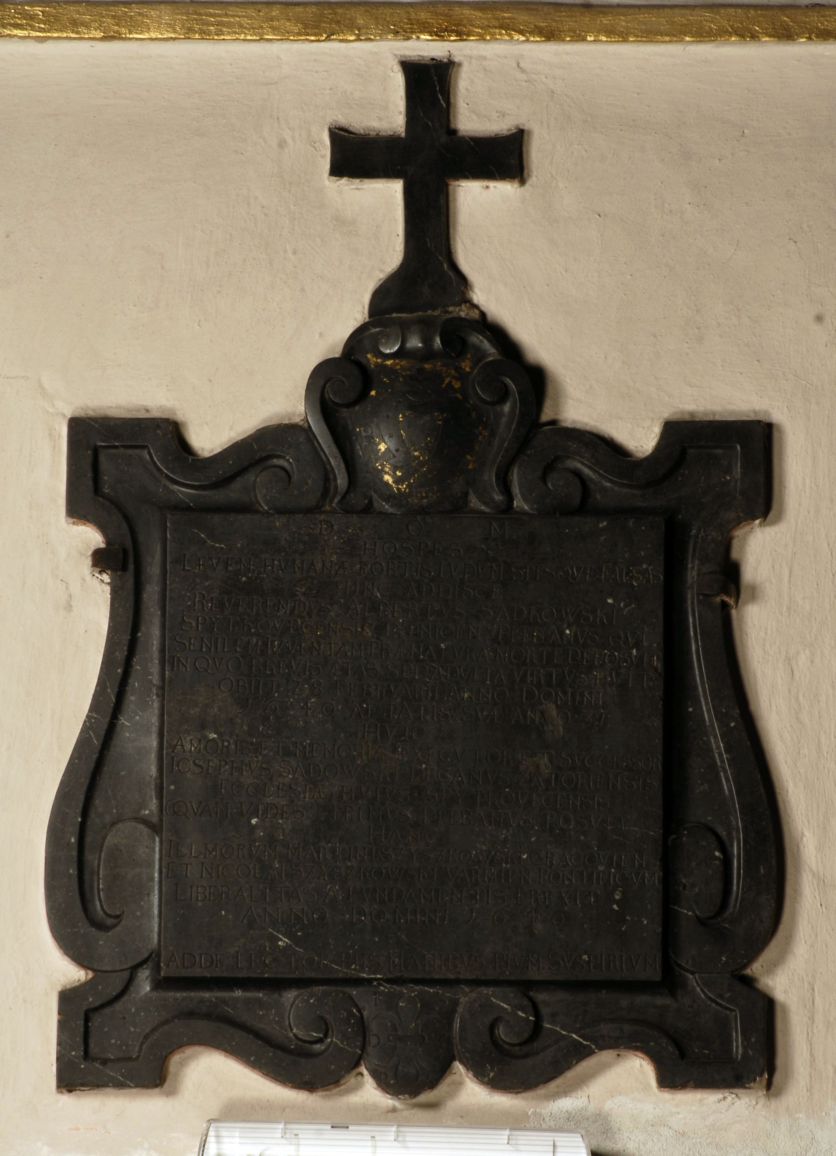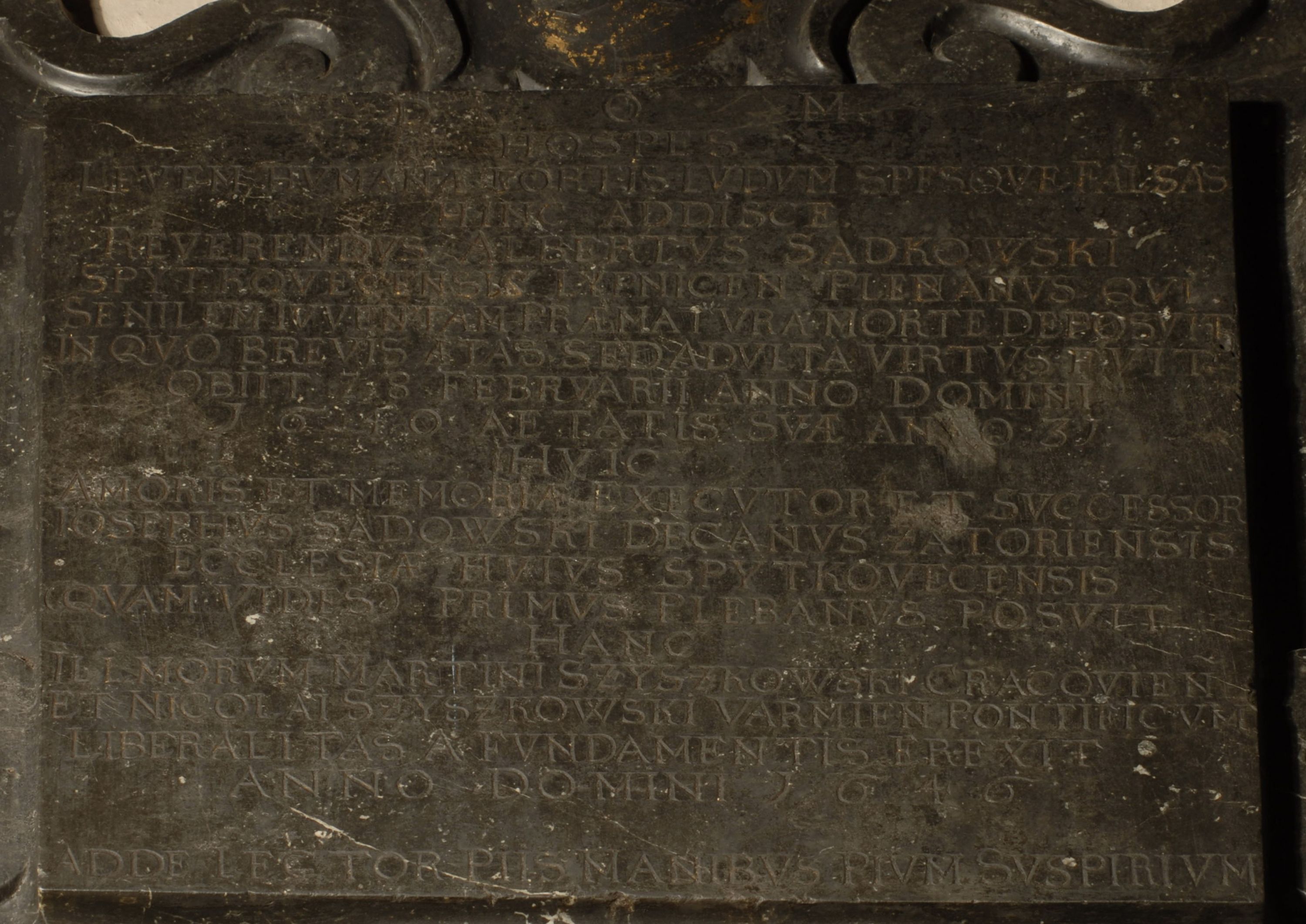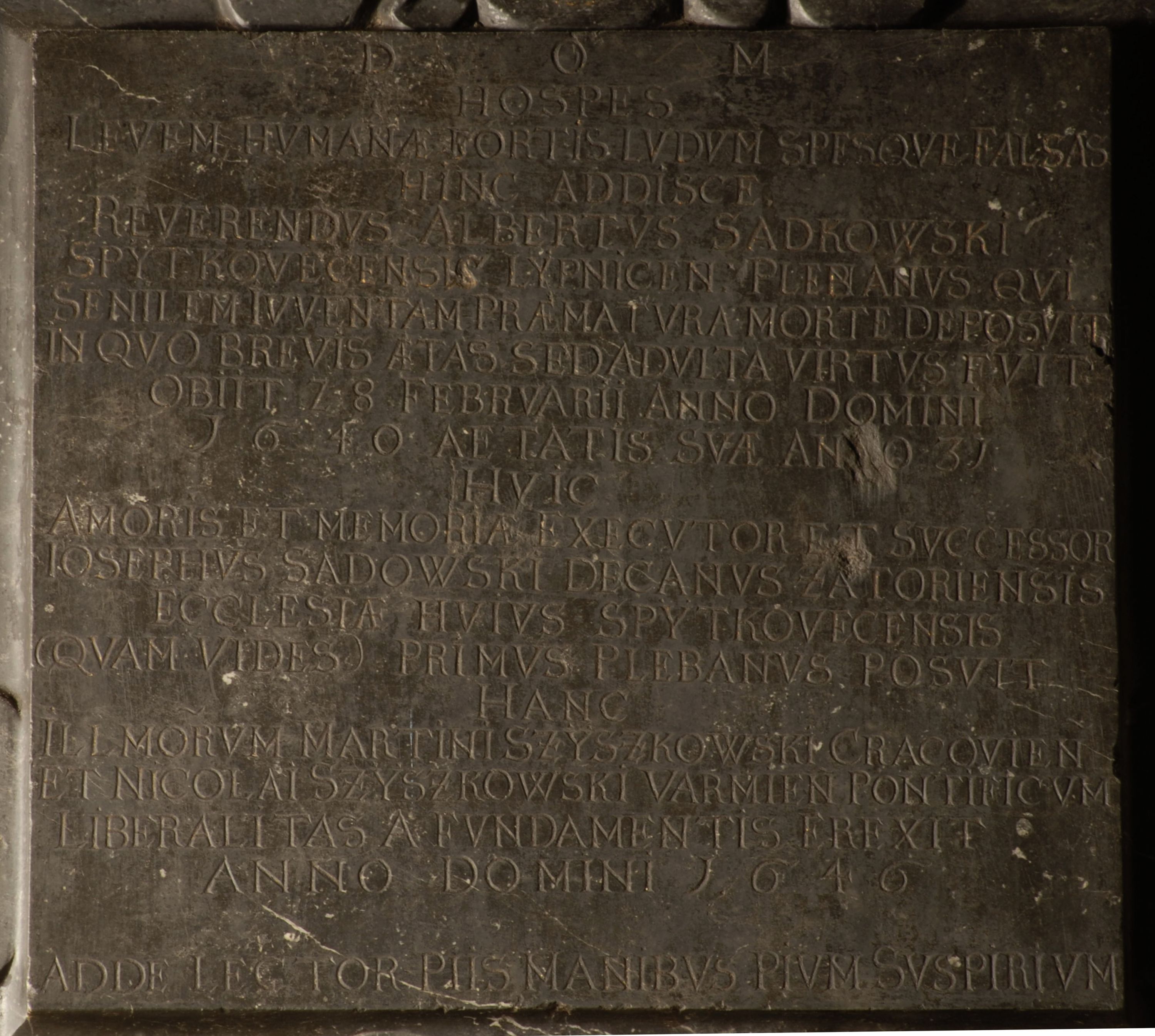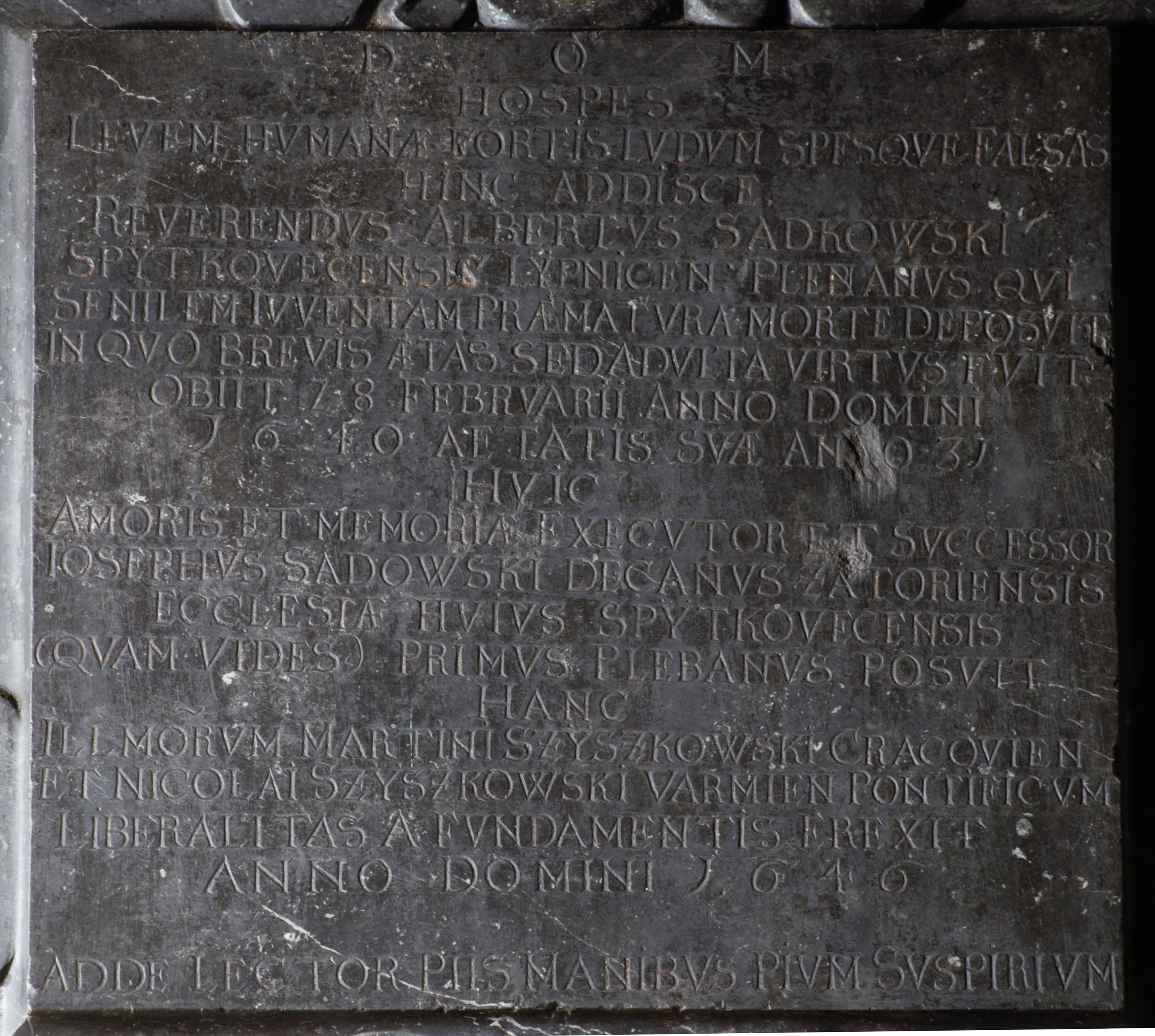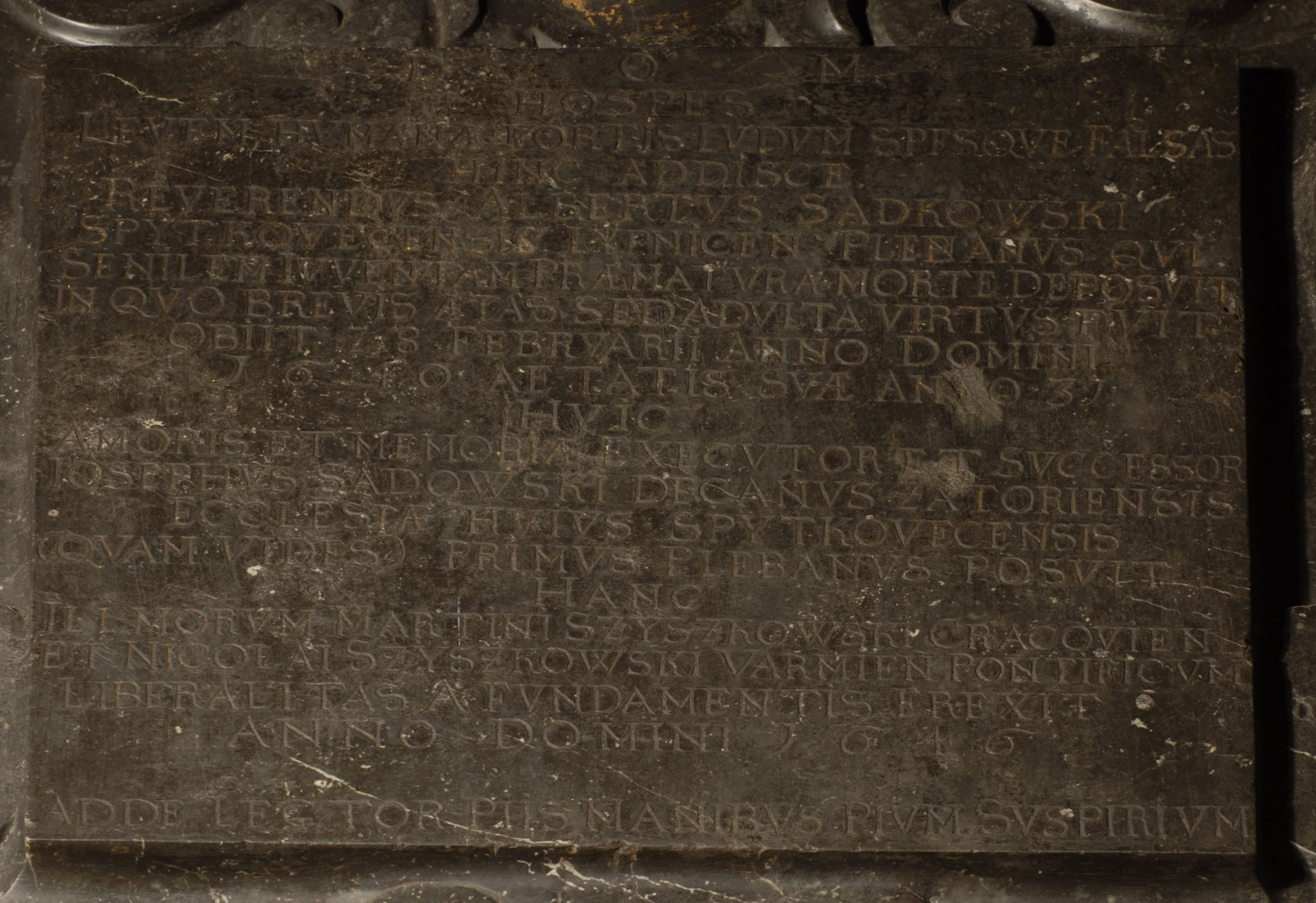 Tablica epitafijna w kształcie zbliżonym do kwadratu ujęta uszakami przechodzącymi w spływy wolutowe. Nad tablicą kartusz z godłem herbu Tępa Podkowa (wg Chrząńskiego odmiana typu c) i syglami A[LBERTUS] S[ADKOWSKI] P[LEBANUS] S[PYTKOVECENSIS] L[YPNICENSIS], zwieńczony krzyżem. Pod tablicą tarcza herbowa z godłem herbu Gozdawa i syglami I[OSEPHUS] S[ADKOWSKI] D[ECANVS] Z[ATORIENSIS] P[LEBANUS] S[PYTKOVeCENSIS]. Na tablicy inskrypcja: "D[EO] O[PTIMO] M[AXIMO] / HOSPES / LEVEM HVMANAE FORTIS LVDVM SPESQVE FALSAS / HINC ADDISCE. / REVERENDVS ALBERTUS SADKOWSKI / SPYTKOVECENSIS LYPNICEN(IS) PLEBANVS QVI / SENILEM IVVENTAM PRAEMATVRA MORTE DEPOSVIT / IN QVO BREVIS AETAS SED ADVLTA VIRTVS FVIT / OBIIT 28 FEBRVARII ANNO DOMINI / 1640 AETATIS SVA ANNO 31 / HVIC / AMORIS ET MEMORIAE EXECVTOR ET SVCCESSOR / JOSEPHVS SADOWSKI DECANVS ZATORIENSIS / ECCLESIAE HVIVS SPYTKOVECENSIS / QVAM VIDES PRIMVS PLEBANVS POSVIT / HANC / ILL(USTRISI)MORUM MARTINI SZYSZKOWSKI CRACOVIEN[SIS] ET NICOLAI SZYSZKOWSKI VARMIEN[SIS] PONTIFICVM / LIBERALITAS A FVNDAMENTIS EREXIT / ANNO DOMINI 1646 / ADDE LECTOR PIIS MANIBVS PIVM SVSPIRIVM".