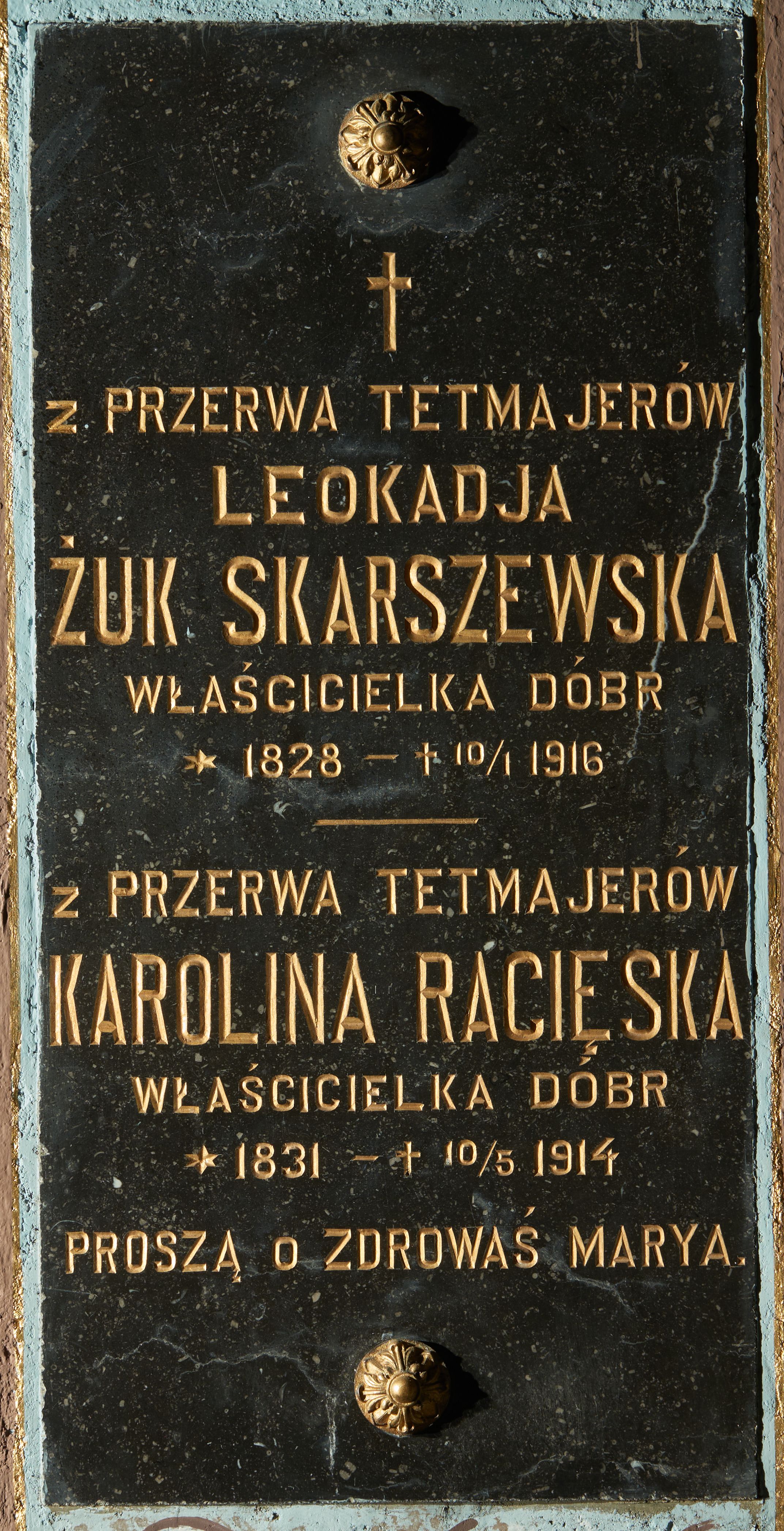 Płyta w formie wydłużonego stojącego prostokąta. Przymocowana do ściany dwiema ślubami o dekoracyjnych łbach w formie rozet, zamocowanymi przy krótszych bokach. W polu złocona inskrypcja: „Z PRZERWA TETMAJERÓW / LEOKADJA / ŻUK SKARSZEWSKA / WŁAŚCICIELKA DÓBR / *1828 +10/I 1916 / Z PRZERWA TETMAJERÓW / KAROLINA RACIĘSKA / WŁAŚCICIELKA DÓBR *1831 +10/5 1914 / PROSZĄ O ZDROWAŚ MARYA.”