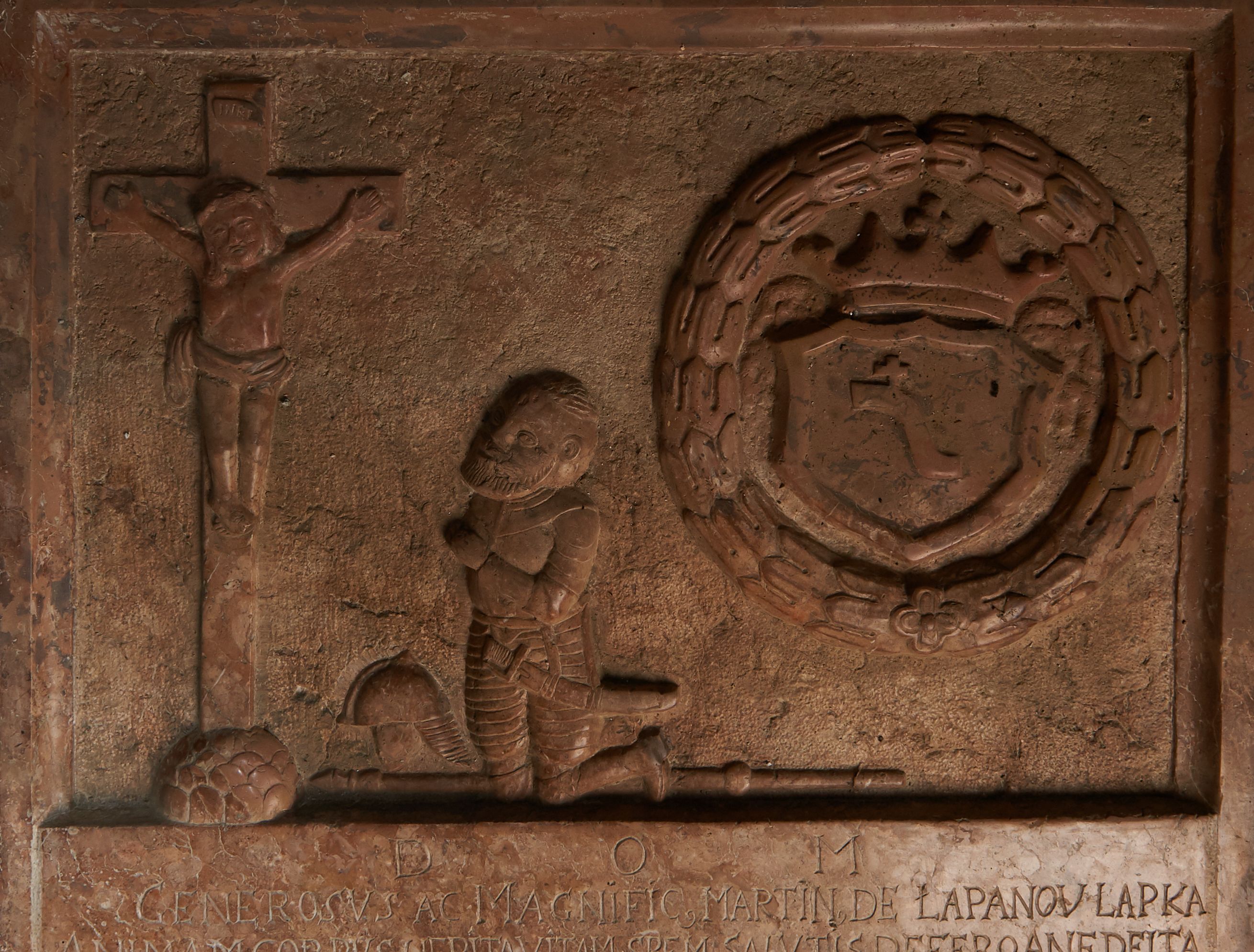 „D[EO] O[PTIMO] M[AXIMO] / GENEROSVS AC MAGNIFIC[US] MARTIN[US] DE ŁAPANOV ŁAPKA / ANIMAM CORPVS, I IERITA VITAM SPEM SALVTIS DEFERO ANEDEITA / BVNAL SPIRITVM COMMENDO CIRISTIE SVET SACTISSIME VIRGINI MATRI / VIXI / AD MOREM NON SOLVM AT NATVRAM / PACIS BELLI[US] ARTIBVS CLARVS / HVMANITATE SI NON SVPERIOR PAR CAETERI / NON TAM ANNIS QVAM BELLICIS LABORIB[US] FRACTVS MORIOR PRAEPROPERE / ISMVLTVM VIXIT QVI PROBE VIXIT / O ANICI VALETE ET VIVITE / NOC DOLORIS LABRVM FLENS MARIANNA DE LIPIE / CONSOPS SUPERSTES FIERI CURAVIT/ OBIIT ANNO 1652 DIE 28 7BRI / VIXIT ANNIS 53”. Na ramie, w lewym dolnym rogu znak kamieniarski w formie łopaty.