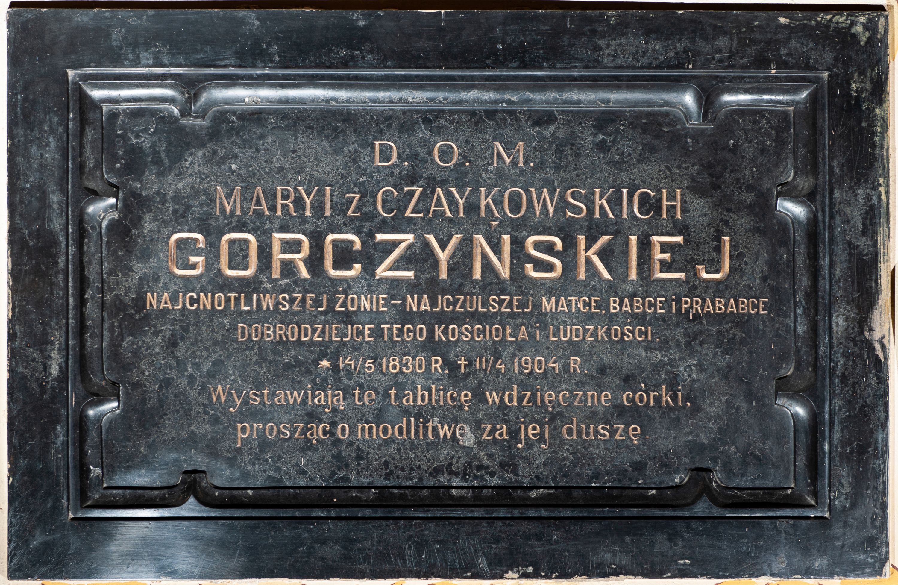 Epitafium w formie leżącego prostokąta, ujęte grubą ramą, dekorowaną po wewnętrznej stronie maswerkiem. W polu inskrypcja „D(EO) O(PTIMO) M(AXIMO) / MARYI Z CZAYKOWSKICH / GORCZYŃSKIEJ / NAJCNOTLIWSZEJ ŻONIE – NACZULSZEJ MATCE, BABCE i PRABABCE / DOBRODZIEJCE TEGO KOŚCIOŁA i LUDZKOŚCI. / *14/5 1830 R(OKU) +11/4 1904 R(OKU) / Wystawiają te tablicę wdzięczne córki, / prosząc o modlitwę za jej duszę”.