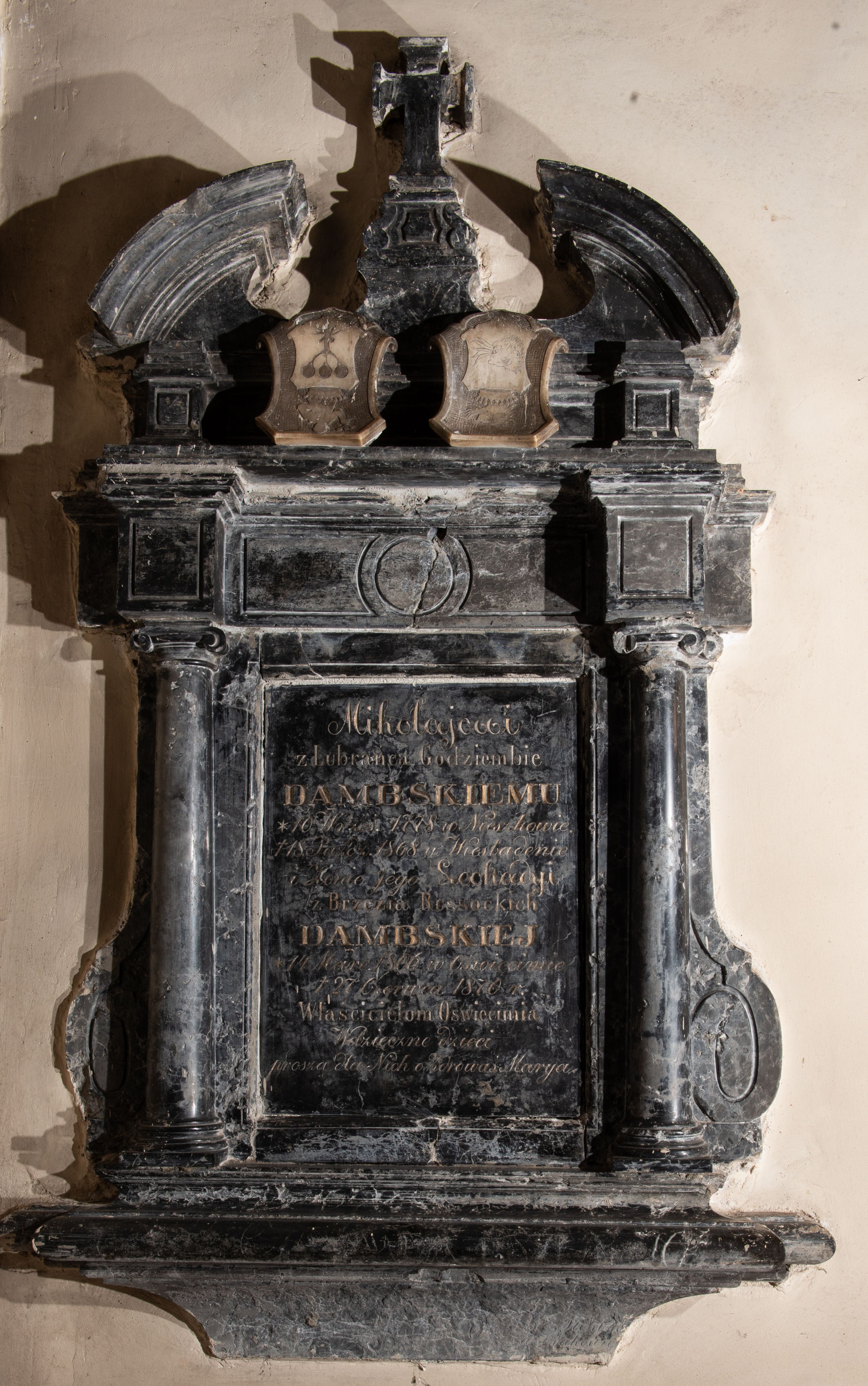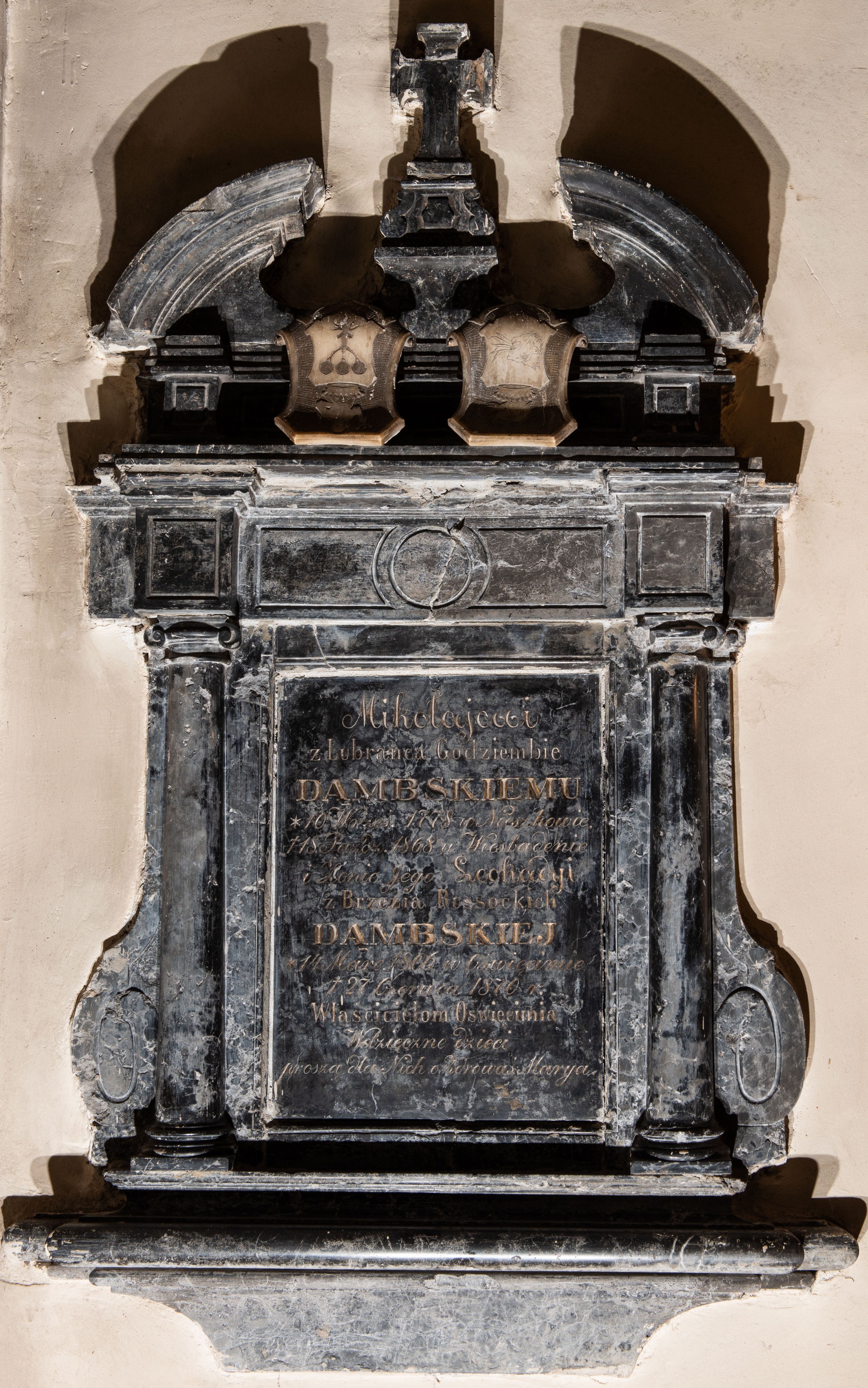 Epitafium Mikołaja i Leokadii z Brzezia Rusockich Dąmbskich powstało po 1870 roku i jest dziełem Edwarda Stehlika znanego kamieniarza krakowskiego. Swoją formą nawiązuje do zabytków z drugiej połowy XVII i początku XVIII wieku.