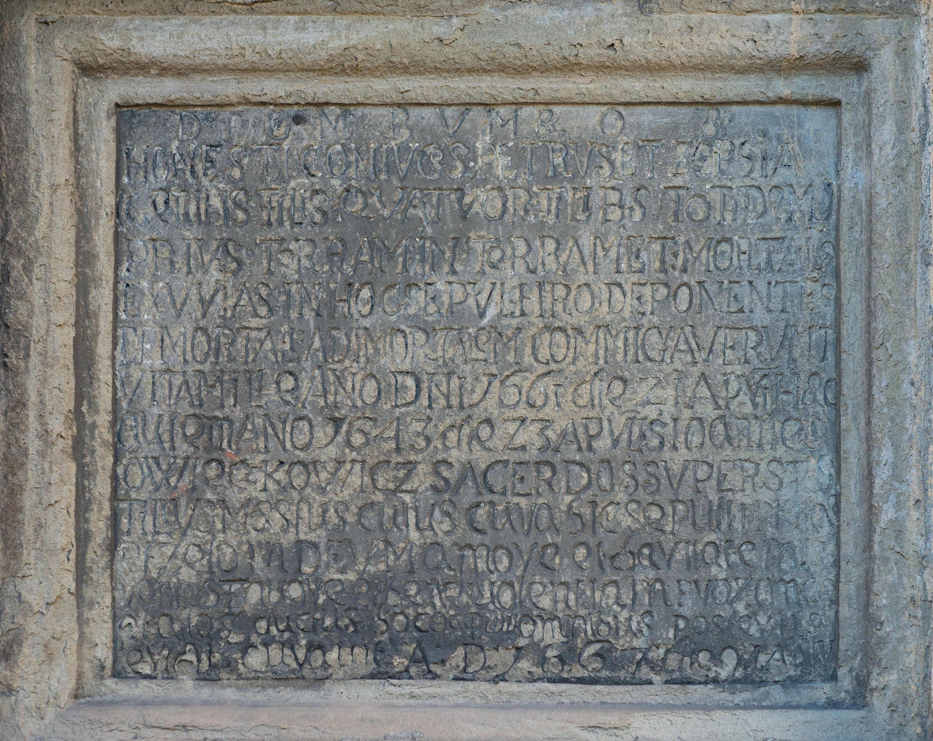 Kamienne epitafium Piotra i Zofii Owieczkowiczów z inskrypcją łacińską, w profilowanym obramieniu, ufundowane w roku 1667.
