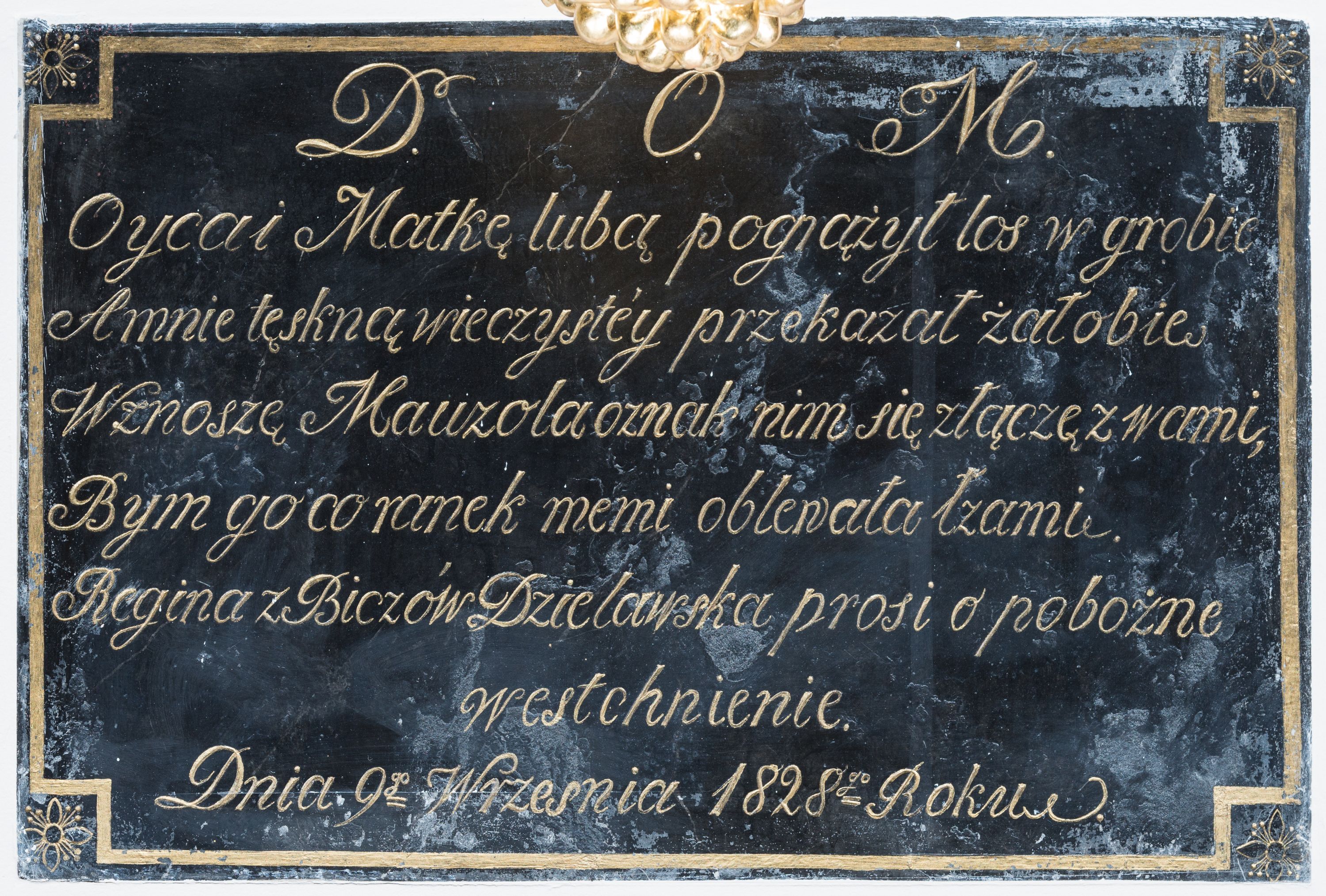 Epitafium w formie kamiennej tablicy w kształcie leżącego prostokąta. W ujętym prostym, złoconym obramowaniem wciętym w narożach z motywami rozetek polu ryty napis „D(EO) O(PTIMO) M(AXIMO) / Oyca i Matkę lubą pogrążył los w grobie / A mnie tęskną wieczystey przekazał żałobie / Wznoszę Mauzola oznak nim się złączę z wami, / Bym go co ranek memi oblewała łzami. / Regina z Biczów Dzielawska prosi o pobożne / westchnienie. / Dnia 9go Września 1828go Roku.”