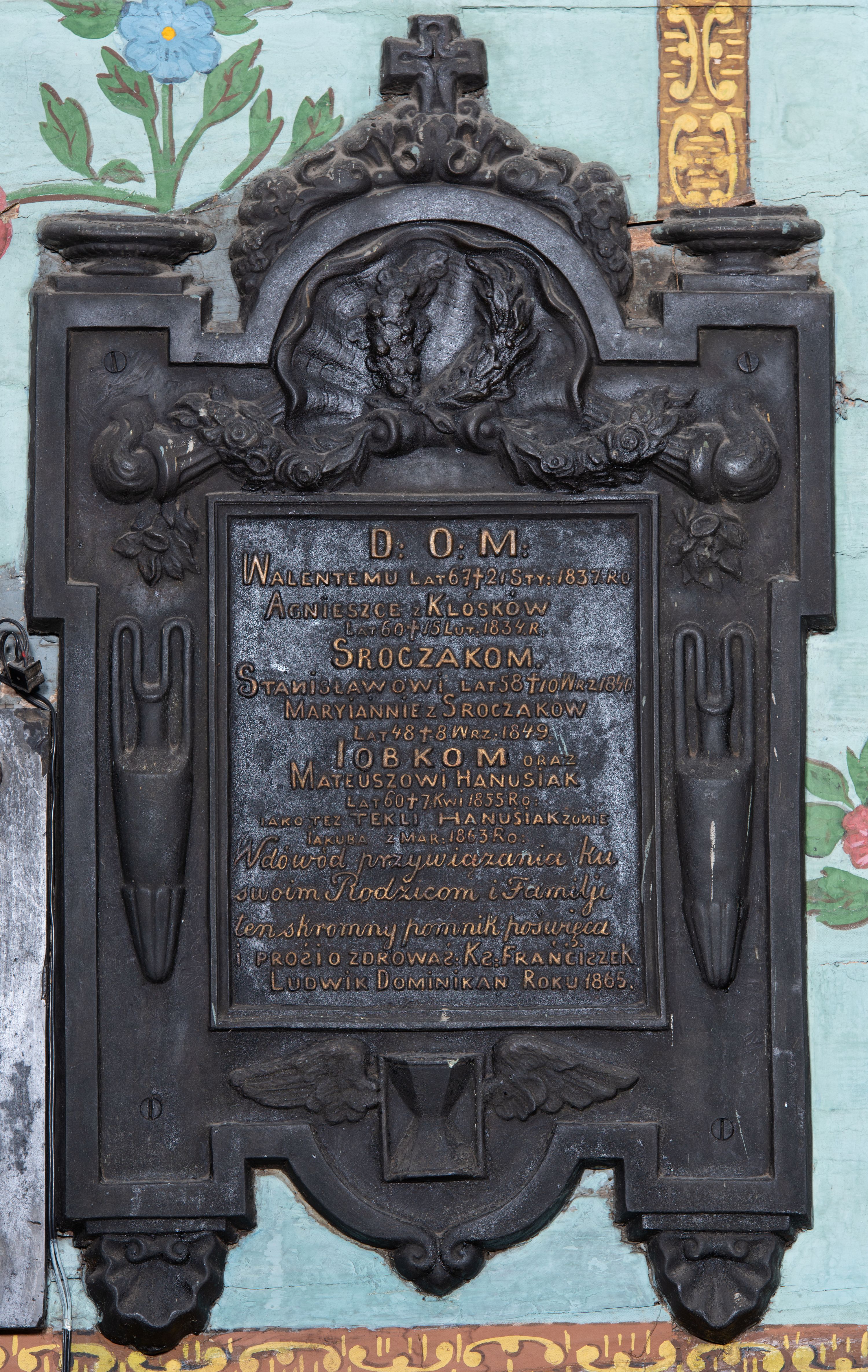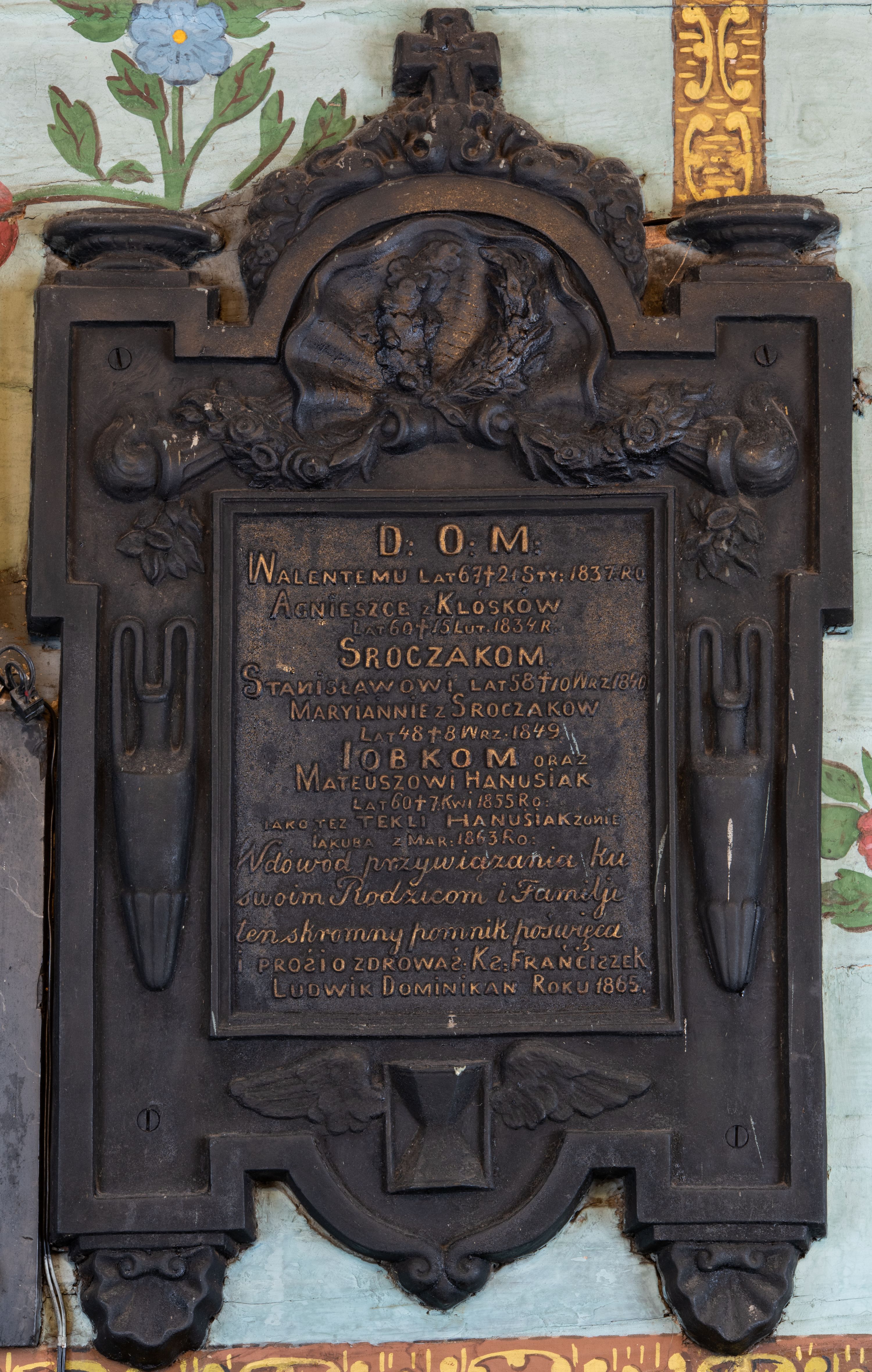 Epitafium w formie tablicy o kształcie stojącego prostokąta ujętej grubą ramą z uszakami w narożach, zamkniętej półkoliście od góry i dołu. W górnej części ramy muszla z podwieszonymi zwisami kwiatowymi, zawiniętymi na palących się pochodniach. Po bokach ramy dwa wąskie wazony, u spodu uskrzydlona klepsydra. Epitafium zwieńczone dekoracją roślinną z krzyżem, na górnych uszakach ustawione dla płaskie wazony, dolne zakończone muszlami. W polu złocony napis „D(EO) O(PTIMO) M(AXIMO) / WALENTEMU LAT 67 † 21 STY(CZNA) 1837. RO[KU] / AGNIESZCE Z KLÓSKÓW / LAT 60 † 15 LUT(EGO) 1834. R(OKU) / SROCZAKOM. / STANISŁAWOWI LAT 58 † 10 WRZ(EŚNIA) 1840 / MARYIANNIE Z SROCZAKÓW / LAT 48 † 8 WRZ(EŚNIA) 1849. / IOBKOM ORAZ / MATEUSZOWI HANUSIAK / LAT 60 † 7 KWI(ETNIA) 1855 RO(KU) / IAKO TEZ TEKLI HANUSIAK ZONIE / IAKUBA ZMAR(ŁEGO) 1863 RO(KU) / W dowód przywiązania ku / swoim Rodzicom i Familiji / ten skromny pomnik poświęca / I PROSI O ZDROWAŚ : KS(IĄDZ) FRANCISZEK / LUDWIK DOMINIKAN ROKU 1865.”