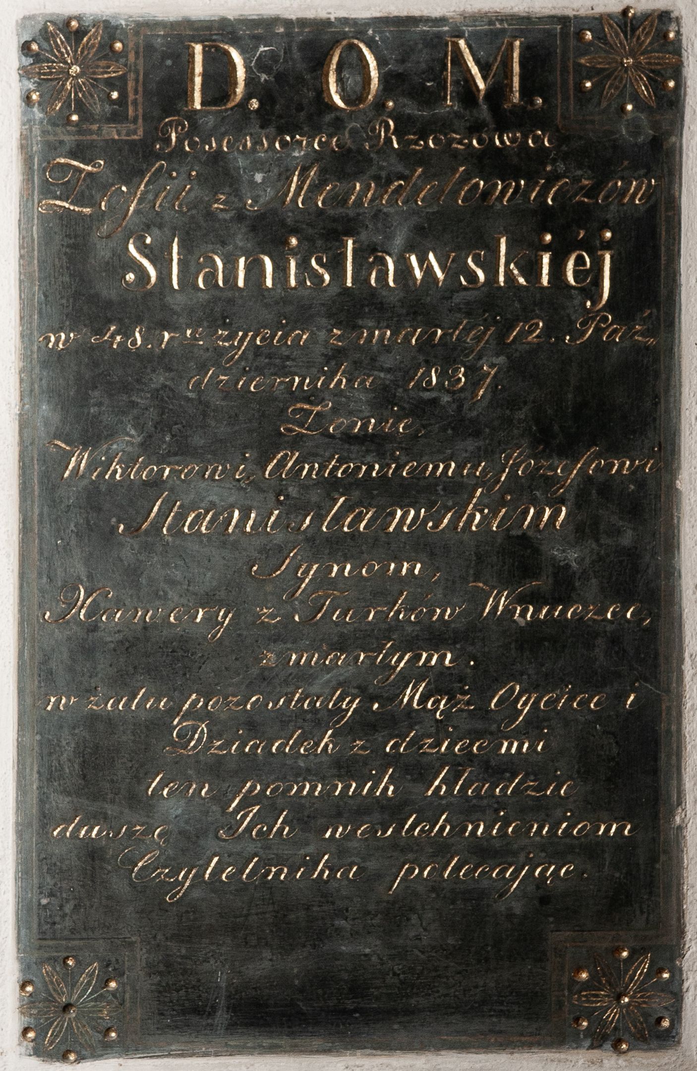 Kamienna płyta w kształcie stojącego prostokąta z wykutą i pozłoconą inskrypcją „D(EO) O(PTIMO) M(AXIMO) / Possesorce Rzozowa / Zofii z Mendelowiczów / Stanisławskiej / w 48. r(ok)u życia zmarłej 12. Paź/dziernika 1837. / Żonie, / Wiktorowi, Antoniemu, Józefowi / Stanisławskim / Synom, / Xawery z Turków Wnuczce, / zmarłym. / w żalu pozostały Mąż Oyciec i / Dziadek z dziećmi / ten pomnik kładzie / duszę Ich westchnieniom / Czytelnika polecając”. Napis obwiedziono ramką wyciętą w narożach, aby zrobić miejsce na dekoracyjne rozetki.
