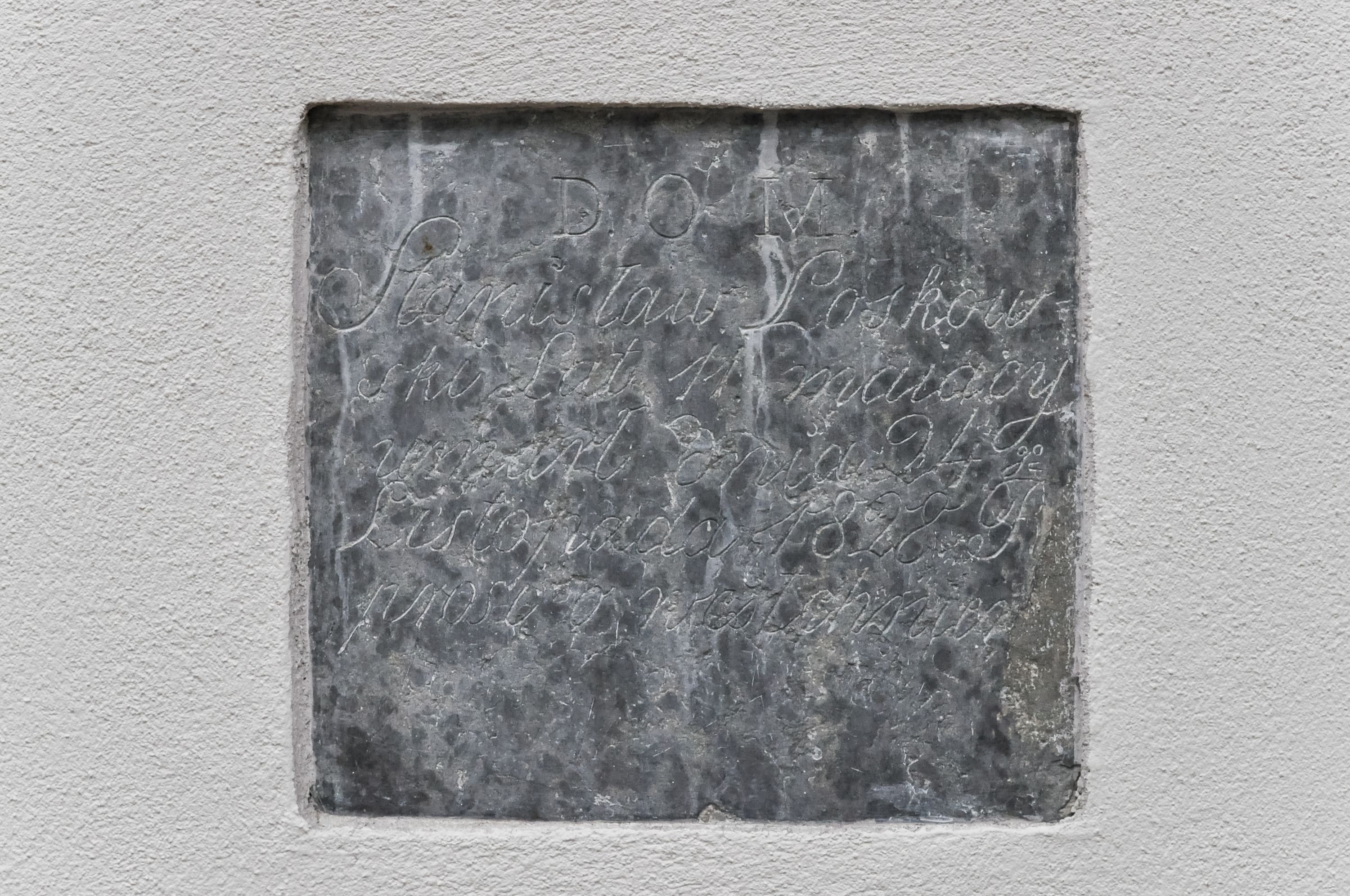 Kamienna tablica epitafijna w kształcie zbliżonym do kwadratu z inskrypcją „D(EO) O(PTIMO) M(AXIMO) / Stanisław Loskow/ski Lat 11. mający / umarł dnia 24 go / Listopada 1828 R(oku) / prosi o westchnie[nie]”.