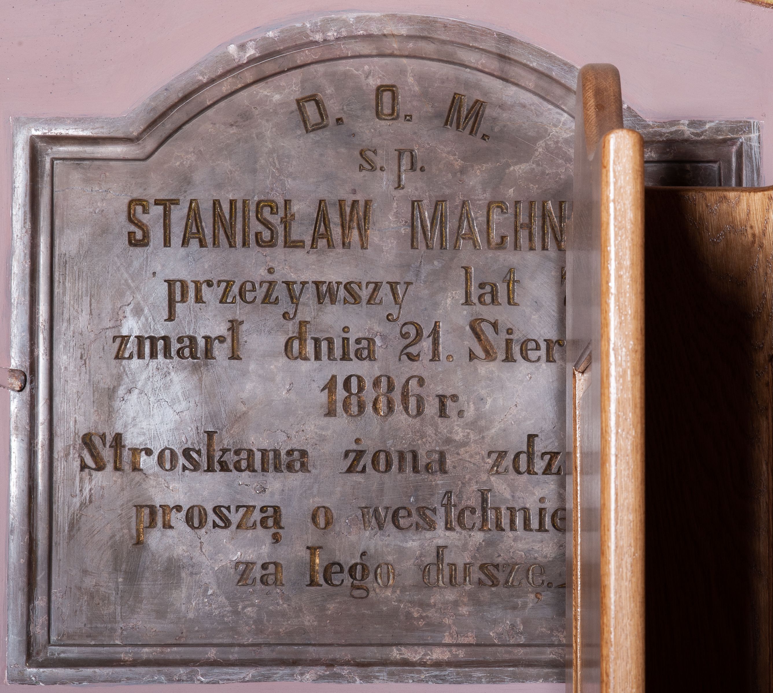Tablica epitafijna w kształcie leżącego prostokąta, zamknięta łukiem nadwieszonym, profilowana. W polu inskrypcja „D(EO) O(PTIMO) M(AXIMO) / s(więtej) p(amięci) / STANISŁAW MACHNICKI / przeżywszy lat 75 / zmarł dnia 21. Sierpnia / 1886 r(oku) / Stroskana żona z dziećmi / proszą o westchnienie / za Jego duszę”.