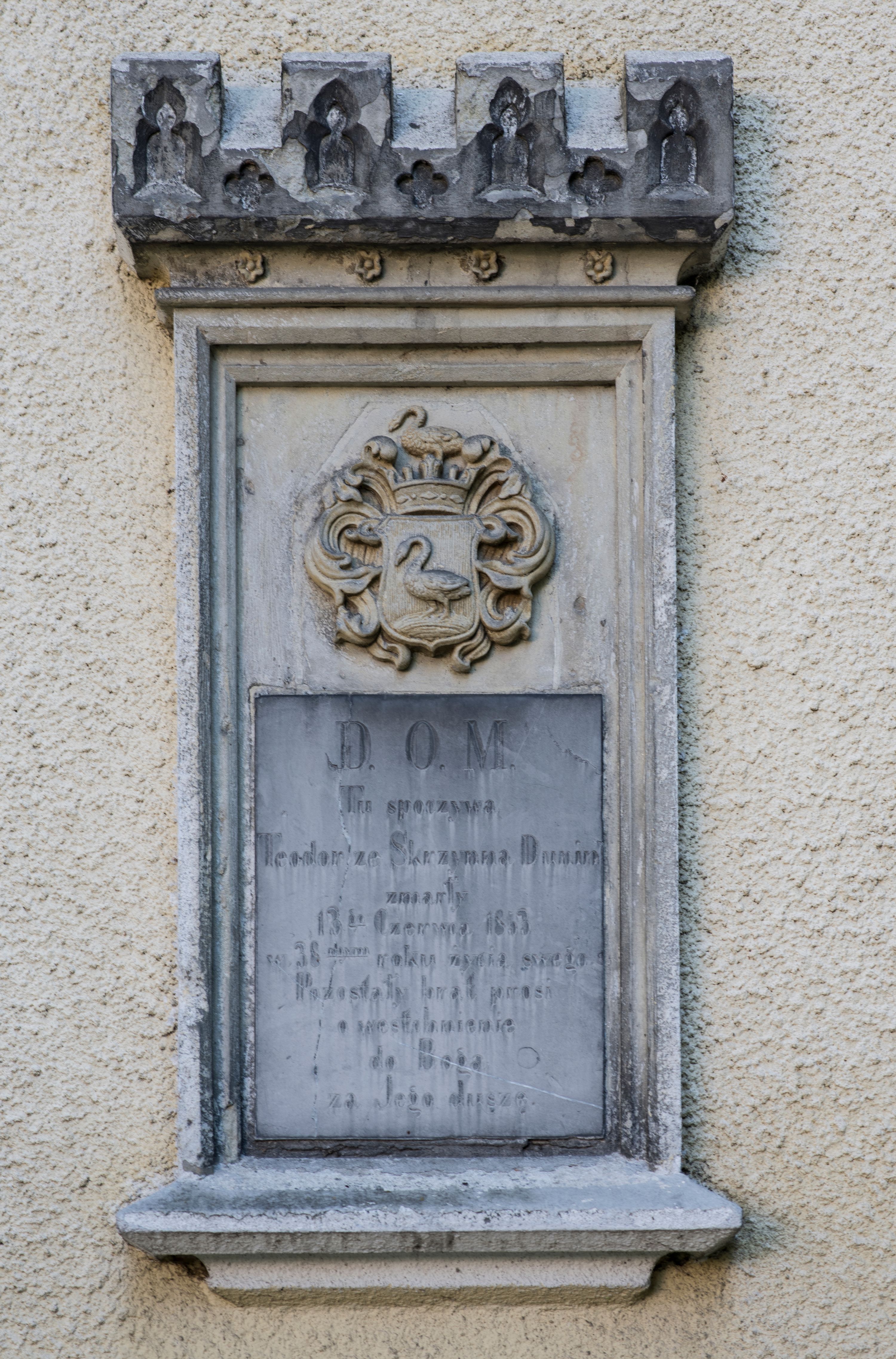 Epitafium w kształcie stojącego prostokąta wsparte na wysuniętym do przodu gzymsie, obwiedzione profilowanym obramieniem, zwieńczone krenelażem wypełnionym ślepym maswerkowaniem i rozetkami. W polu płyty, nad tablicą inskrypcyjną tarcza z godłem herbu Łabędź, labrami, koroną i klejnotem. Poniżej inskrypcja „D(EO) O(PTIMO) M(AXIMO) | Tu spoczywa / Teodor ze Skrzynna Dunin / zmarły 13go czerwca 1853 / w 38mym roku życia swego / pozostały brat prosi / o wstawienie | / do Boga / za Jego duszę”