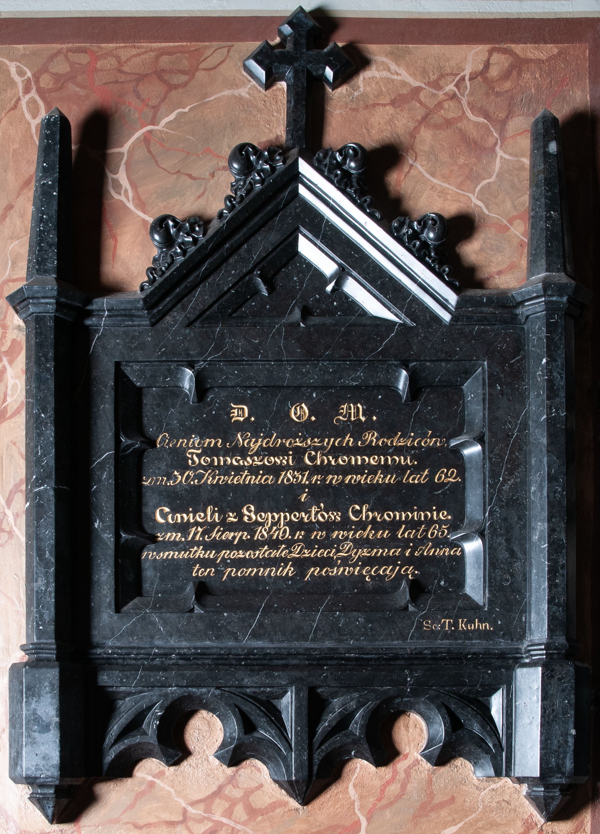 Epitafium przyścienne w kształcie leżącego prostokąta, flankowanego przez pięcioboczne sterczyny. Od dołu dwa maswerki trójlistne. Powyżej tablica z inskrypcją: "D)EO) O(PTIMO) M(AXIMO) / Cieniom Najdroższych Rodziców. / Tomaszowi Chromemu. zm(arłemu) 30. Kwietnia 1831. r(oku) w wieku lat 62. / i / Anieli z Seppertów Chrominie. zm(arłej) 17. Sierp(nia) 1849 r(oku) w wieku lat 65. / w smutku pozostałe Dzieci, Dyzma i Anna / ten pomnik poświęcają. Zwieńczenie w formie trójkątnego przyczółka z krzyżem pośrodku oraz żabkami po bokach. W prawym dolnym rogu epitafium sygnatura: "Sc(ulpsit): T. Kuhn.".