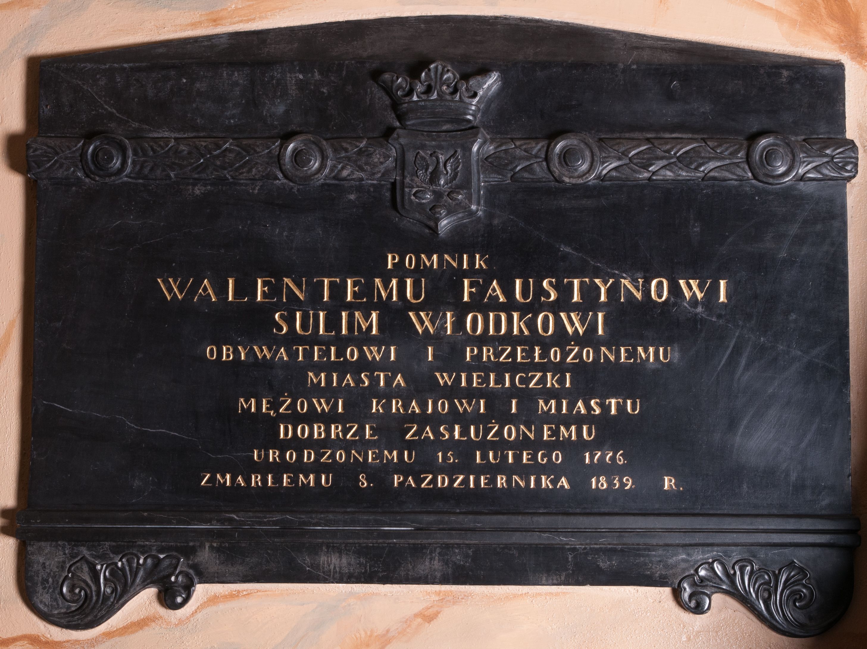 Epitafium w kształcie leżącego prostokąta, wspartego na gzymsie i dwóch narożnych konsolach ozdobionych liśćmi. Górną część zdobi pas z liśćmi laurowymi z okrągłymi medalionami i z herbem Sulima pośrodku z tarczą nakrytą koroną otwartą. Na tablicy inskrypcja „POMNIK / WALENTEMU FAUSTYNOWI / SULIM WŁODKOWI / OBYWATELOWI I PRZEŁOŻONEMU / MIASTA WIELICZKI / MĘŻOWI KRAJOWI I MIASTU / DOBRZE ZASŁUŻONEMU / URODZONEMU 15. LUTEGO 1776. / ZMARŁEMU 8. PAZDZIERNIKA 1839. R(OKU)”.