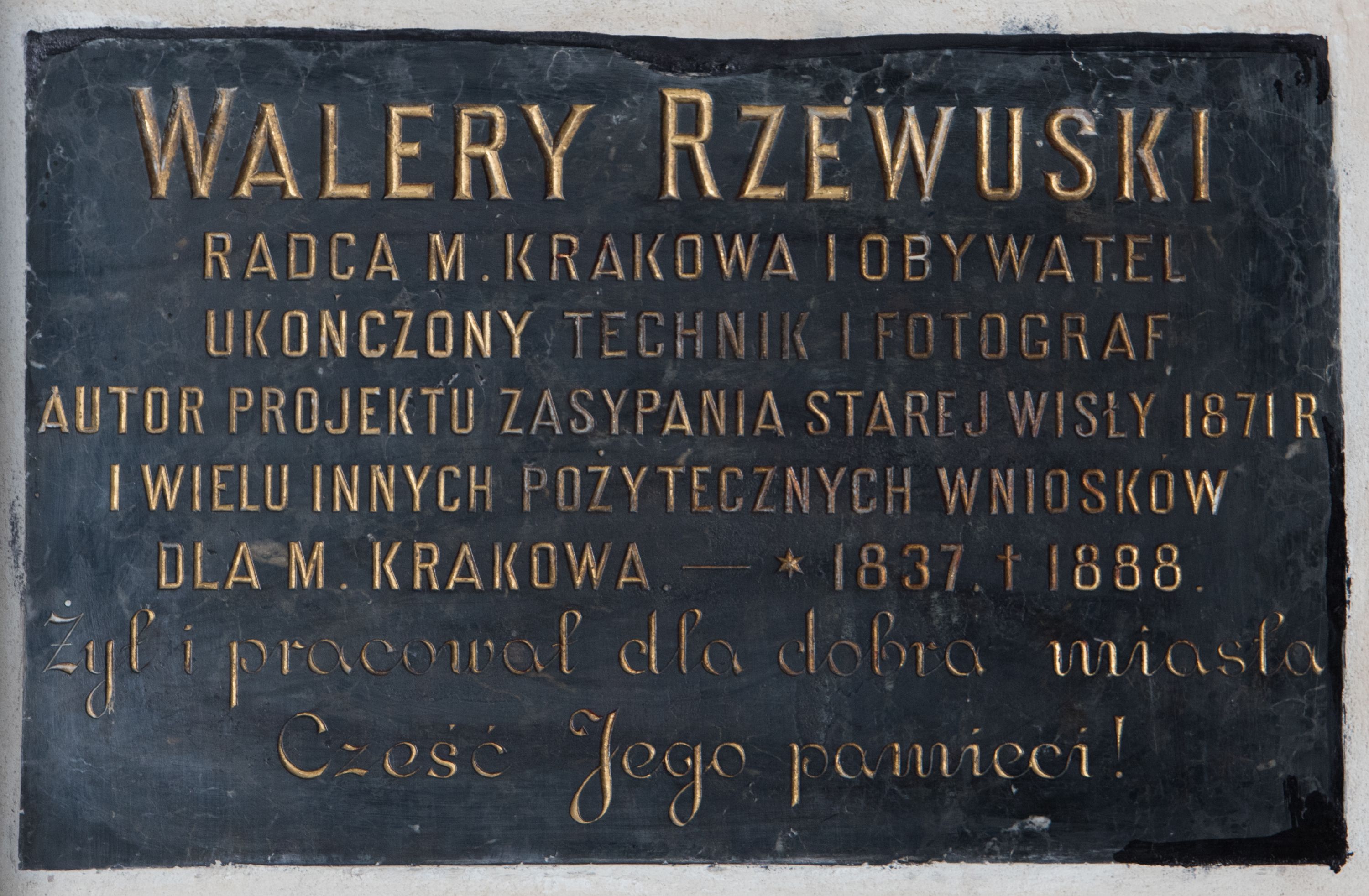 Tablica w kształcie leżącego prostokąta z inskrypcją „WALERY RZEWUSKI / RADCA M(IASTA) KRAKOWA I OBYWATEL / UKOŃCZONY TECHNIK I FOTOGRAF / AUTOR PROJEKTU ZASYPANIA STAREJ WISŁY 1871 R[OKU] / I WIELU INNYCH POŻYTECZNYCH WNIOSKÓW / DLA M(IASTA) KRAKOWA. – *1837. + 1888. / Żył i pracował dla dobra miasta / Cześć Jego pamięci!”