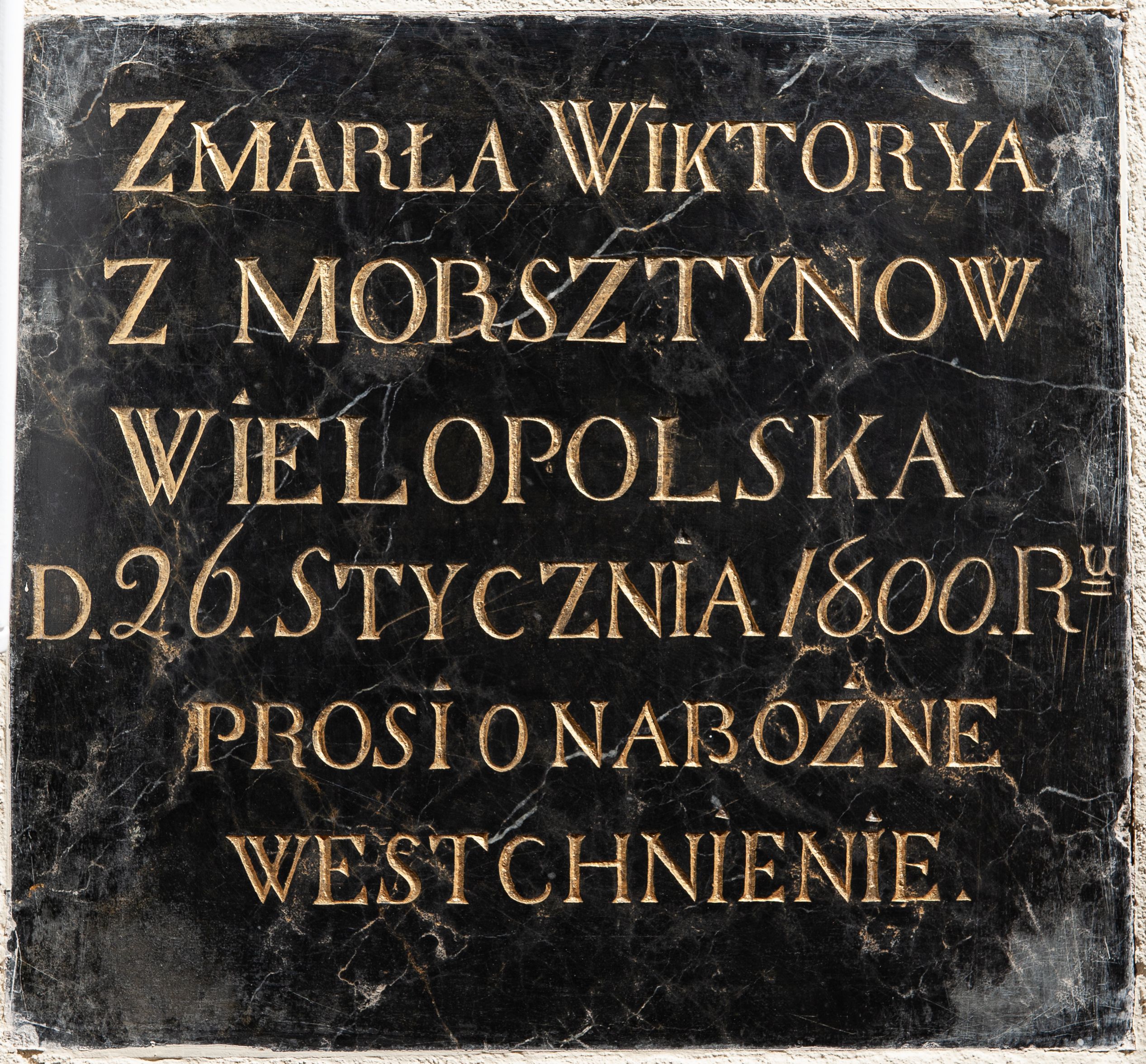 Epitafium z czarnego marmuru w formie zbliżonej do kwadratu ze złoconą inskrypcją „ZMARŁA WIKTORYA / Z MORSZTYNOW / WIELOPOLSKA / D(NIA) 26. STYCZNIA 1800 R(OK)U / PROSI O NABOŻNE / WESTCHNIENIE”.