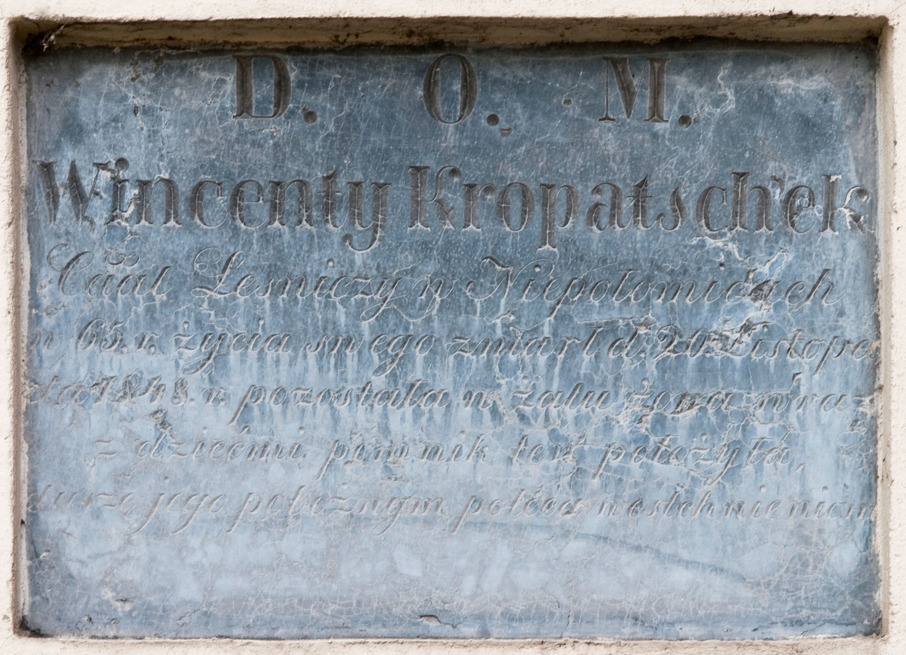 Płyta w formie leżącego prostokąta. W polu inskrypcja „D(eo) O(ptimo) M(aximo) / Wincenty Kropatschek / Caal Leśniczy w Niepołomicach / w 65. r(oku) życia swego zmarł d(nia) 20 Listopa/da 1848. r(oku) pozostała w żalu żona wraz / z dziećmi pomnik ten położyła, / duszę jego pobożnym poleca westchnieniom.”