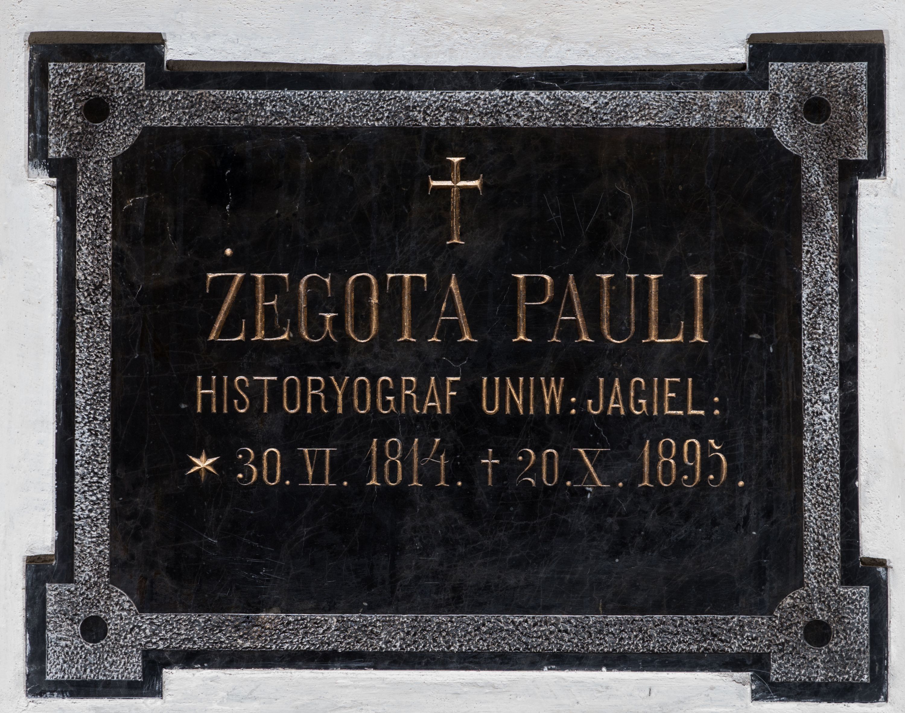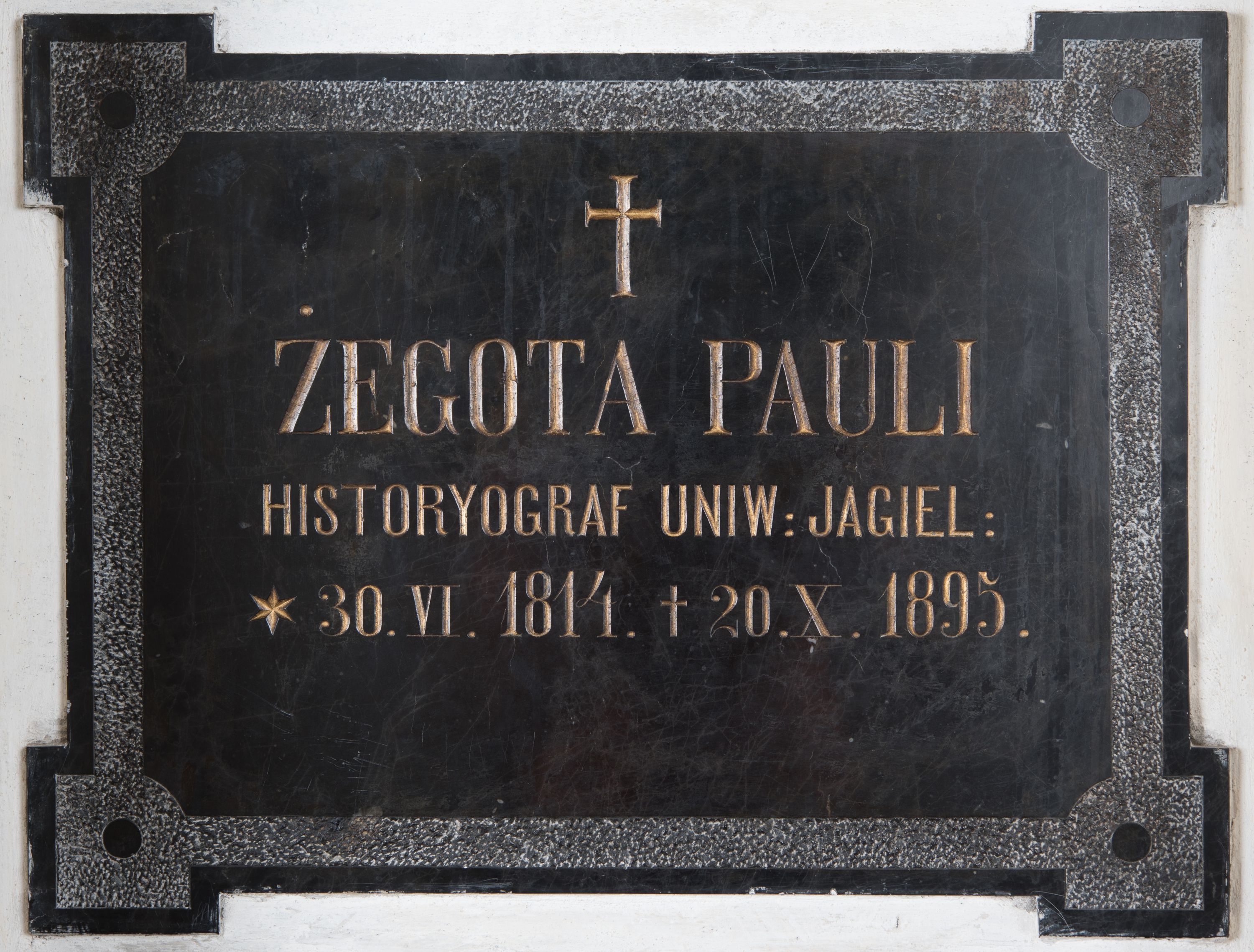 Epitafium w kształcie leżącego prostokąta z uszakami w narożach. W polu tablicy inskrypcja „+ ŻEGOTA PAULI / HISTORYOGRAF UNIW(ERSYTETU) JAGIEL(LOŃSKIEGO) / *30. VI. 1814. + 20. X. 1895.”
