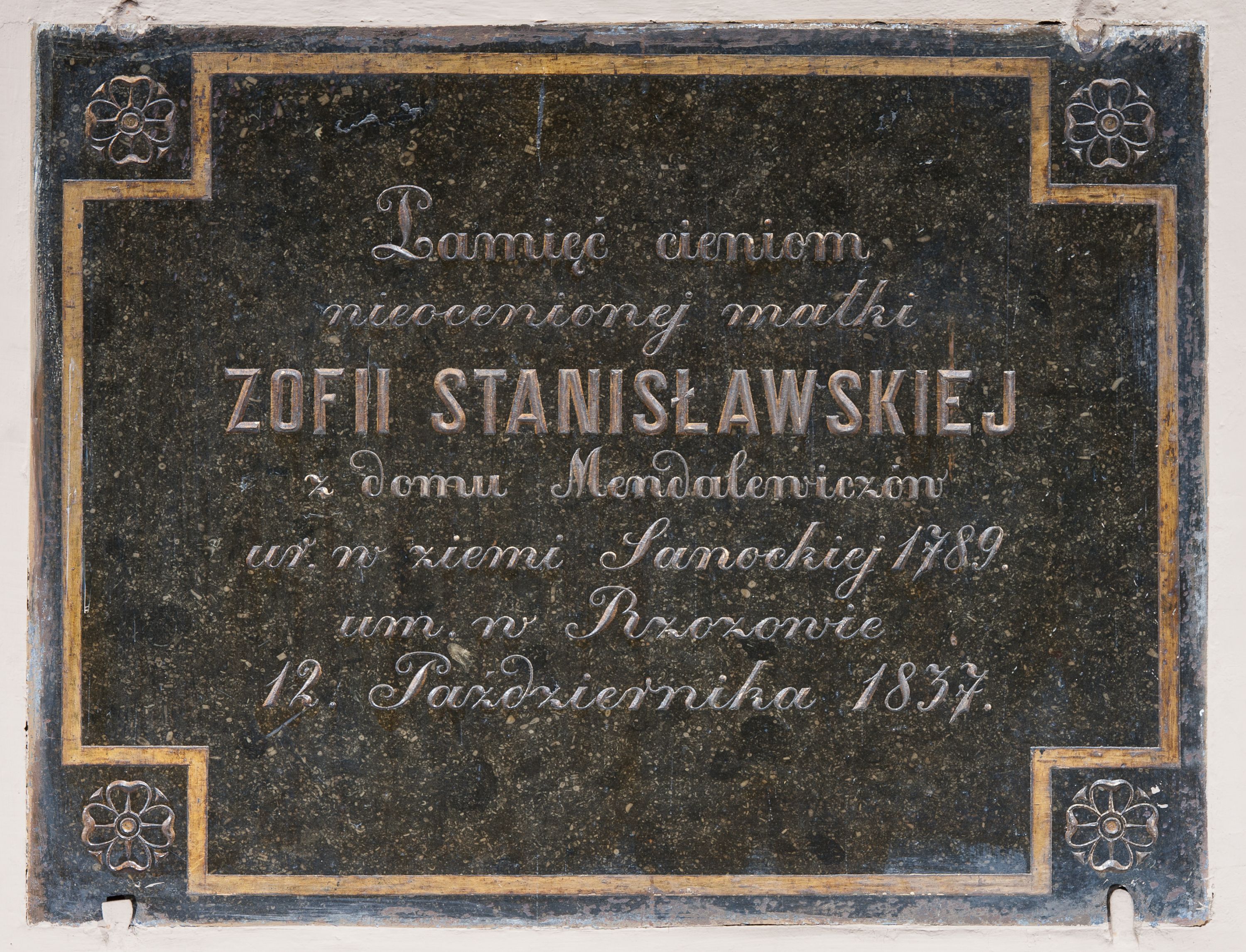Epitafium w kształcie leżącego prostokąta, obwiedziona złoconym profilem o wyciętych narożach wypełnionych rozetami. W polu inskrypcja: "Pamięci cieniom / nieocenionej matki / ZOFII STANISŁAWSKIEJ / z domu Mendalewiczów / ur(odzonej) w ziemi Sanockiej 1789. / um(arłej) w Rzozowie / 12. Października 1837."