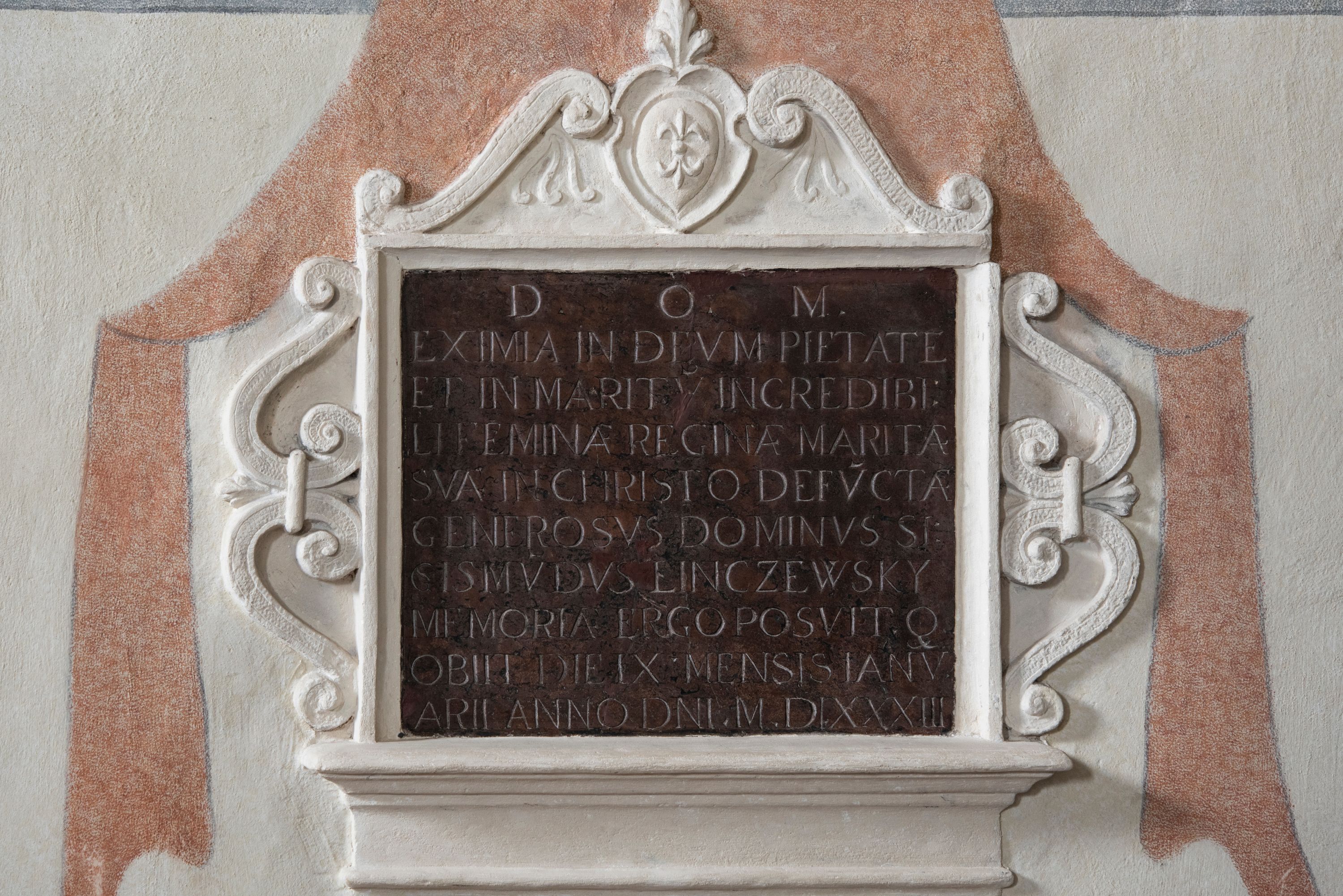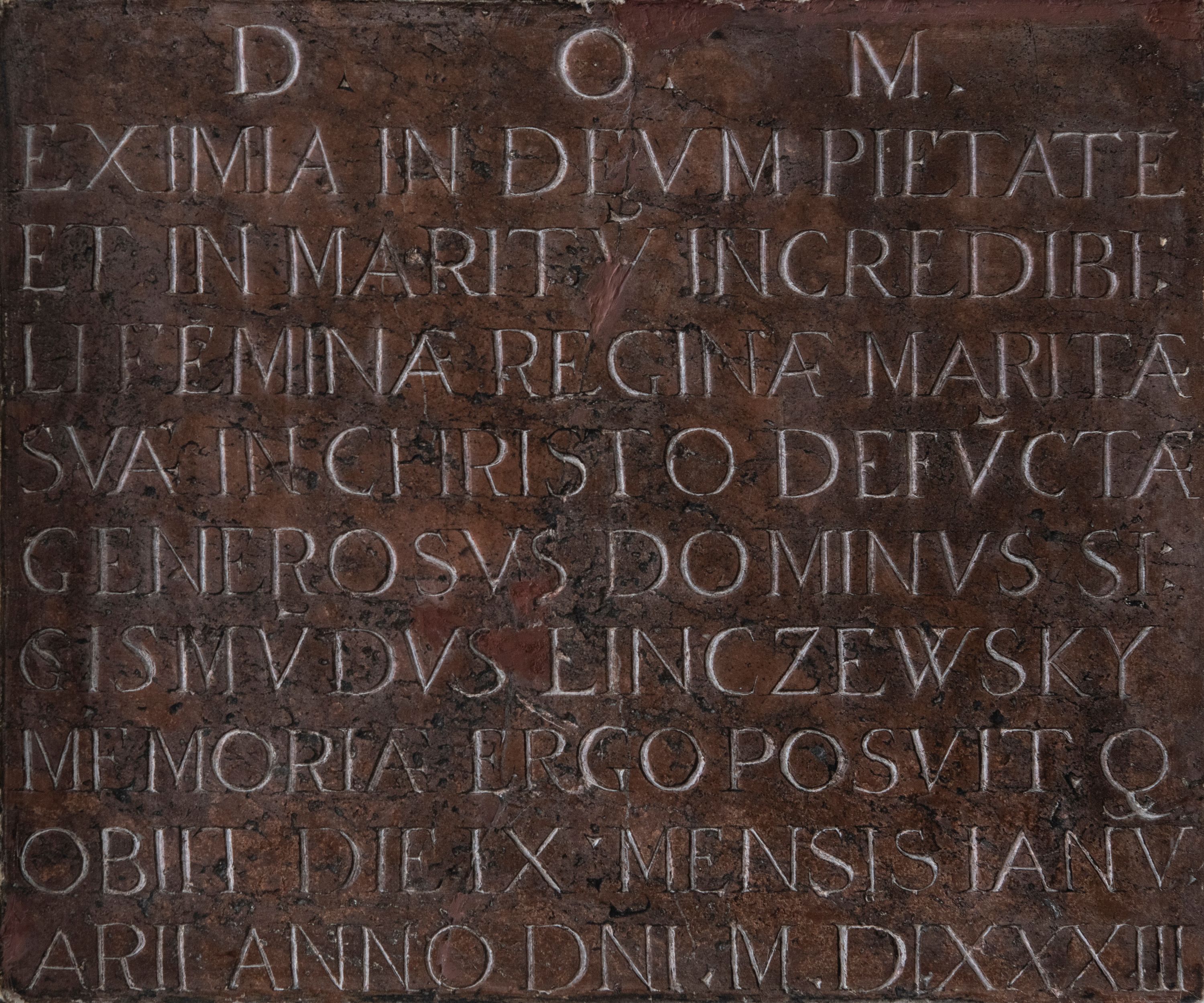Płyta marmurowa w formie leżącego prostokąta. Ujęta stiukową profilowaną ramą, z fragmentem gzymsu wzdłuż dolnej krawędzi, z uszakami w formie dwóch par spiętych esownic i zwieńczeniem z kartuszem z herbem Gozdawa flankowanym dwiema esownicami. W polu płyty inskrypcja: „D(EO) O(PTIMO) M(AXIMO) / EXIMIA IN DEVM PIETATE / ET IN MARITV INCREDIBI/LI FEMINAE REGINAE MARITAE / SVAE IN CHRISTO DEFV(N)CTAE / GENEROSVS DOMINVS SI/GISMV(N)DVS LINCZEWSKY / MEMORIAE ERGO POSVITQ(UE) / OBIIT DIE IX MENSIS JANV/ARII ANNO D(OMI)NI MDLXXXIII”.