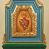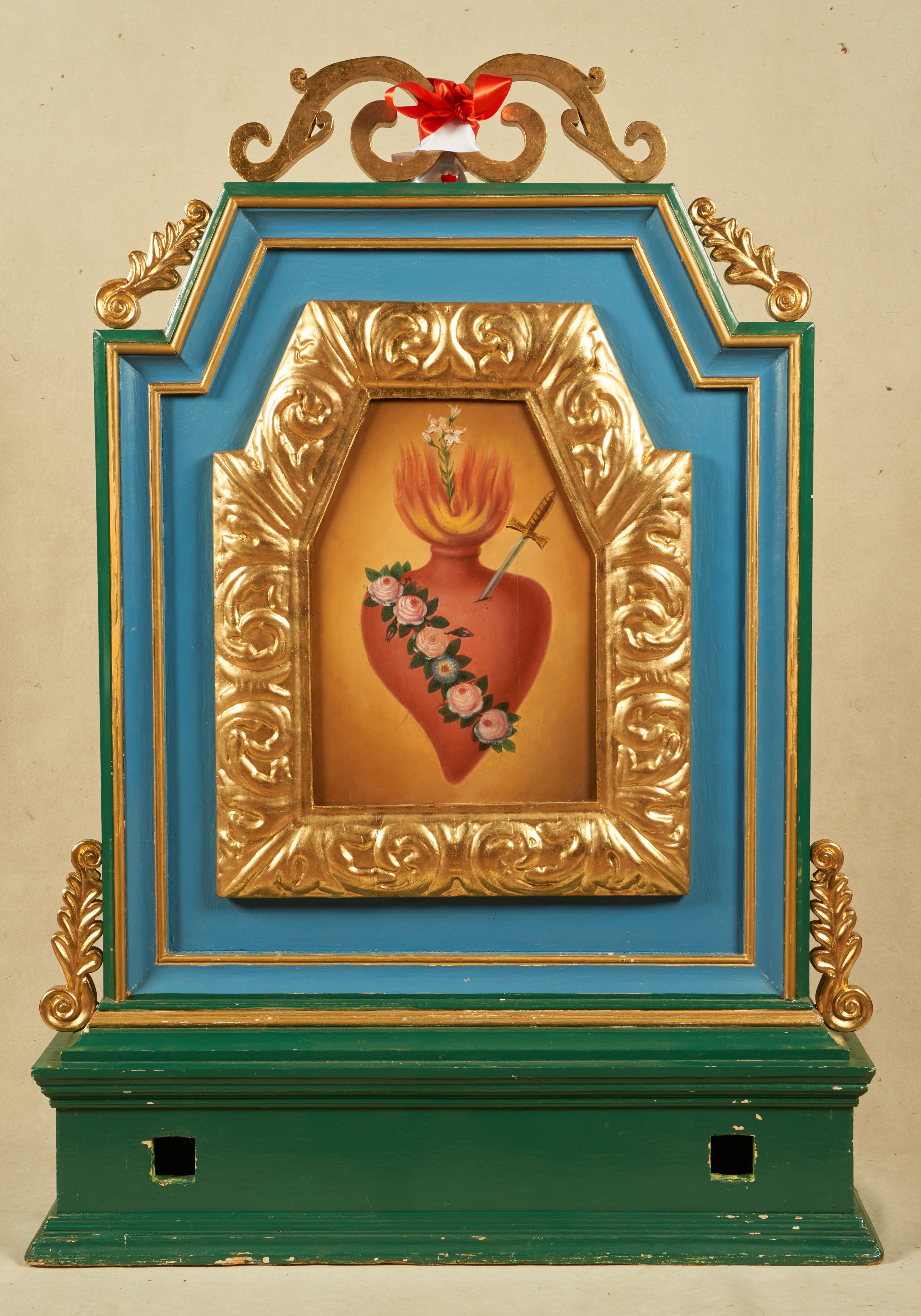 Obraz przedstawiający Najświętsze Serce Marii w kształcie stojącego prostokąta o ściętych górnych narożach. W centrum kompozycji znajduje się serce oplecione ukośnie wieńcem z róż i przebite z prawej strony na wylot mieczem, u góry zakończone płomieniami spośród których wyłania się gałązka białej lilii. Tło obrazu jest jasnobrązowe, rozświetlone wokół serca.