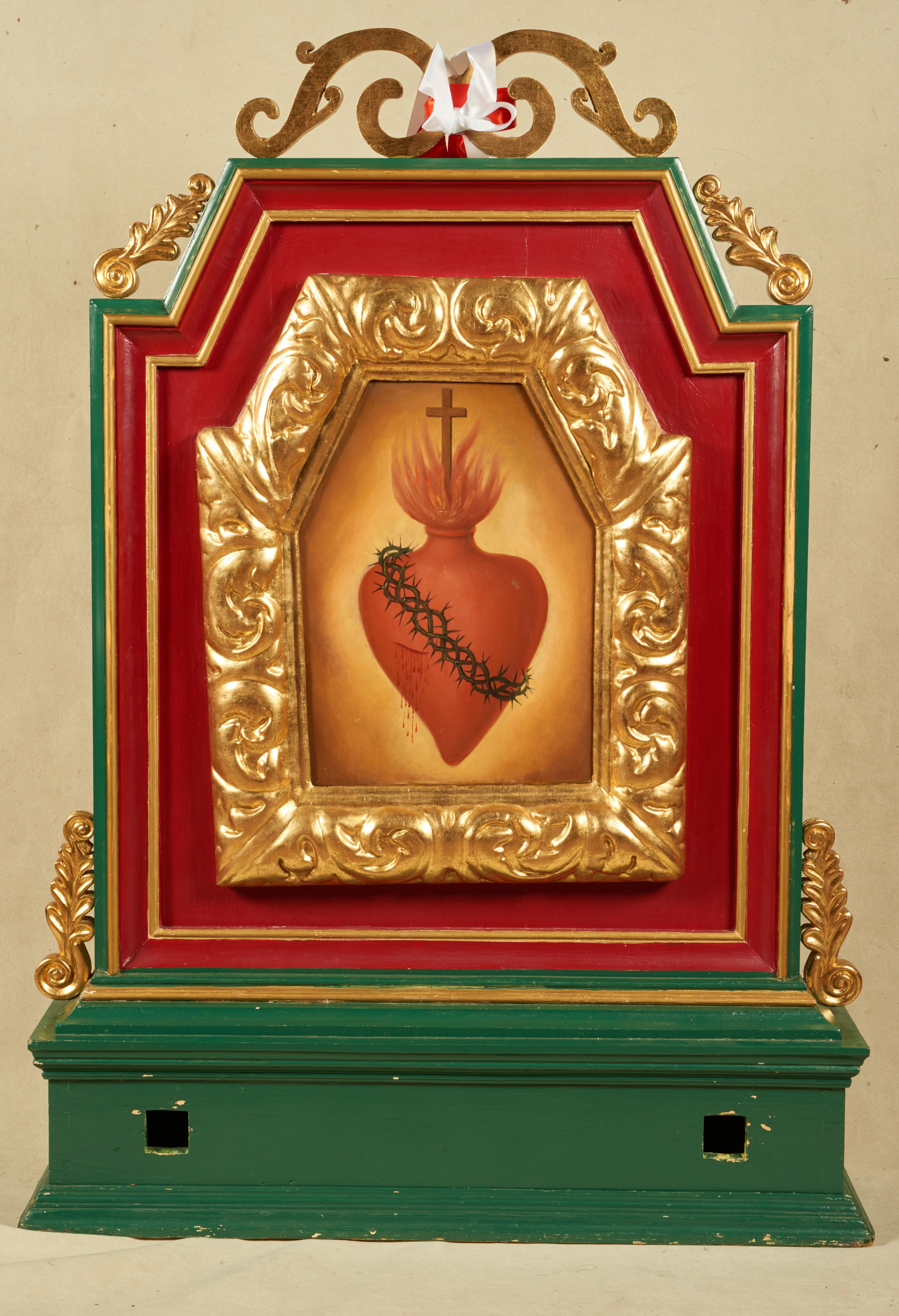 Po drugiej stronie feretronu znajduje się obraz Najświętszego Serca Jezusa, oplecionego ukośnie koroną cierniową, z raną po lewej stronie, z której obficie sączą się strużki krwi. Serce zakończone jest płomieniami, spośród których wyłania się krzyż. Tło obrazu jest jasnobrązowe, rozświetlone wokół serca.