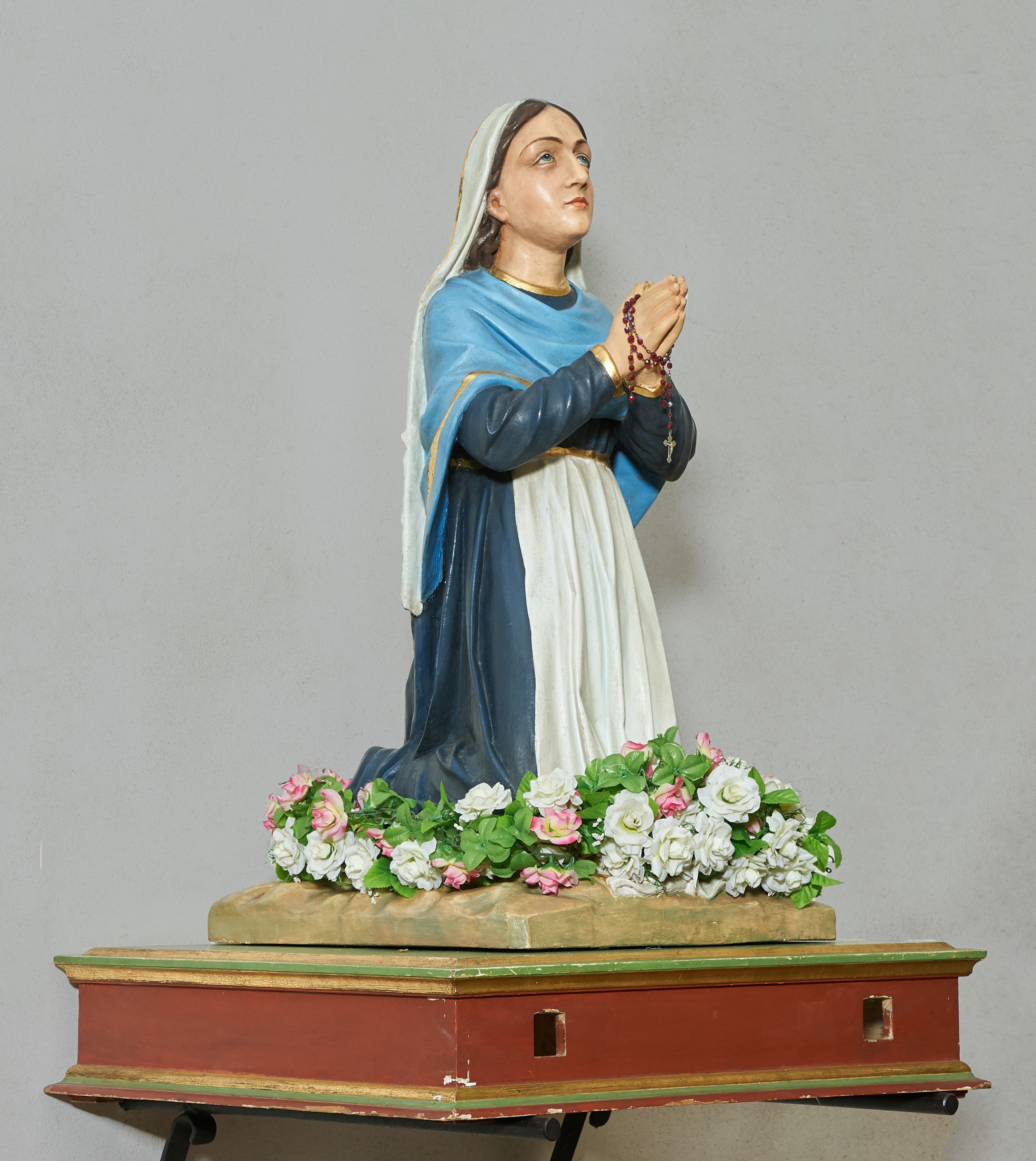 Rzeźba pełna, na podstawie imitującej skałę. Zamontowana na wysokiej podstawie na planie zbliżonym do kwadratu, o krawędziach ujętych profilowanymi listewkami, z dwoma otworami na drążki. Bernadeta ukazana w pozycji klęczącej, z rękami złożonymi w geście modlitwy, z lekko uniesioną głową. Twarz ma pociągłą, o migdałowatych oczach skierowanych w górę, dużym nosie i małych ustach; okoloną długimi brązowymi włosami opadającymi na plecy. Ubrana jest w granatową suknię, o złoconych lamówkach, przepasaną w talii białym fartuchem, na ramiona i plecy ma narzuconą niebieską chustę o złoconych lamówkach, na głowie ma biały welon. Polichromia ciała naturalistyczna. Wokół nóg figury zamocowane sztuczne kwiaty.