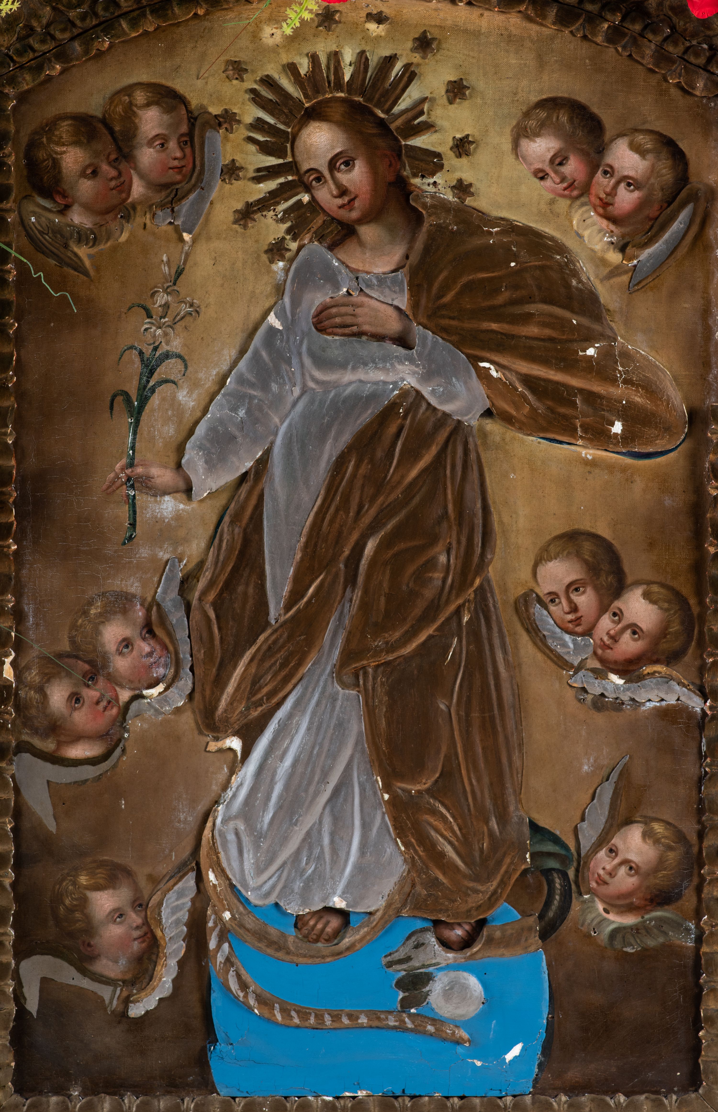 Zły. Obiekt wymaga konserwacji. Widoczne są przetarcia warstwy malarskiej, ubytki polichromii, wtórne przemalowania.