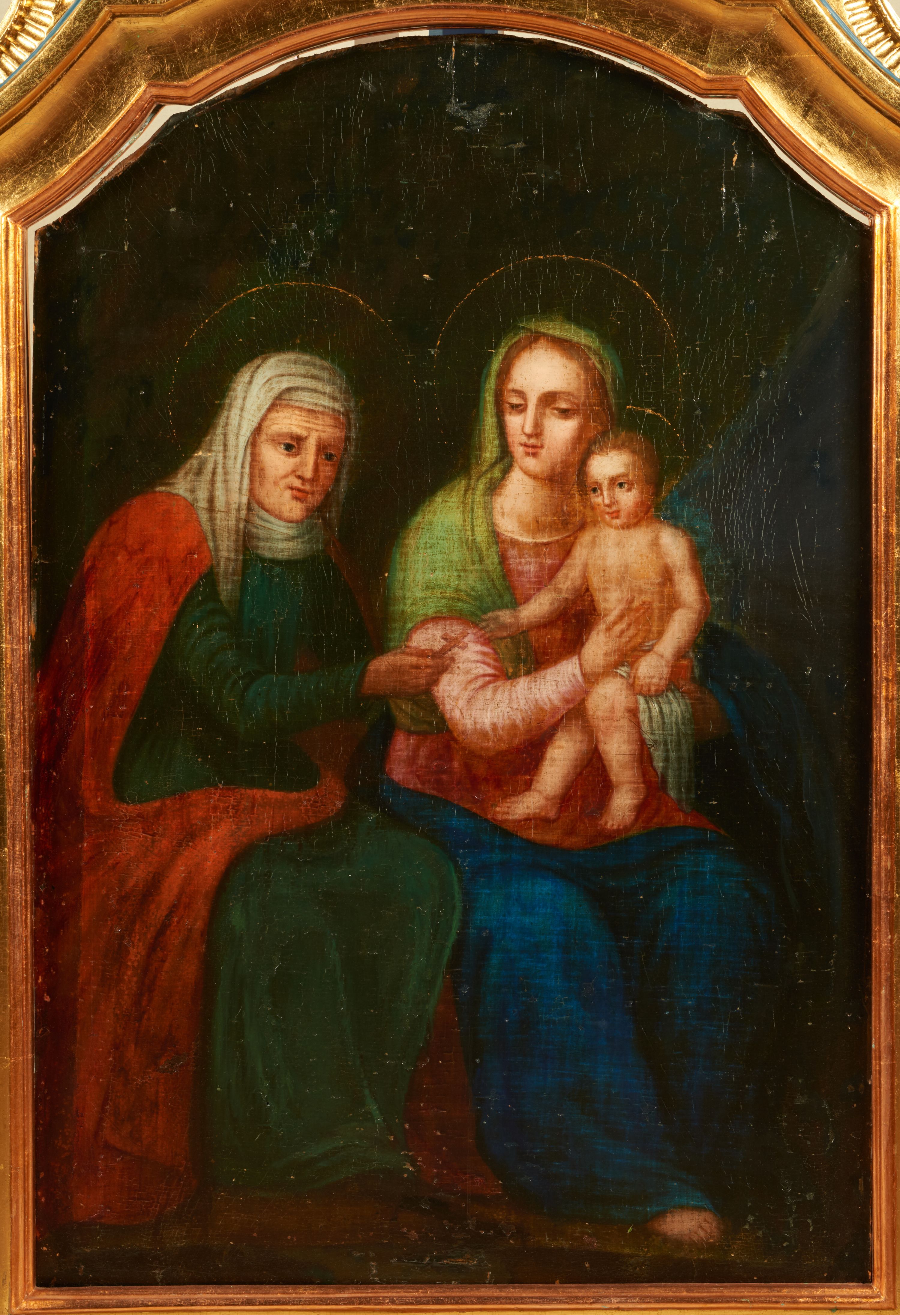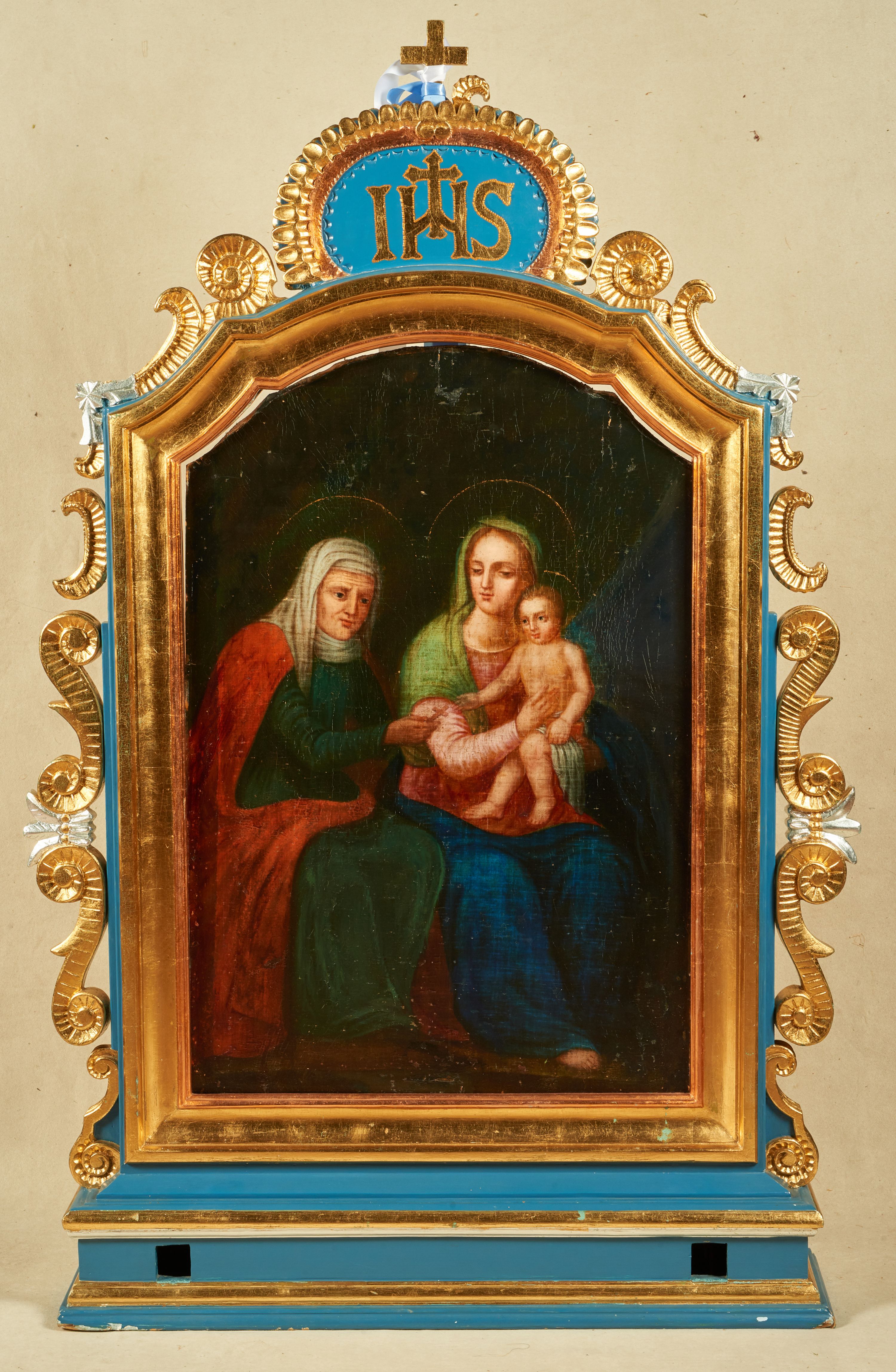Obraz przedstawiający św. Annę Samotrzeć w kształcie analogicznym do ramy. W centrum kompozycji ukazane zostały w pozycji siedzącej: po prawej stronie Matka Boska, a po lewej św. Anna, obie zwrócone trzy czwarte w lewo oraz mały Jezus siedzący na lewym ramieniu matki. Maria obiema rękami podtrzymuje Dzieciątko, a głowę zwraca w stronę św. Anny. Twarz pełna o wyraźnych rysach, migdałowych oczach, długim i szerokim nosie, drobnych ustach; włosy jasne, upięte z tyłu głowy. Maria ubrana jest w różową suknię, niebieski płaszcz oraz zielony welon założony na głowę i spływający na prawe ramię. Dzieciątko zwrócone jest trzy czwarte w prawo. Twarz okrągła o delikatnych rysach, włosy krótkie i kędzierzawe. Dzieciątko ubrane jest w białą i krótką pieluszkę wokół bioder. Święta Anna jest delikatnie pochylona w stronę Dzieciątka, prawą ręką podaje mu niewielki krzyżyk. Twarz szczupła o starczych rysach, podkreślonych cieniami oczach i długim nosie. Ubrana jest w zieloną suknię przepasaną w talii oraz czerwony płaszcz zarzucony na plecy; na głowie ma biały welon w podwiką. Wokół głów postaci okrągłe i złote nimby. Tło ciemne, po prawej stronie niebieska kotara.