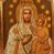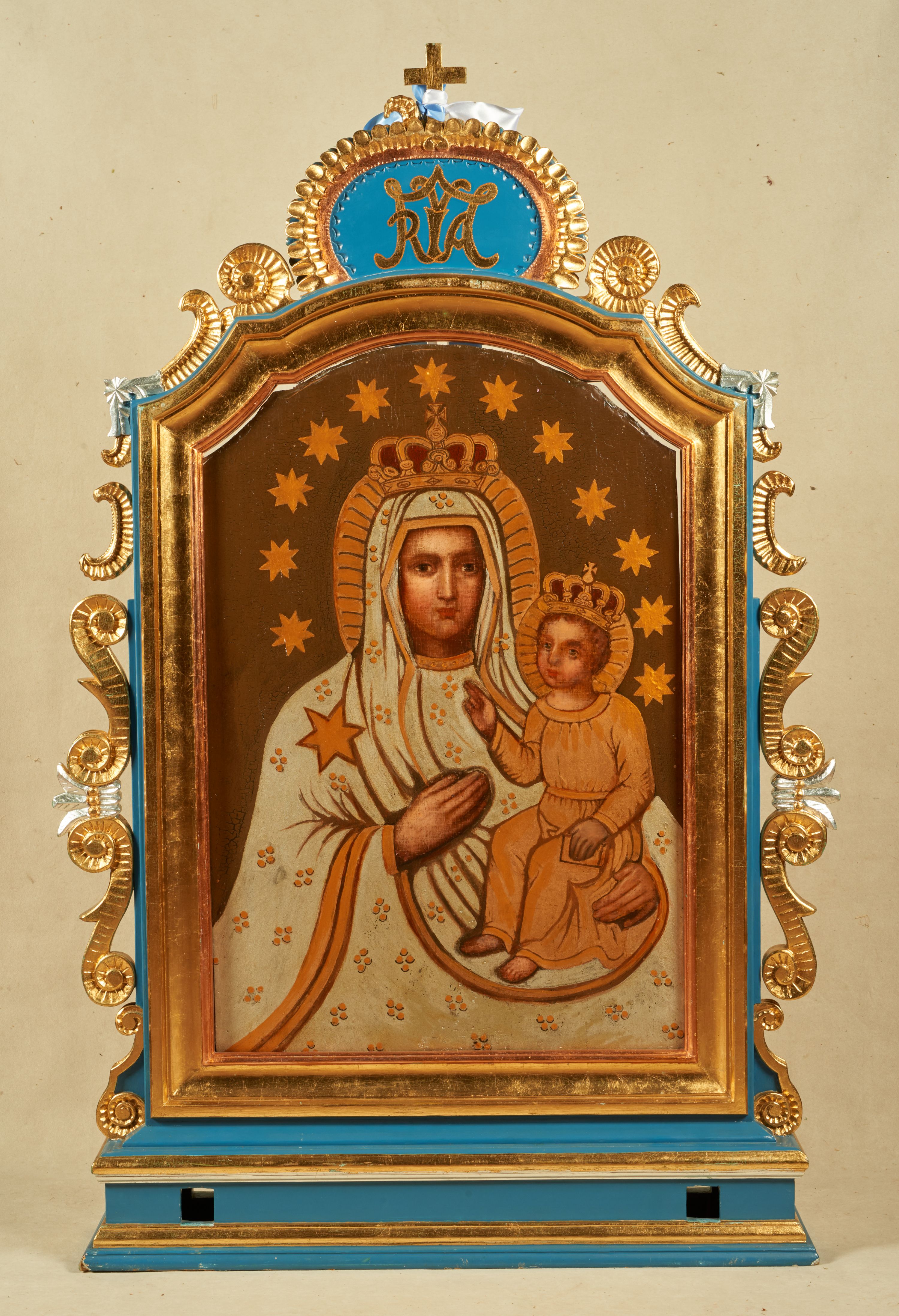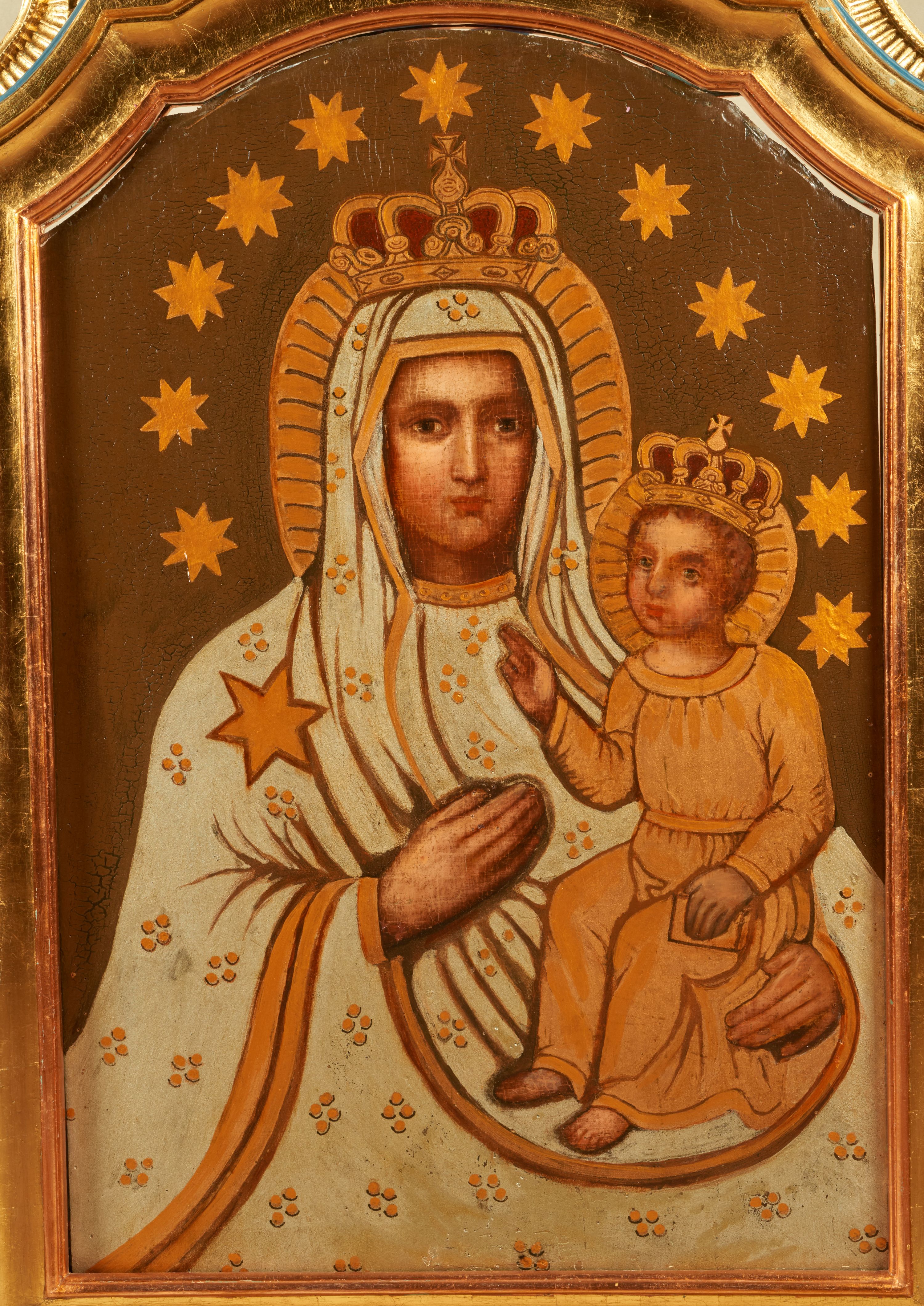 Po drugiej stronie feretronu obraz Matki Boskiej z Dzieciątkiem. W centrum kompozycji ukazana Maria w półpostaci z Dzieciątkiem Jezus na lewym ręku. Twarz Marii pełna o idealizowanych rysach z dużymi oczami, długim nosem i małymi ustami. Maria ubrana jest białą suknię oraz biały płaszcz. Szaty zdobione są gęsto kwiatami utworzonymi z czterech kropek, na prawym ramieniu Matki Boskiej duża gwiazda, na jej głowie zamknięta korona. Dzieciątko ukazane w pozycji siedzącej, zwrócone trzy czwarte w prawo z prawą ręką uniesioną w geście błogosławieństwa, a w lewej trzymające zamkniętą księgę. Ubrane jest w złotą sukienkę. Twarz o dziecięcych rysach, włosy kędzierzawe, na głowie pełna korona. Wokół głów Marii i Dzieciątka złote, puklowane nimby oraz otok z dwunastu gwiazd. Tło jednolite, brązowe.