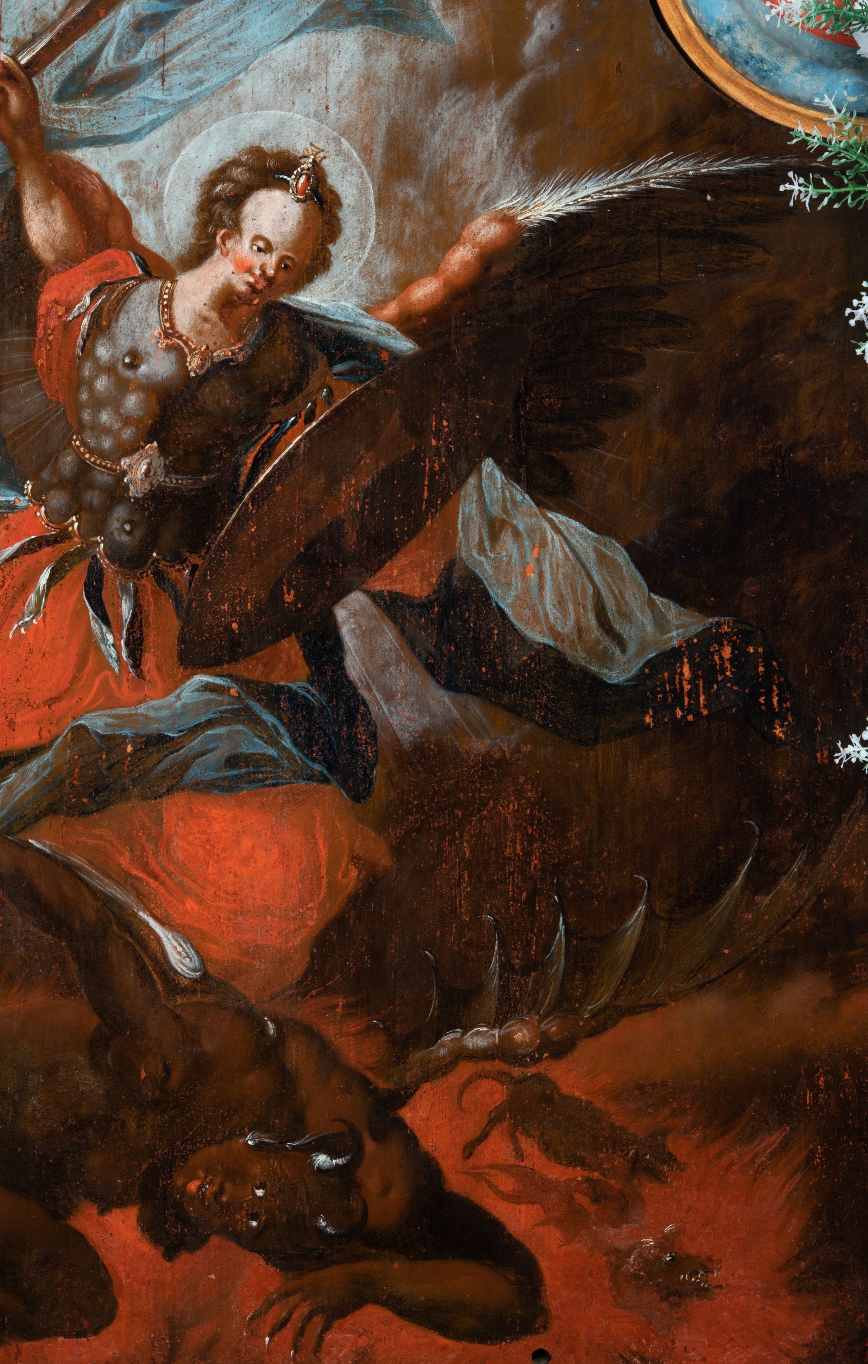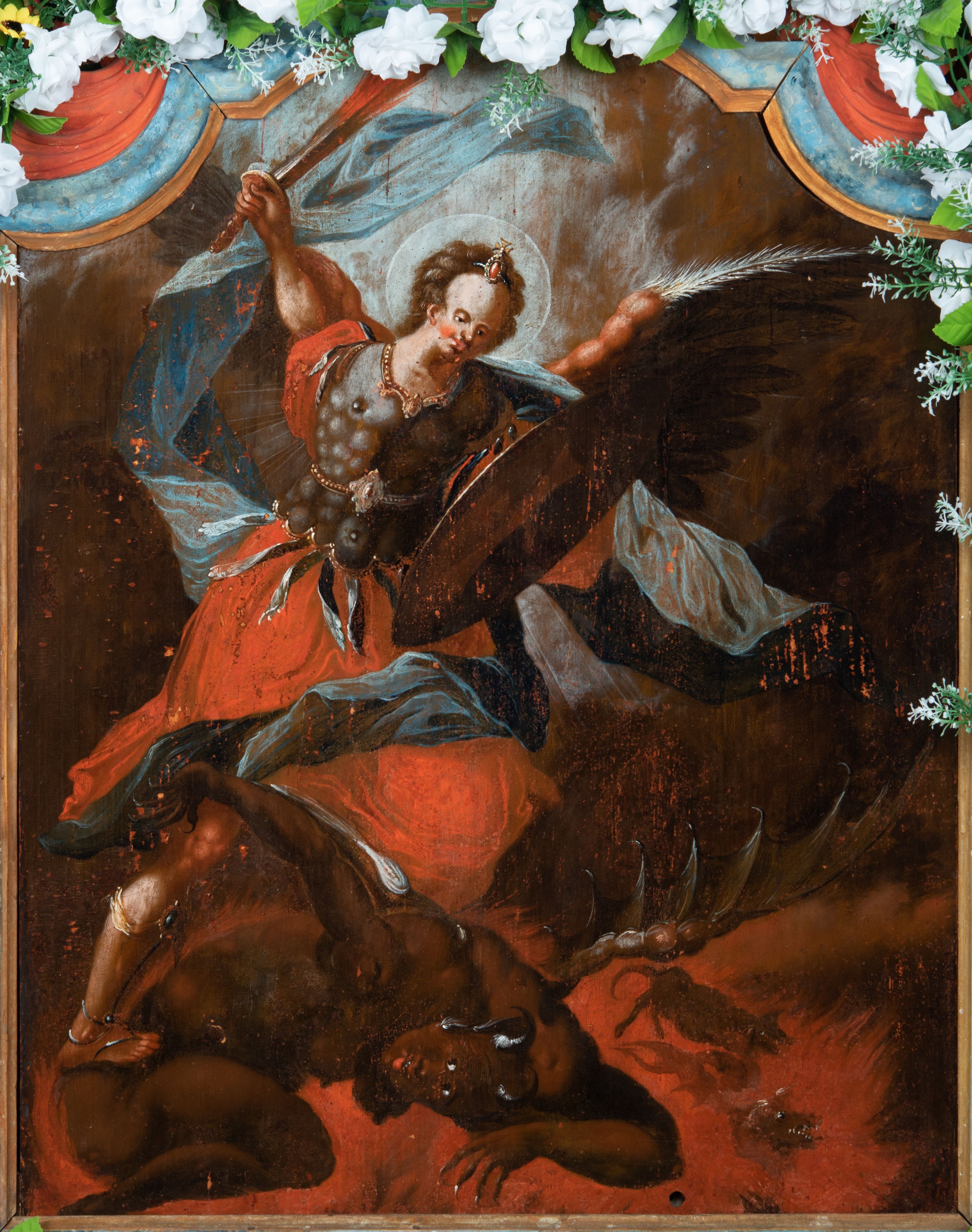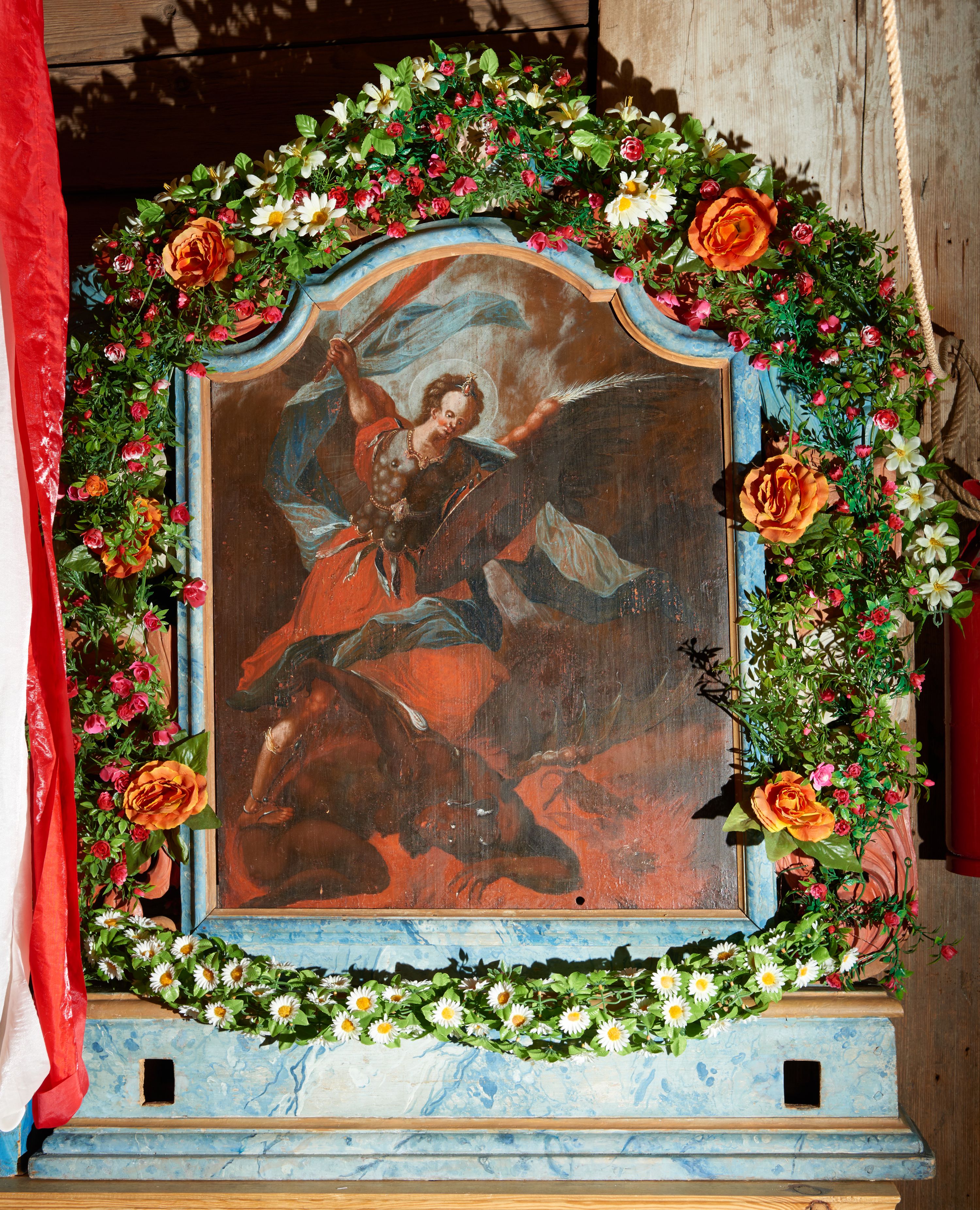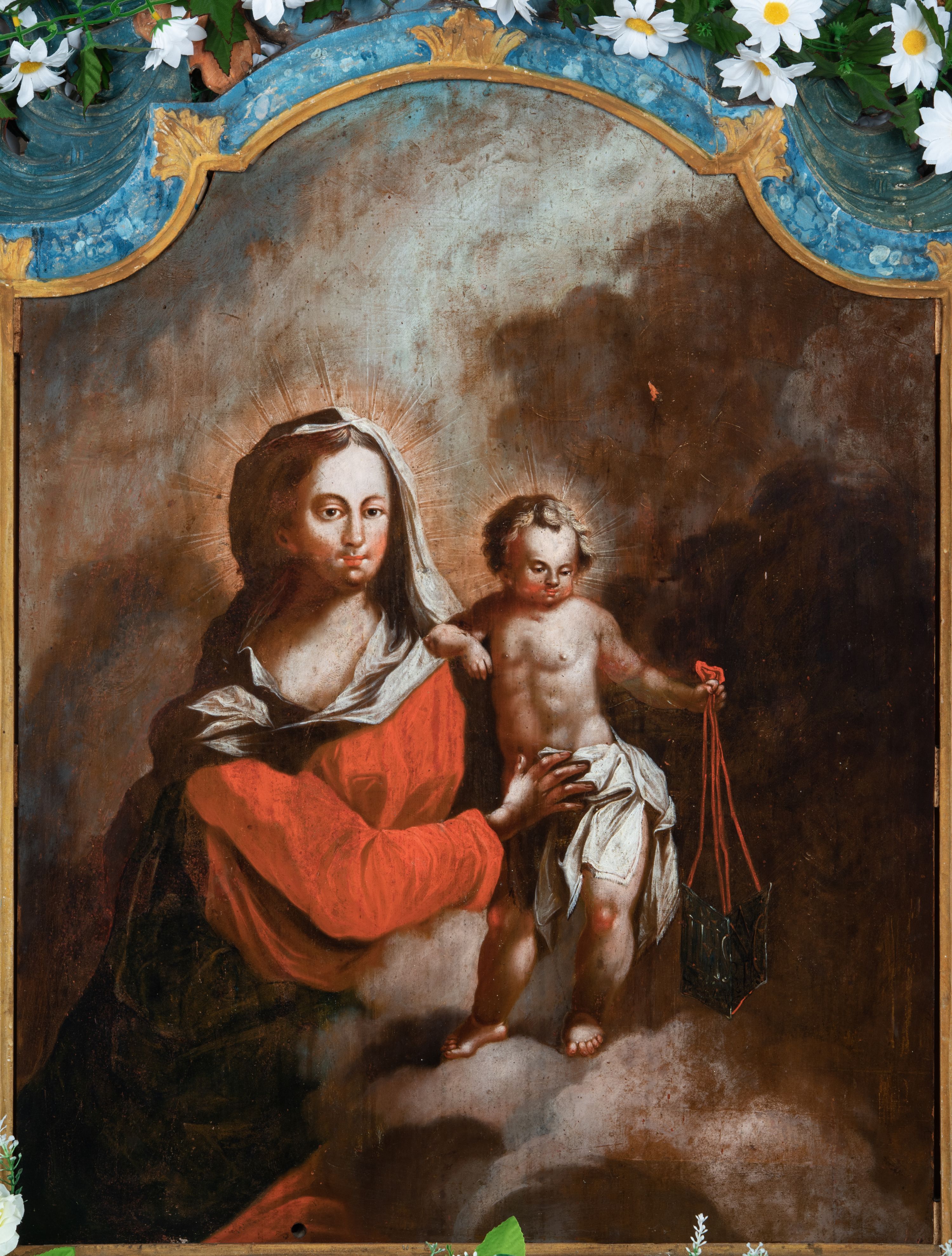 Obraz w kształcie stojącego prostokąta zwieńczonego łukiem wklęsło-wypukłym. Rama ażurowa z wici akantowej, zwieńczona główką anielską ze skrzydełkami. Obraz Matka Boska Szkaplerzna: w kształcie stojącego prostokąta zamkniętego łukiem wklęsło-wypukłym. Pośrodku Matka Boska, ukazana w półpostaci, podtrzymująca stojące na obłoku Dzieciątko. Maria zwrócona en trois quarts w lewo, prawą ręką przytrzymuje stojące obok Dzieciątko. Twarz owalna o wysokim czole, wyraźne rysy wydobyte światłocieniem, rumiane policzki; duży nos, usta niewielkie, pełne. Włosy brązowe, falowane, z przedziałkiem na środku głowy, ukryte pod welonem. Ubrana w czerwoną suknię z długimi rękawami, przez ramiona przerzucony płaszcz z obfita partią drapowanej tkaniny przy prawym boku. Na głowie biały welon zarzucony na ramiona. Dzieciatko zwrócone en trois quarts w prawo, w kontrapoście, prawym łokciem opiera się ramię Matki, w lewej, wyciągniętej trzyma szkaplerz z literami: IHS. Twarz pełna o pucułowatych, rumianych policzkach, dużym czole, niewielkie oczy spoglądające w dół, zadarty nosek. Włosy krótkie, jasne, kręcone. Ciało o wydatnej muskulaturze, wydobytej światłocieniem. Przez biodra przewiązana biała pieluszka, ze zwisem tkaniny przy lewym boku. Postacie ukazane na tle kłębiastych, ciemnych chmur , rozświetlonych w górnej partii obrazu i u spodu Dzieciatka. Kolorystyka ciepła, nasycona. Plastyka wydobyta światłocieniem, o delikatnych przejściach tonalnych, ciała rozświetlone, laserunki. Obraz św. Michał Archanioł: W centrum obrazu całopostaciowe przedstawienie św. Michała Archanioła pokonującego szatana. Archanioł zwrócony en trois quarts w lewo, w dużym wykroku, w lewej ręce, przed piersią, dzierży tarczę, w prawej, uniesionej w górę, trzyma płomienisty miecz. Twarz owalna, z dużym czołem, oczy głęboko osadzone, mały nos, rumiane lica. Włosy krótkie, gęste, kręcone. Na głowie diadem. Ubrany w czerwoną, rozwianą u spodu tunikę, sięgającą kolan oraz zbroję torsową , bogato dekorowaną, z frędzlami. Postać otoczona rozwianym pasem niebieskiego, zawijającego się płaszcza. Na nogach wysokie sandały. Skrzydła duże, rozpostarte.