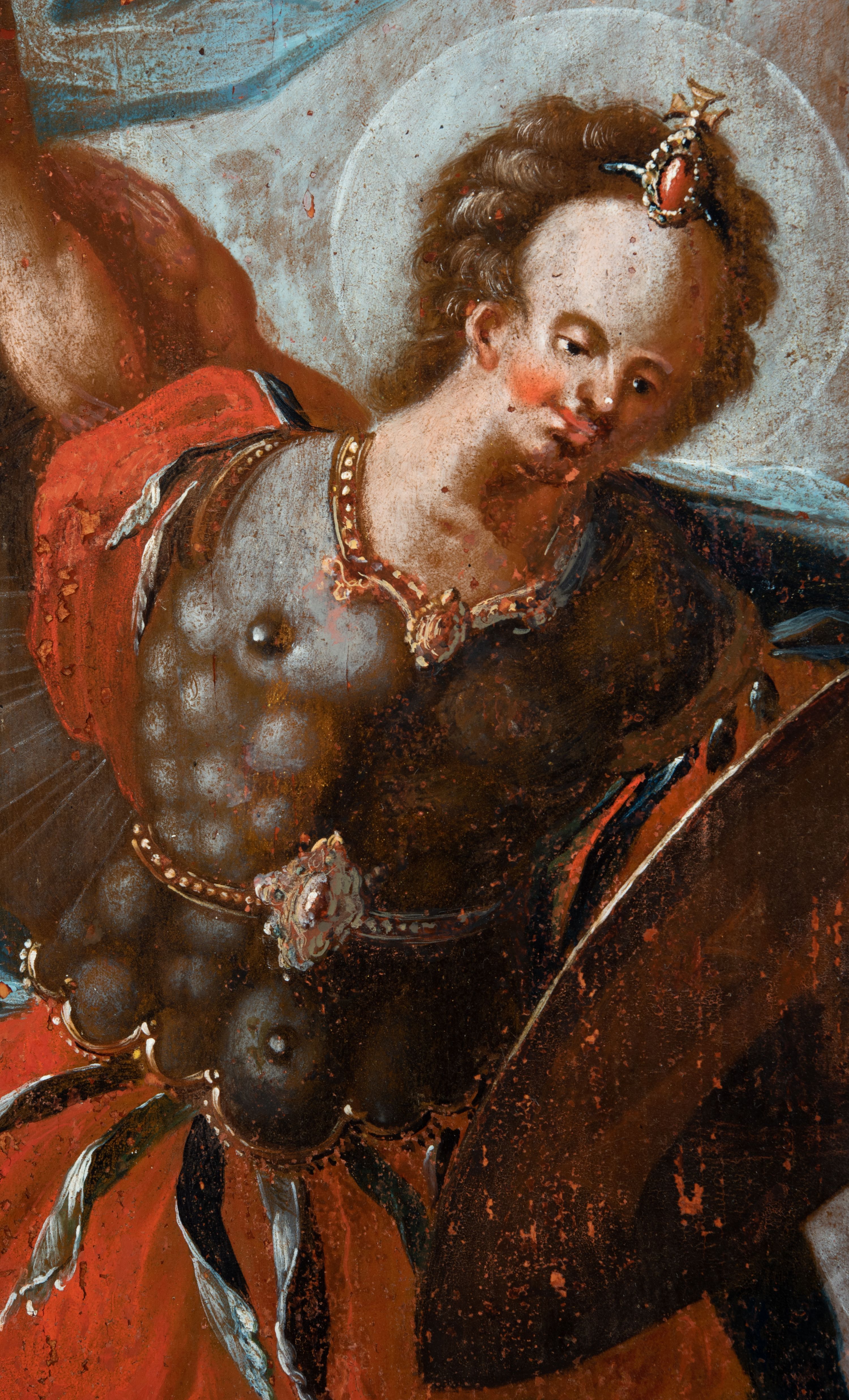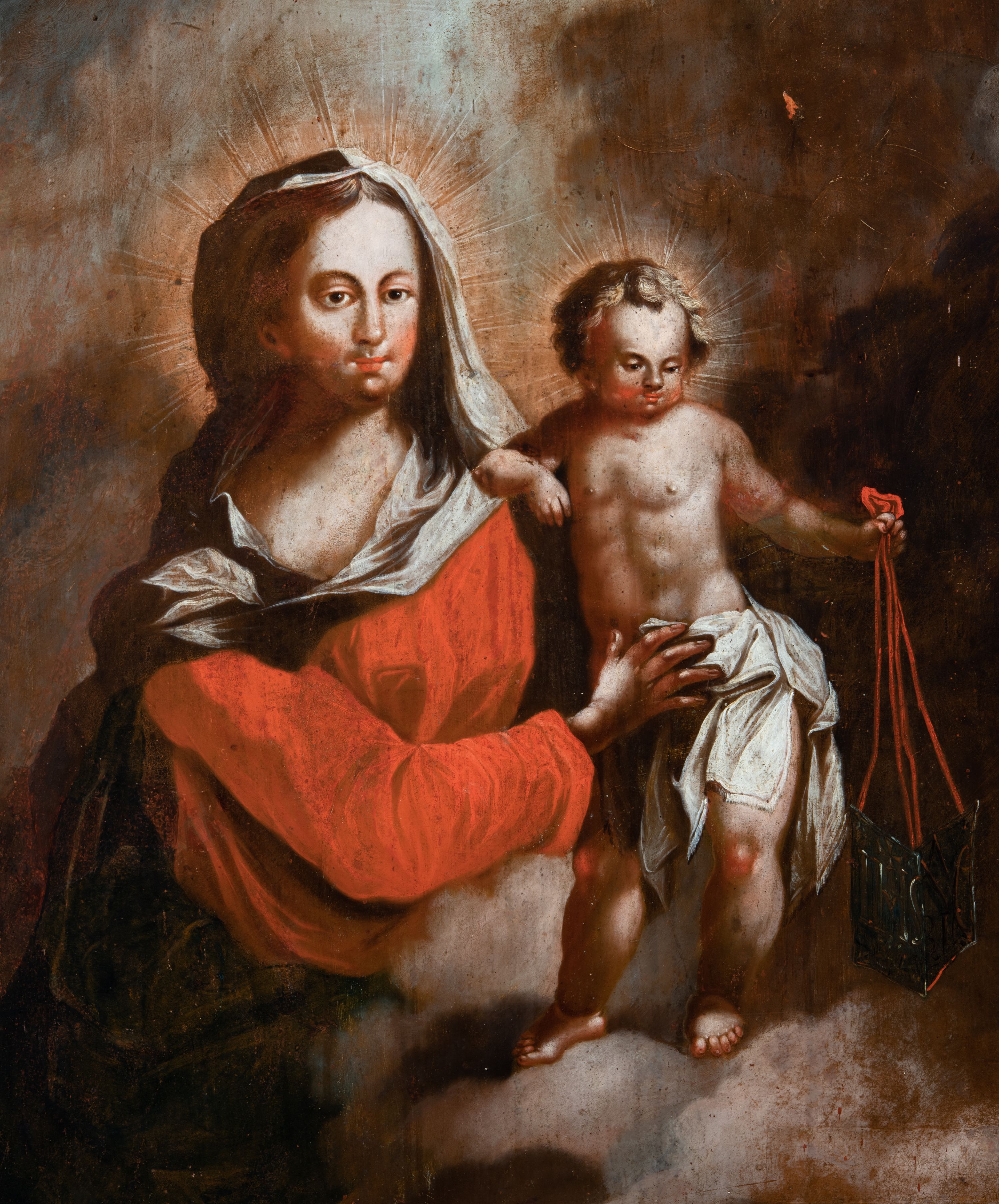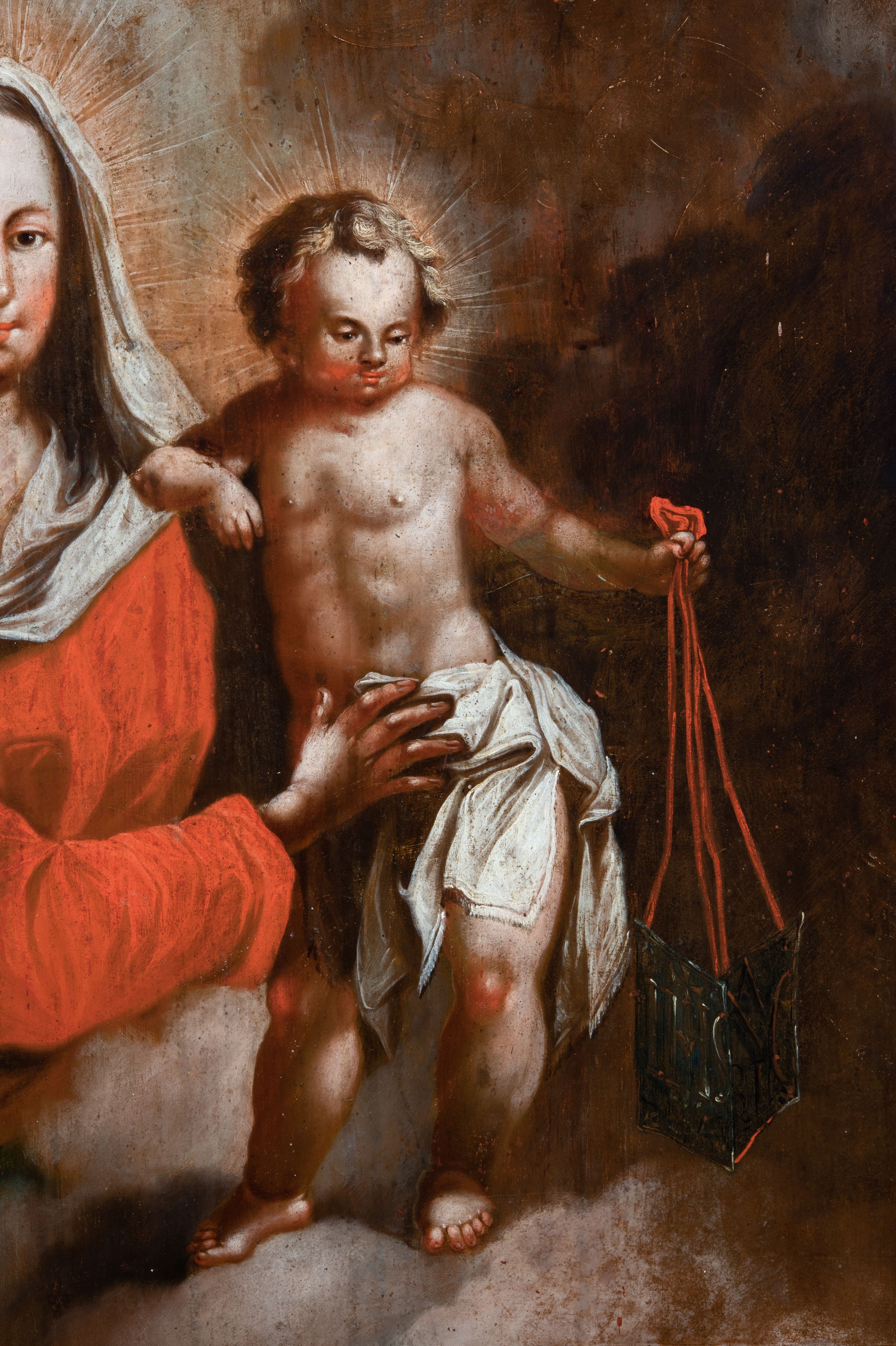 Obraz w kształcie stojącego prostokąta zwieńczonego łukiem wklęsło-wypukłym. Rama ażurowa z wici akantowej, zwieńczona główką anielską ze skrzydełkami. Obraz Matka Boska Szkaplerzna: w kształcie stojącego prostokąta zamkniętego łukiem wklęsło-wypukłym. Pośrodku Matka Boska, ukazana w półpostaci, podtrzymująca stojące na obłoku Dzieciątko. Maria zwrócona en trois quarts w lewo, prawą ręką przytrzymuje stojące obok Dzieciątko. Twarz owalna o wysokim czole, wyraźne rysy wydobyte światłocieniem, rumiane policzki; duży nos, usta niewielkie, pełne. Włosy brązowe, falowane, z przedziałkiem na środku głowy, ukryte pod welonem. Ubrana w czerwoną suknię z długimi rękawami, przez ramiona przerzucony płaszcz z obfita partią drapowanej tkaniny przy prawym boku. Na głowie biały welon zarzucony na ramiona. Dzieciatko zwrócone en trois quarts w prawo, w kontrapoście, prawym łokciem opiera się ramię Matki, w lewej, wyciągniętej trzyma szkaplerz z literami: IHS. Twarz pełna o pucułowatych, rumianych policzkach, dużym czole, niewielkie oczy spoglądające w dół, zadarty nosek. Włosy krótkie, jasne, kręcone. Ciało o wydatnej muskulaturze, wydobytej światłocieniem. Przez biodra przewiązana biała pieluszka, ze zwisem tkaniny przy lewym boku. Postacie ukazane na tle kłębiastych, ciemnych chmur , rozświetlonych w górnej partii obrazu i u spodu Dzieciatka. Kolorystyka ciepła, nasycona. Plastyka wydobyta światłocieniem, o delikatnych przejściach tonalnych, ciała rozświetlone, laserunki. Obraz św. Michał Archanioł: W centrum obrazu całopostaciowe przedstawienie św. Michała Archanioła pokonującego szatana. Archanioł zwrócony en trois quarts w lewo, w dużym wykroku, w lewej ręce, przed piersią, dzierży tarczę, w prawej, uniesionej w górę, trzyma płomienisty miecz. Twarz owalna, z dużym czołem, oczy głęboko osadzone, mały nos, rumiane lica. Włosy krótkie, gęste, kręcone. Na głowie diadem. Ubrany w czerwoną, rozwianą u spodu tunikę, sięgającą kolan oraz zbroję torsową , bogato dekorowaną, z frędzlami. Postać otoczona rozwianym pasem niebieskiego, zawijającego się płaszcza. Na nogach wysokie sandały. Skrzydła duże, rozpostarte.