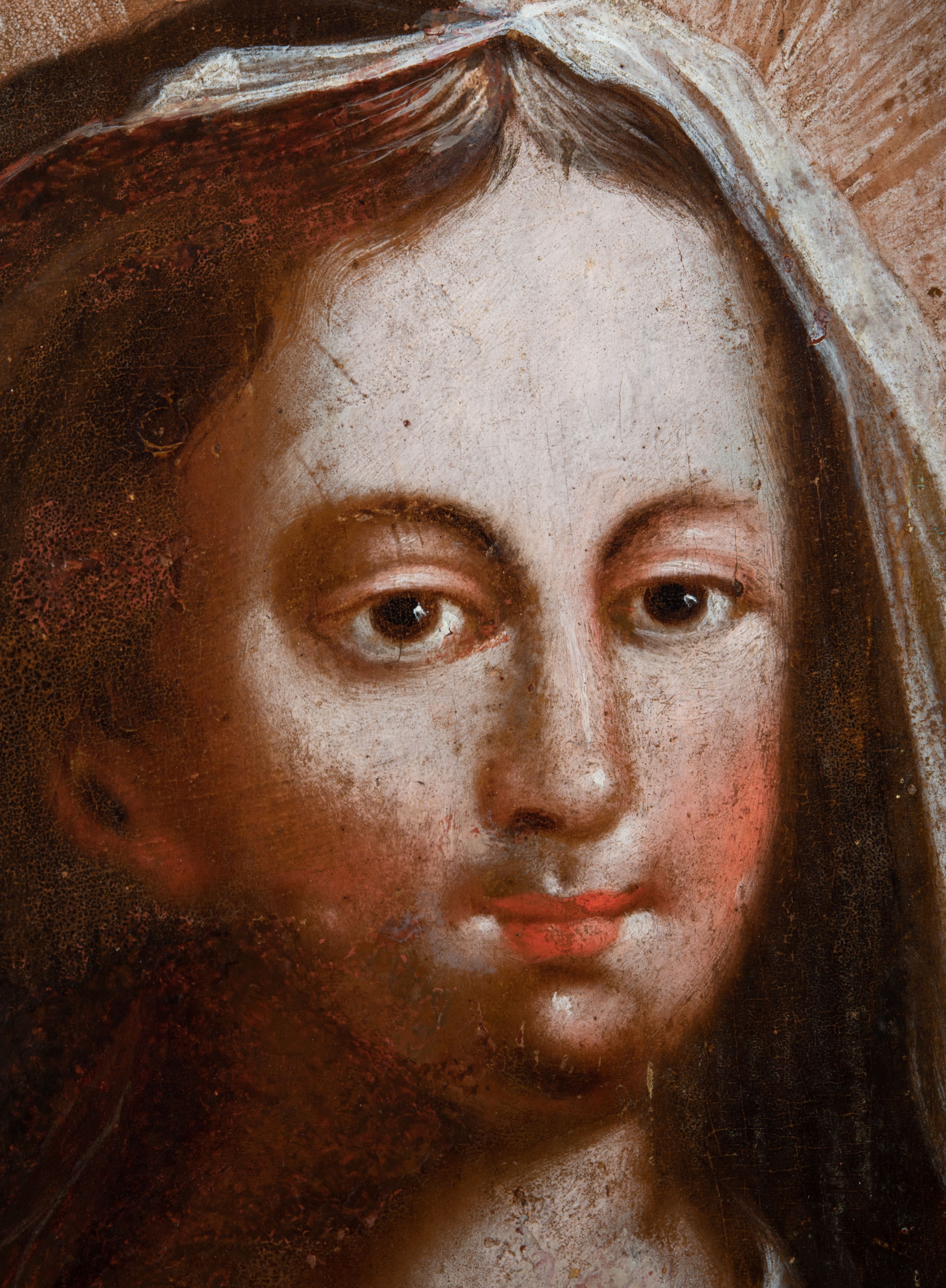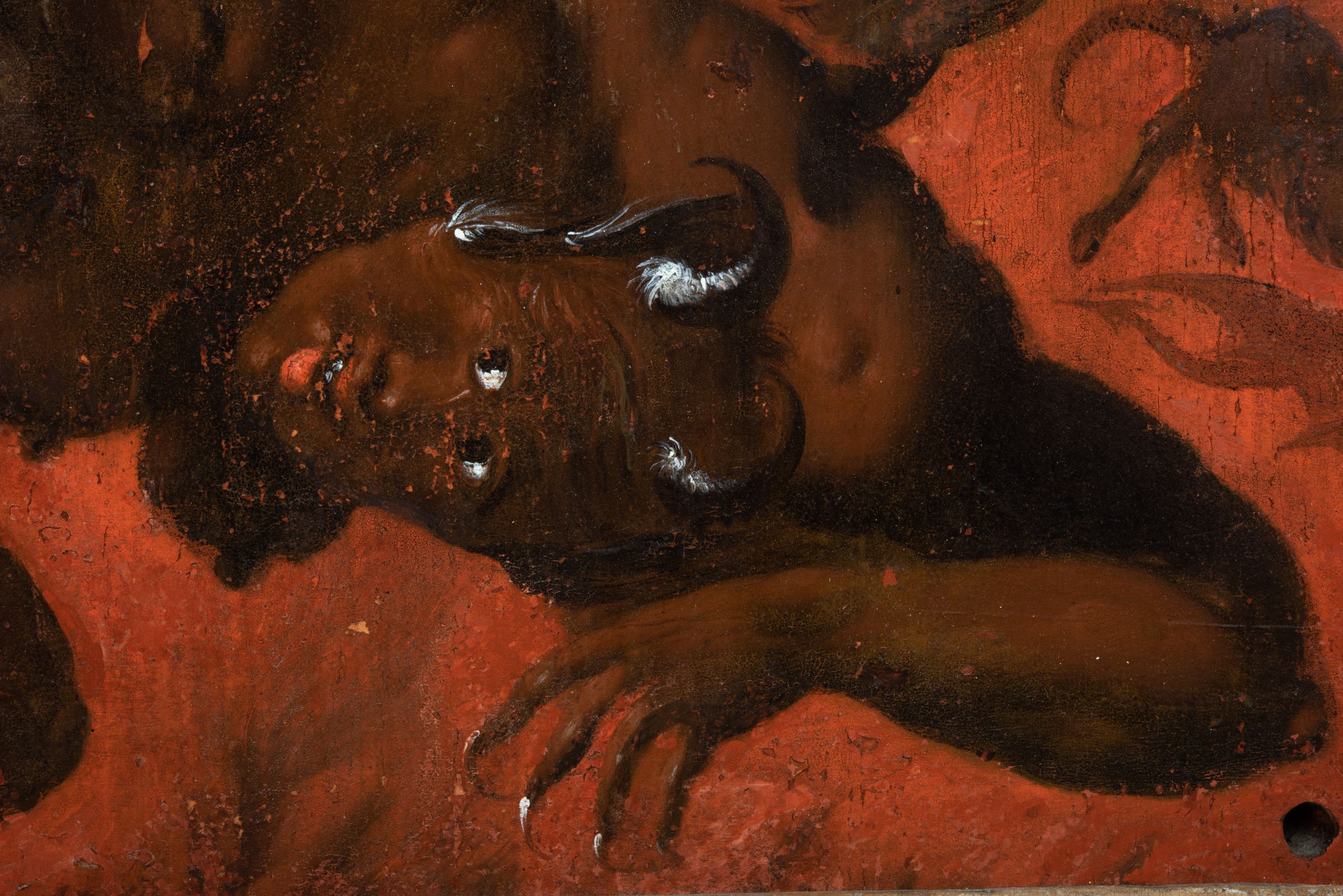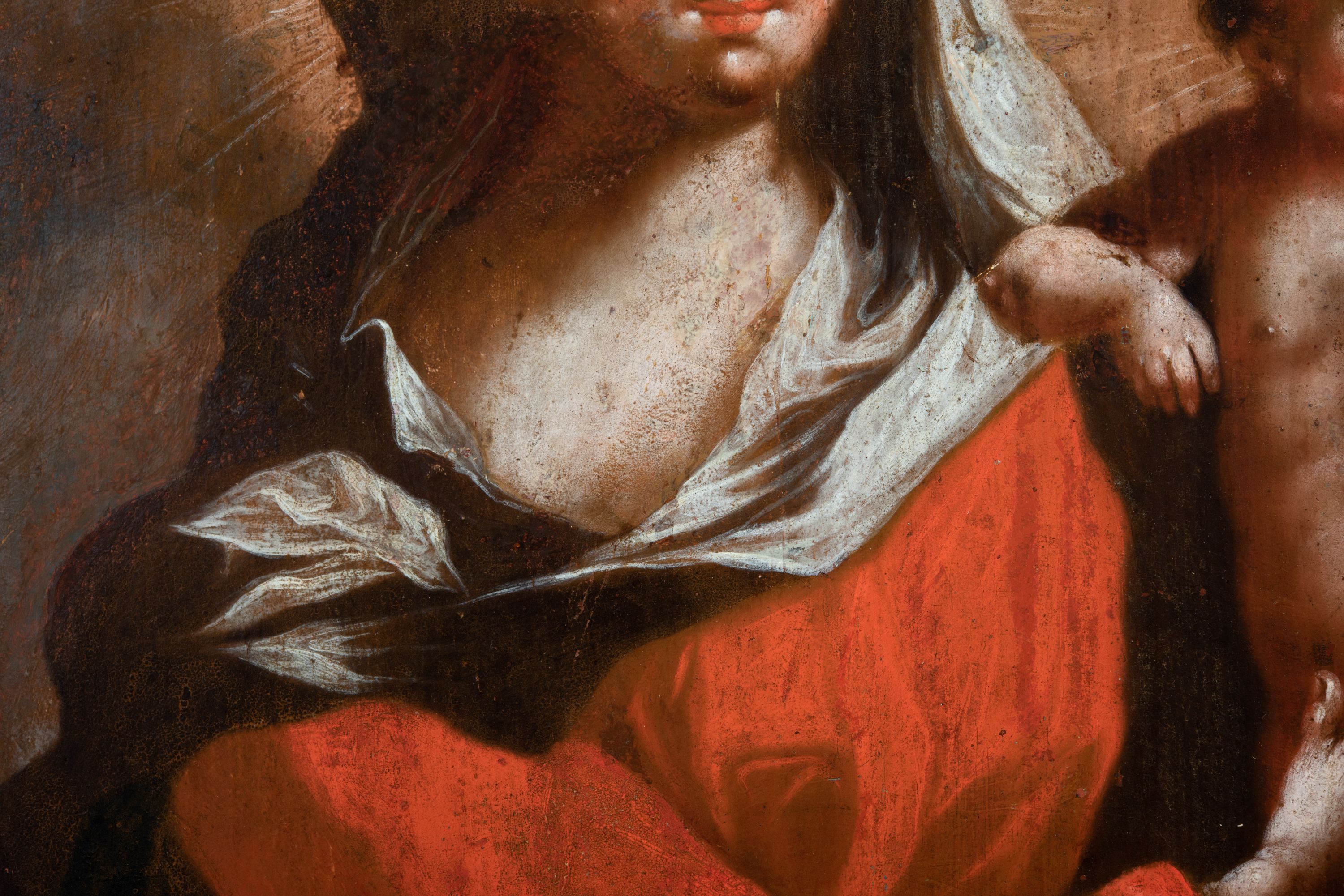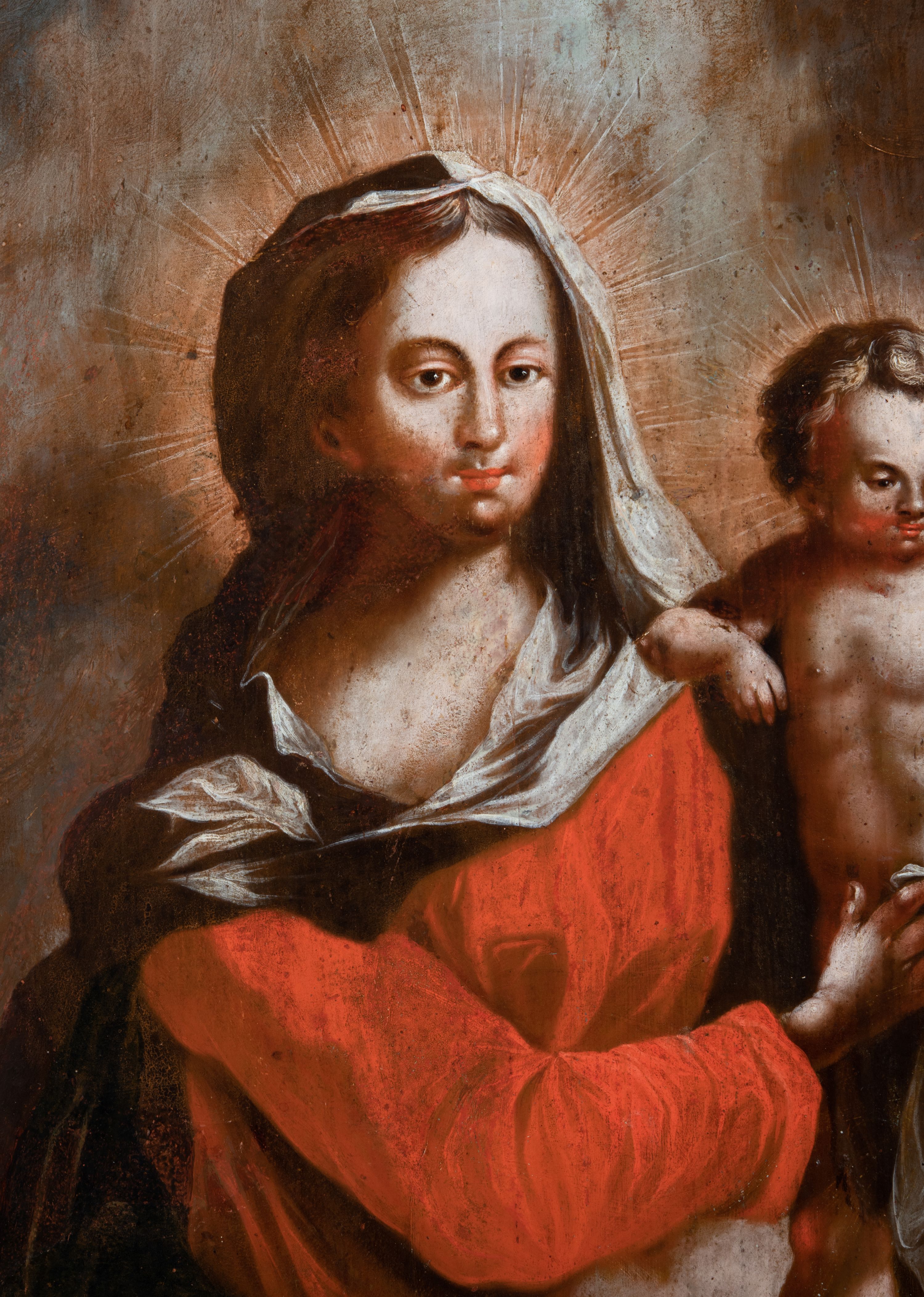 Obraz w kształcie stojącego prostokąta zwieńczonego łukiem wklęsło-wypukłym. Rama ażurowa z wici akantowej, zwieńczona główką anielską ze skrzydełkami. Obraz Matka Boska Szkaplerzna: w kształcie stojącego prostokąta zamkniętego łukiem wklęsło-wypukłym. Pośrodku Matka Boska, ukazana w półpostaci, podtrzymująca stojące na obłoku Dzieciątko. Maria zwrócona en trois quarts w lewo, prawą ręką przytrzymuje stojące obok Dzieciątko. Twarz owalna o wysokim czole, wyraźne rysy wydobyte światłocieniem, rumiane policzki; duży nos, usta niewielkie, pełne. Włosy brązowe, falowane, z przedziałkiem na środku głowy, ukryte pod welonem. Ubrana w czerwoną suknię z długimi rękawami, przez ramiona przerzucony płaszcz z obfita partią drapowanej tkaniny przy prawym boku. Na głowie biały welon zarzucony na ramiona. Dzieciatko zwrócone en trois quarts w prawo, w kontrapoście, prawym łokciem opiera się ramię Matki, w lewej, wyciągniętej trzyma szkaplerz z literami: IHS. Twarz pełna o pucułowatych, rumianych policzkach, dużym czole, niewielkie oczy spoglądające w dół, zadarty nosek. Włosy krótkie, jasne, kręcone. Ciało o wydatnej muskulaturze, wydobytej światłocieniem. Przez biodra przewiązana biała pieluszka, ze zwisem tkaniny przy lewym boku. Postacie ukazane na tle kłębiastych, ciemnych chmur , rozświetlonych w górnej partii obrazu i u spodu Dzieciatka. Kolorystyka ciepła, nasycona. Plastyka wydobyta światłocieniem, o delikatnych przejściach tonalnych, ciała rozświetlone, laserunki. Obraz św. Michał Archanioł: W centrum obrazu całopostaciowe przedstawienie św. Michała Archanioła pokonującego szatana. Archanioł zwrócony en trois quarts w lewo, w dużym wykroku, w lewej ręce, przed piersią, dzierży tarczę, w prawej, uniesionej w górę, trzyma płomienisty miecz. Twarz owalna, z dużym czołem, oczy głęboko osadzone, mały nos, rumiane lica. Włosy krótkie, gęste, kręcone. Na głowie diadem. Ubrany w czerwoną, rozwianą u spodu tunikę, sięgającą kolan oraz zbroję torsową , bogato dekorowaną, z frędzlami. Postać otoczona rozwianym pasem niebieskiego, zawijającego się płaszcza. Na nogach wysokie sandały. Skrzydła duże, rozpostarte.