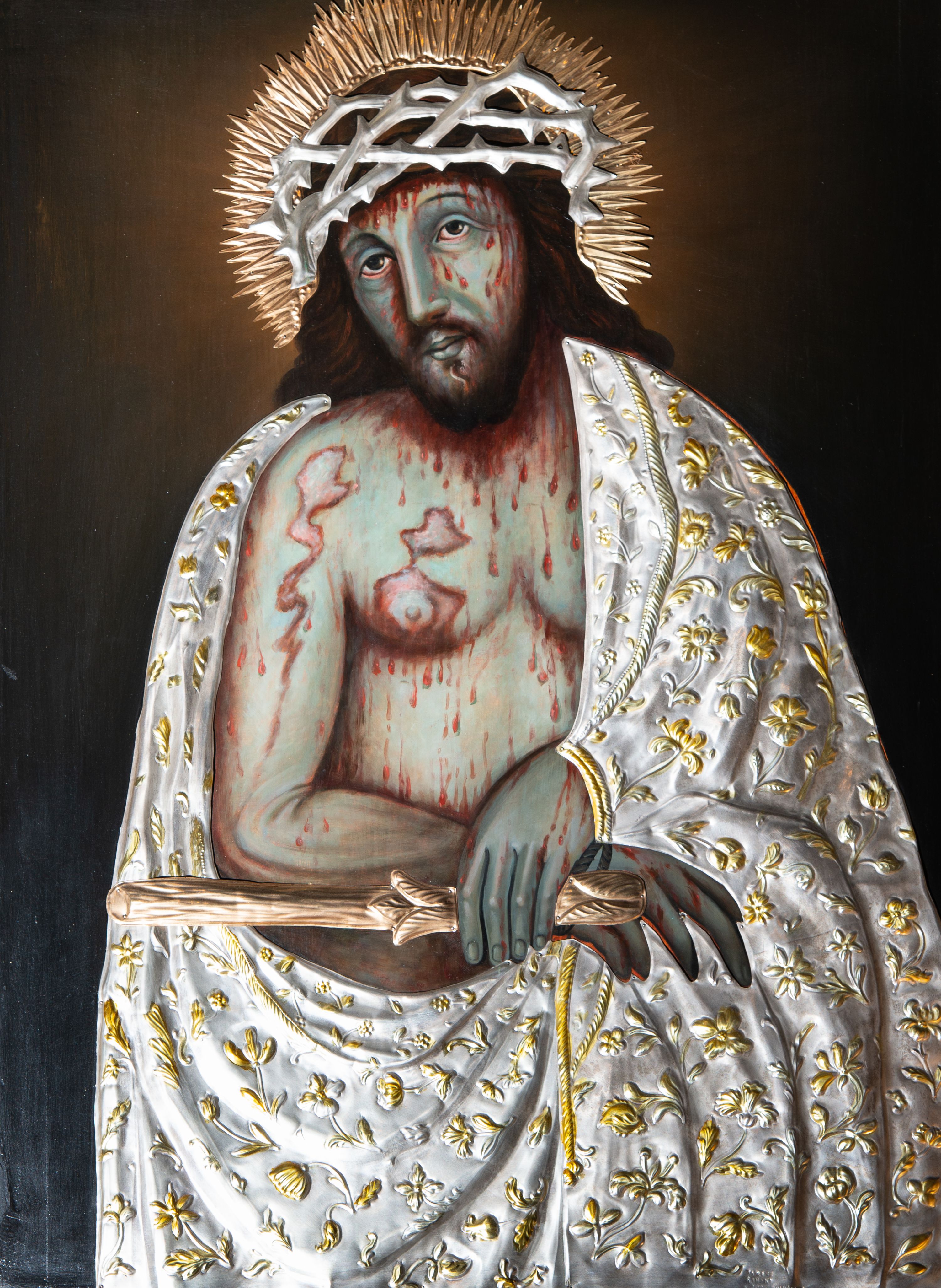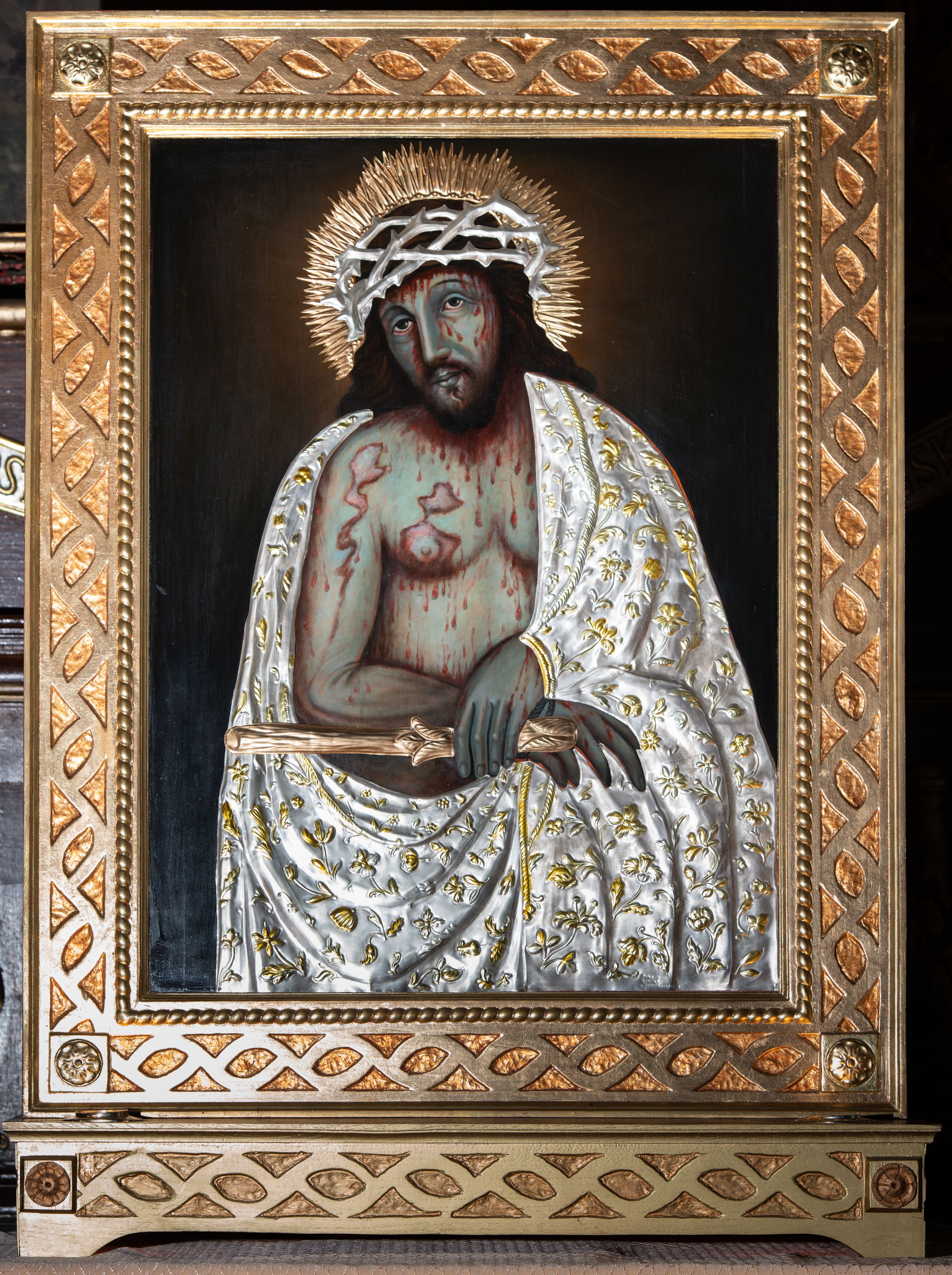 Obraz w kształcie stojącego prostokąta, w rzeźbionej złoconej ramie, na cokole, zdobionej uproszczonym motywem korony cierniowej, z rozetami w narożach. Przedstawienie w półpostaci Chrystusa w typie Ecce Homo, z głową lekko przechyloną na prawe ramię, z przegubami rąk skrępowanymi sznurem i z trzciną w lewej dłoni. Nagi korpus ze schematycznie zaznaczoną muskulaturą i obfitymi plamami krwi okryty metalową srebrzystą sukienką ze złoconymi motywami roślinnymi. Na włosach metalowa ażurowa korona cierniowa upleciona z cienkich gałązek ciernia. Wokół głowy złocisty nimb promienisty. Tło ciemne monochromatyczne.